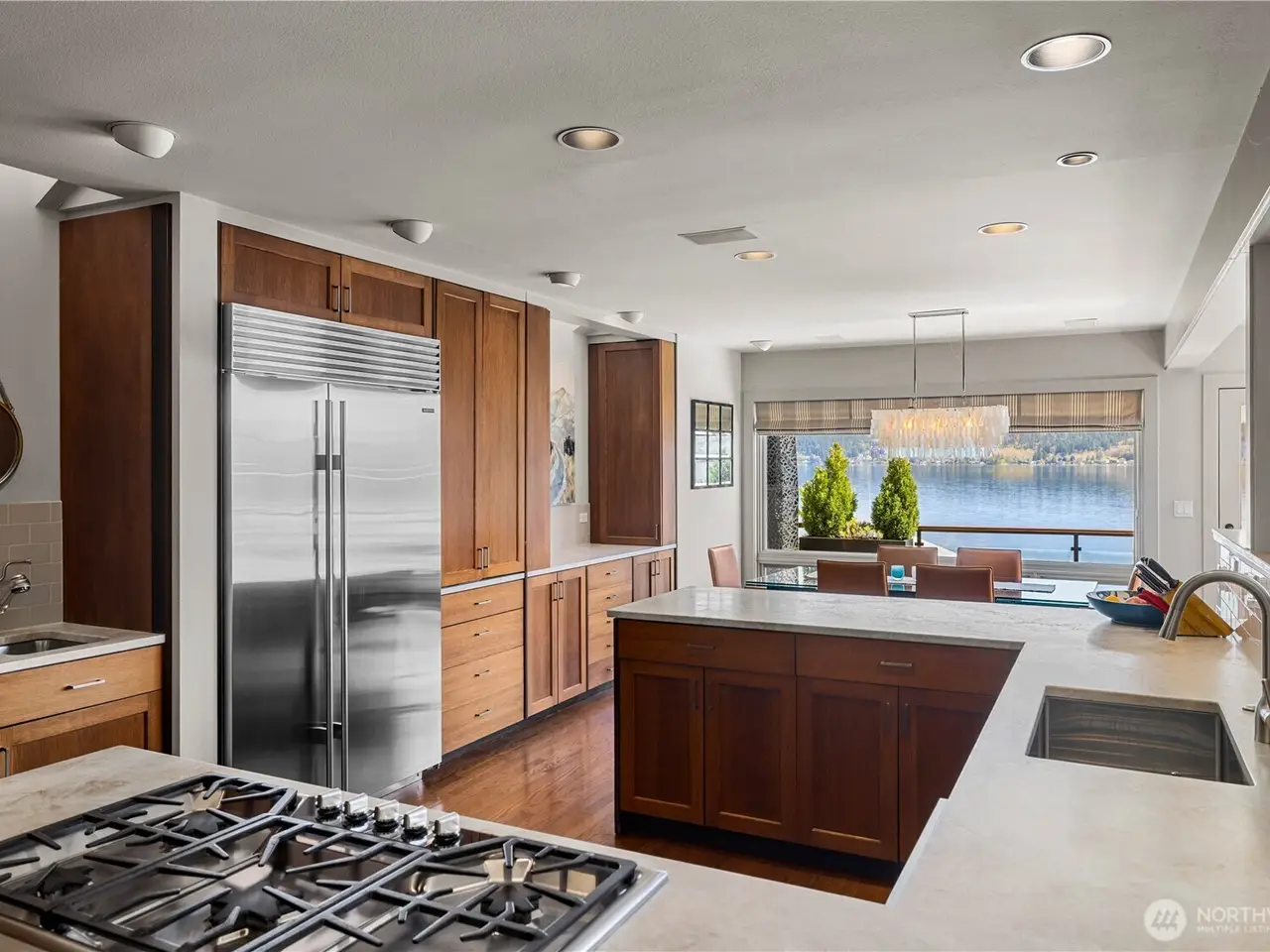 Tucked on a quiet lakeside lane with 90 feet of private Lake Sammamish shoreline, this NW contemporary retreat is a study in light, style, and serenity. Two-story windows and skylights fill the home with natural light, from the great room to the airy sunroom where lake breezes drift through the open NanaWall. Swim off the expansive dock, cast a line in the cove, or retreat to the cozy theater with wet bar. Evenings invite sunset dinners on the full-width deck, followed by a soak in the secluded hot tub tucked amidst lush landscaping. Upstairs, the serene primary suite offers storm-watching solitude and sweeping views. Extensively updated and thoughtfully designed - with rare 8-car parking - this is active waterfront living, beautifully refined.