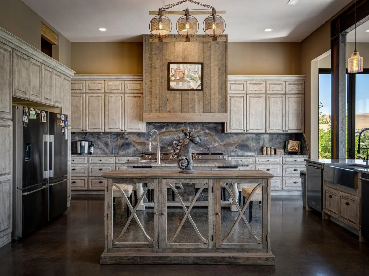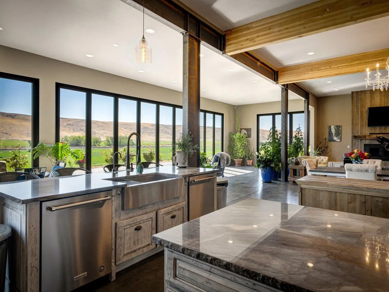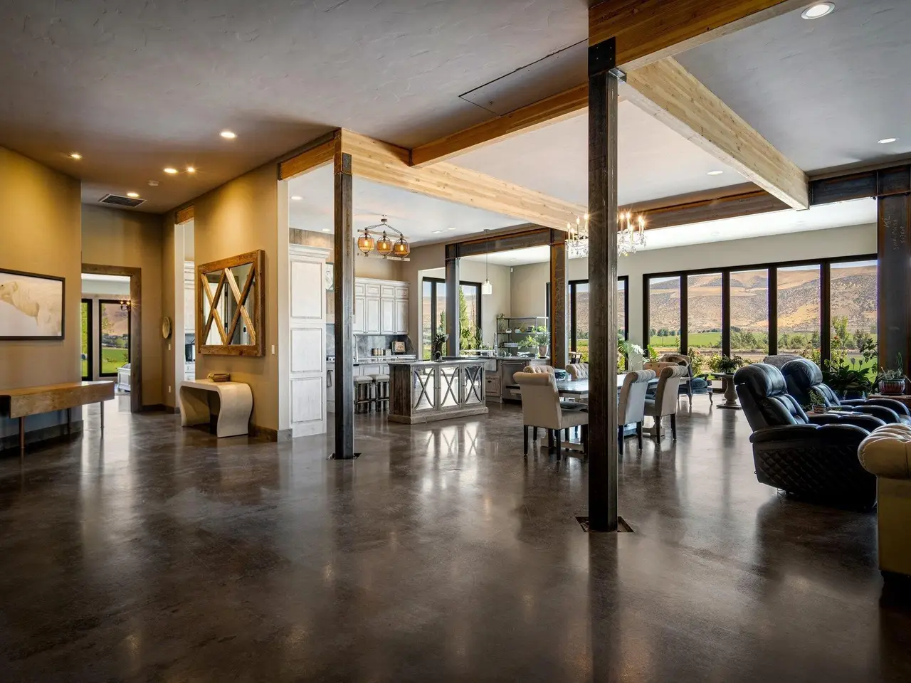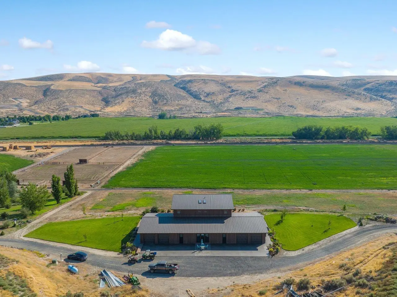 Embrace the rustic charm of country living on this expansive view property that encapsulates the heart and soul of farm life. A span of approximately 46 acres offers both a haven for a myriad of farming and equestrian pursuits, and luxurious countryside dwelling. Surrounded by unparalleled 360-degree views of Badger Canyon is the 7,500 square foot estate home, exuding rustic elegance and offering a seamless blend of character and comfort. The main level spans 5,000 square feet, with an unfinished upper level adding another 2,500 square feet. Two separate two-car garages provide 1,250 square feet of automotive heaven. Unlock a world of indoor-outdoor living with over sixty linear feet of floor-to-ceiling glass panoramic doors and an expansive wrap-around concrete patio. Crafted from Montana Timber Products Ranchwood circle sawn cedar siding, the home effortlessly blends into the surrounding landscape. Step inside and discover the blend of natural elements and modern amenities that make this home so extraordinary. A custom Schonbek crystal chandelier suspended from the twelve-foot ceilings adds elegance and serenity, while the exposed timber and iron beams and hand-stained finished concrete flooring evoke a sense of timelessness and strength to the expansive open-concept design. The kitchen is a chef's dream, with custom soft-closed cabinetry and book-matched backsplash all topped with Brazilian Zumaia quartzite. A commanding seven-foot dual exhaust hood takes center stage, harmonizing with stonework and cabinetry. Designed for culinary enthusiasts and entertaining, the kitchen offers two of everything with dual islands, gas and electric ranges, dishwashers, and refrigerators, and can easily accommodate an entire family of chefs. Explore the 36'x72' workshop, featuring five bays including one pull-through, offering abundant space for diverse uses. Fully insulated and heated, with a RV water and electric hookup on site, and supported by two 200-amp service boxes. The land itself features 24 acres under a pivot, with ten acres in wheel lines, and an additional five acres in solid sets, all in alfalfa. At the heart of the farm, approximately three acres are a dedicated equine facility, featuring five-foot pressure treat and no-climb fencing, a 220'x210' watered riding arena, and a feed and tack shed. For the horses, there are two large turnout areas and four 50'x50' paddocks, each with water, electricity, and matted shelters. Make an appointment today to see the endless possibilities firsthand.