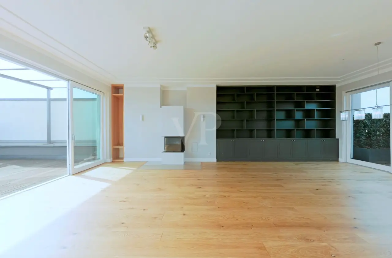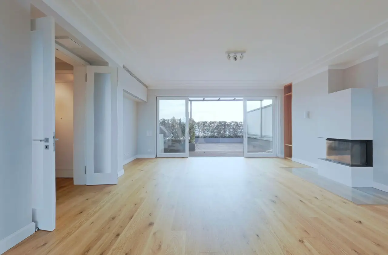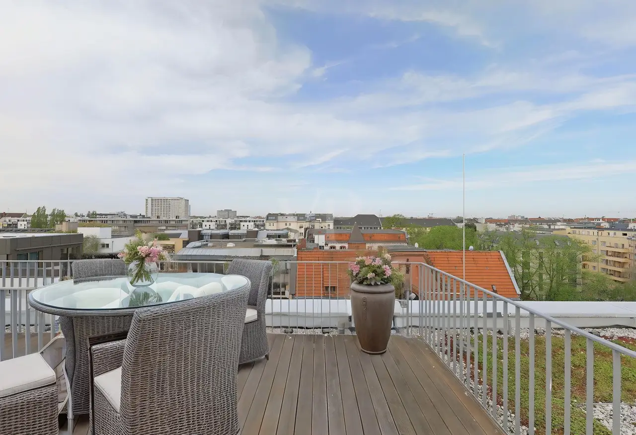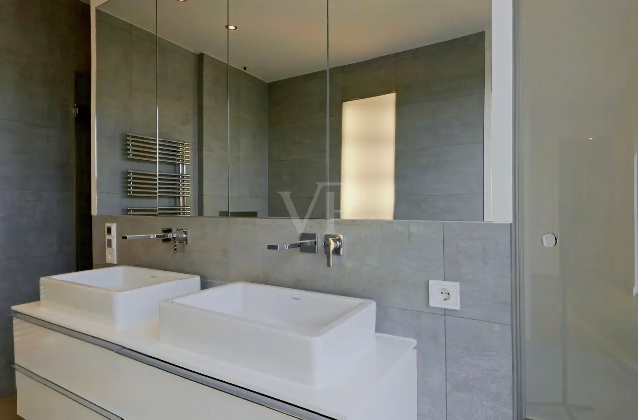This exclusive penthouse apartment offers a generous living space of approx. 224.56 m² and combines stylish design with luxurious furnishings. The property is finished to a high standard and offers an impressive room layout with a total of five rooms, including three spacious bedrooms, which provide ample space for individual living concepts. It is particularly worth mentioning that you enjoy special privacy here - the two upper floors of the building are used exclusively by you. There are also no direct neighbors on the roof terrace level. The living area has a high-quality parquet floor, which gives the rooms an elegant atmosphere. The walls are plastered, creating a modern and clean look. Built-in wardrobes provide additional storage space and underline the practical design of the apartment. The apartment's two bathrooms are exclusively equipped and offer a place for rest and relaxation. High-quality materials and modern fittings characterize the picture and raise living comfort to a new level. A particular highlight of the penthouse apartment are the secluded, wrap-around terraces, which not only offer plenty of additional outdoor space, but also open up flexible usage options. An outdoor kitchen on the terrace allows you to prepare meals in the open air, ideal for social gatherings with friends and family. Another plus point is the sauna on the terrace, which offers you the opportunity to recover from the stresses of everyday life and relax in a private atmosphere all year round. This property is ideal for those looking for a combination of stylish interiors and practical outdoor spaces. The spatial layout and high-quality fittings make this penthouse apartment a special offer on the market. It offers ample space and design options for families as well as couples or individuals looking for a special living experience. A parking space in the underground garage and separate bicycle parking spaces in the garden area complete the offer. Please contact us for further information or to arrange a viewing.