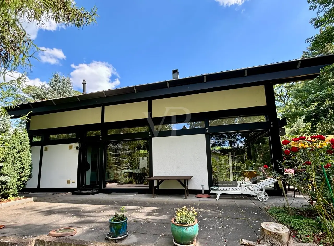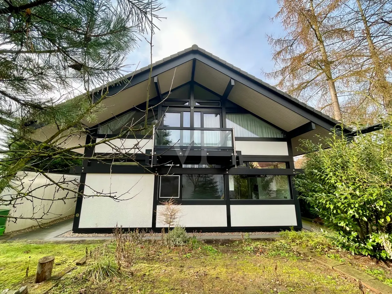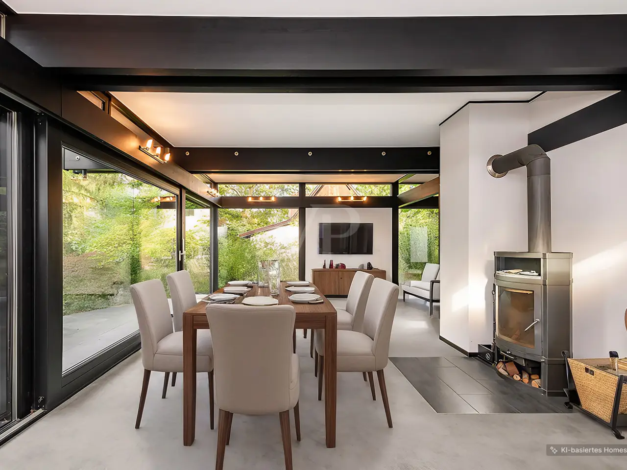 This property on offer here is a HUF HAUS, an impressive post-and-beam construction that impresses with its characteristic timber-and-glass design. This modern timber frame construction impresses with its large glass surfaces, which not only provide a bright and friendly atmosphere, but also create a close connection to the surrounding nature. A spacious hallway leads to the bright first floor of the property. The spacious dining and living area with access to two generous terraces forms the heart of this floor. A wood-burning stove from 2005 provides a cozy warmth on cool evenings and underlines the living comfort. Adjacent is a modern branded fitted kitchen that leaves nothing to be desired. A study or guest room and a shower room complete the first floor. An open gallery awaits us on the upper floor and invites us to linger. Two spacious rooms offer space for rest and relaxation. Particularly noteworthy are the two balconies, which offer you a variety of opportunities to enjoy the sun or relax outdoors. A stylishly designed bathroom, which perfectly combines functionality and design and is accessible from two sides, completes this floor perfectly. The spacious full basement is partially heated and offers additional storage space as well as versatile usage options. The house is also technically state of the art. A modern condensing boiler from 2020 ensures efficient heating performance. Electric shutters on the first floor offer additional comfort and security. The property has a solid garage with an electric door, which offers plenty of space for your vehicle, and there is also a separate parking space. The entrance to the property is secured by an electric gate, which harmoniously rounds off the overall appearance of the property. The spacious garden with mature trees offers plenty of space for relaxation and leisure activities. Both a well and a rainwater cistern are available for cost-saving irrigation and ensure a sustainable water supply. This HUF HAUS combines stylish architecture with modern technology and high-quality fittings. It offers a unique quality of living in a sought-after location, ideal for people who are looking for something special.