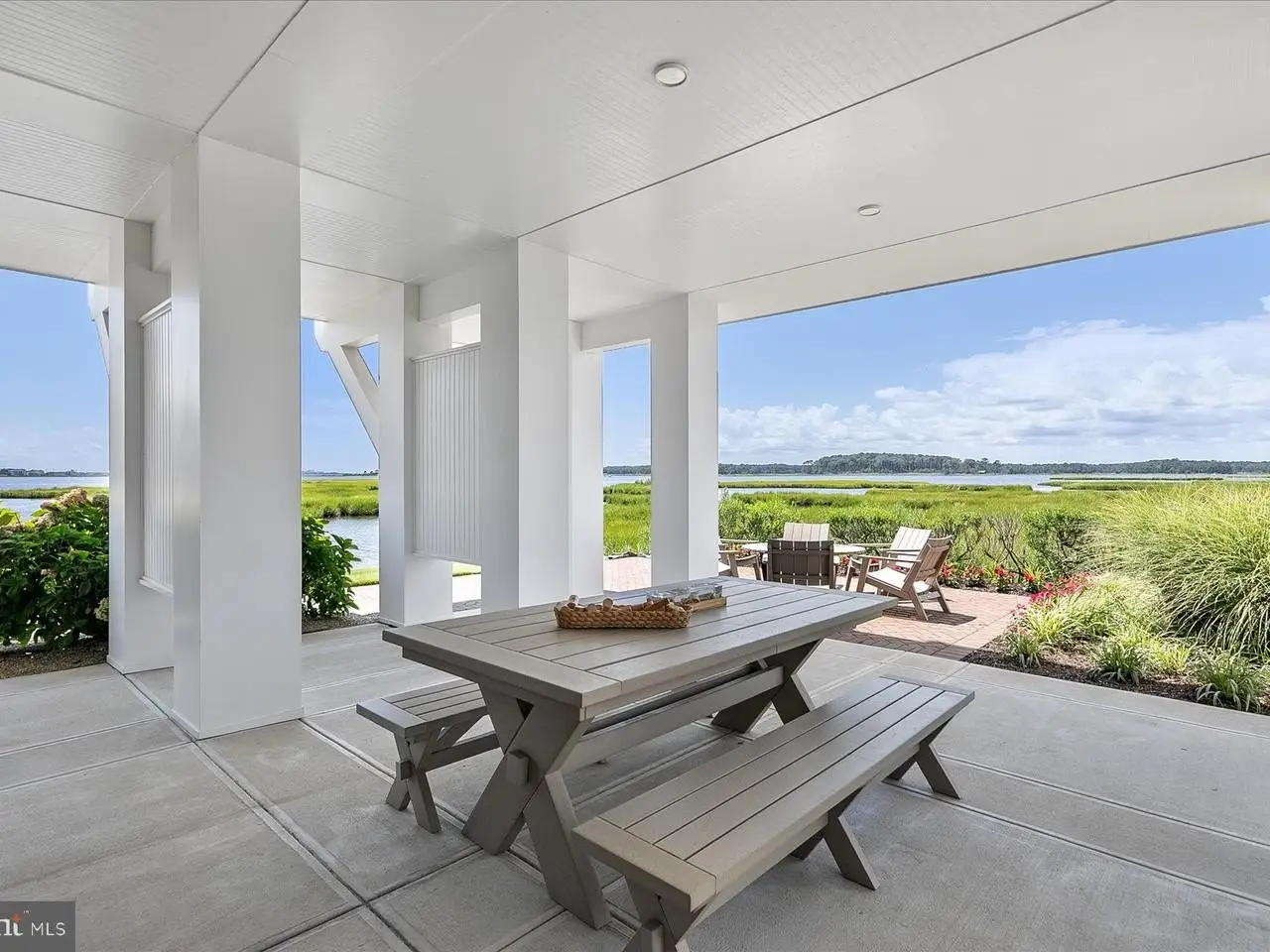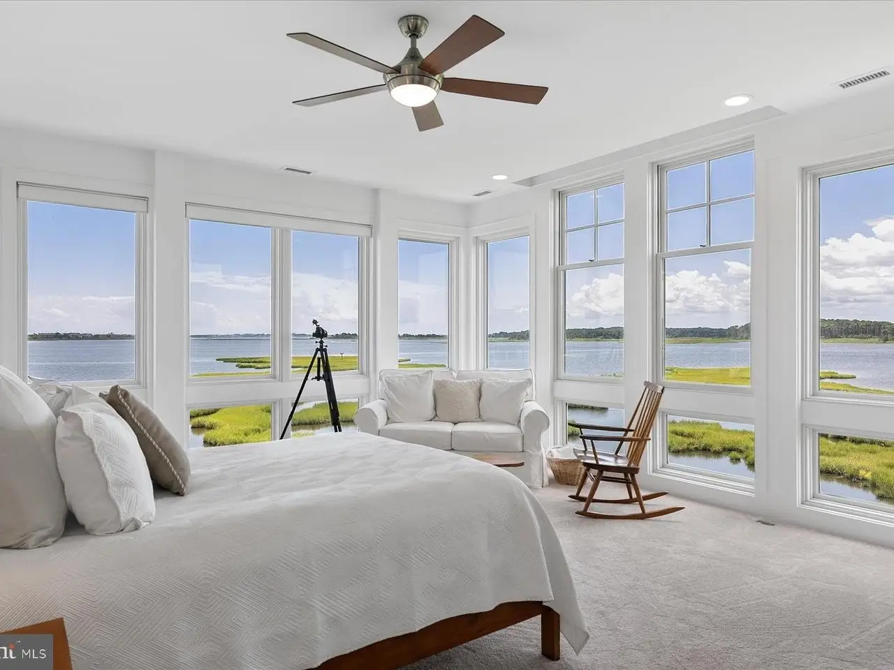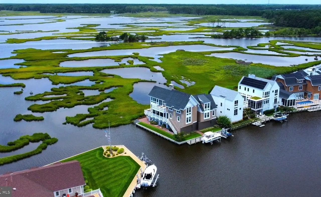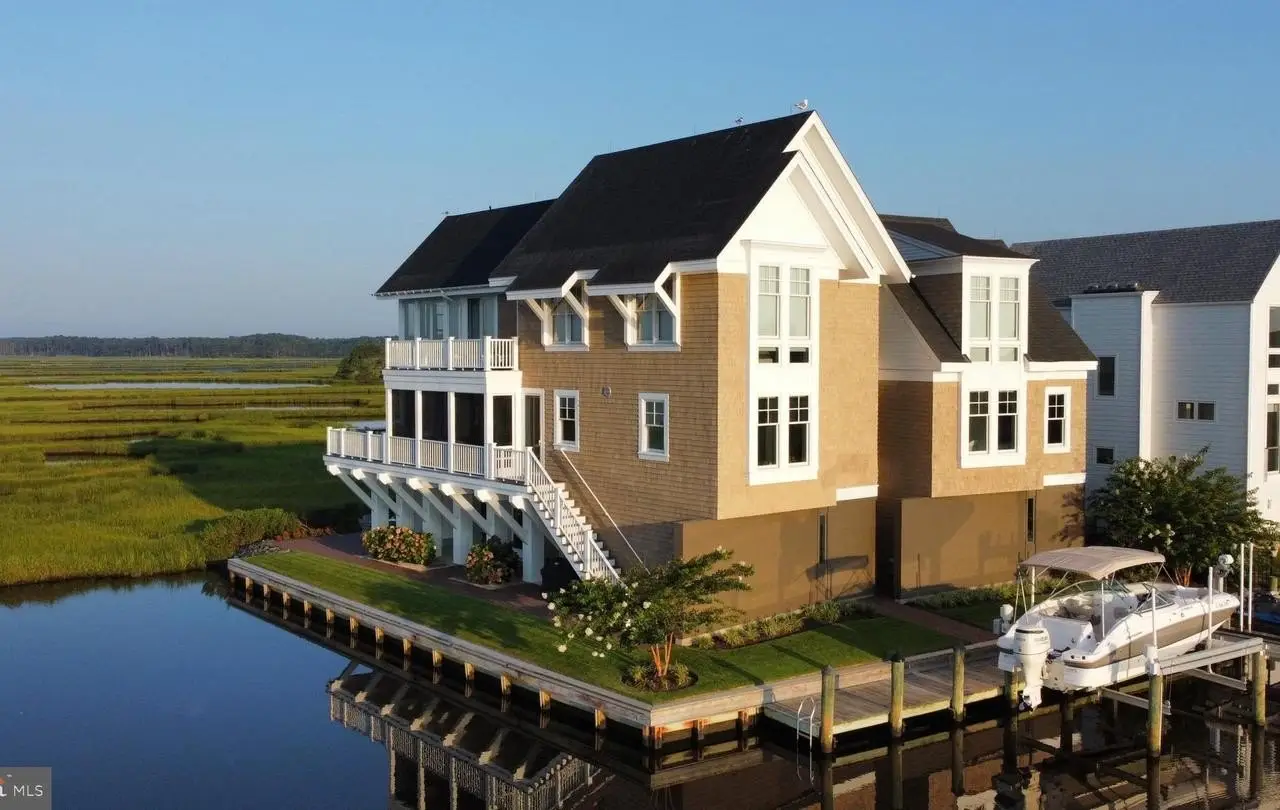 Take in unparalleled panoramic bay views from every room of this sophisticated modern beach home, ideally located on one of the most sought-after bayfront properties with water on three sides of the home. Complete with a private 50-foot dock, boat lift, and double jet ski lift, this exceptional residence was impressively designed, featuring high-end finishes and craftsmanship throughout. The expansive great room, with floor-to-ceiling windows on two sides, effortlessly frames sweeping views of the water and seamlessly blends the living, dining, and gourmet kitchen spaces. A large work island, bar with seating, and premium appliances elevate this culinary and entertaining space with easy access to a screened porch and open deck with views that are unable to be duplicated. The main level also offers a cozy family room, two guest bedrooms, and a full bathroom, along with a convenient powder room for guests. Upstairs, the bayfront primary suite is a tranquil retreat with its own private waterfront deck. Three generously-sized guest rooms each feature en-suite bathrooms, ensuring ample space and privacy for visitors. On the ground level, a spacious workshop and covered patio provide the perfect setting for crab feasts and relaxation, while the brick paver patio offers an ideal spot for evening bonfires by the water. The outdoor shower with a changing area makes clean-ups after a day on the beach or boat a breeze, and a two-car garage plus second one-car garage provide ample storage and convenience for all your vehicles, beach gear, kayaks, canoes, boating accessories, and bikes. Additional highlights include an elevator shaft for future conversion, geothermal hvac, and a location that's impossible to duplicate-situated on a peninsula with sweeping views of the bay and wetlands, yet just moments from the beach. Homes of this caliber, in such a prime location, are a rare offering.