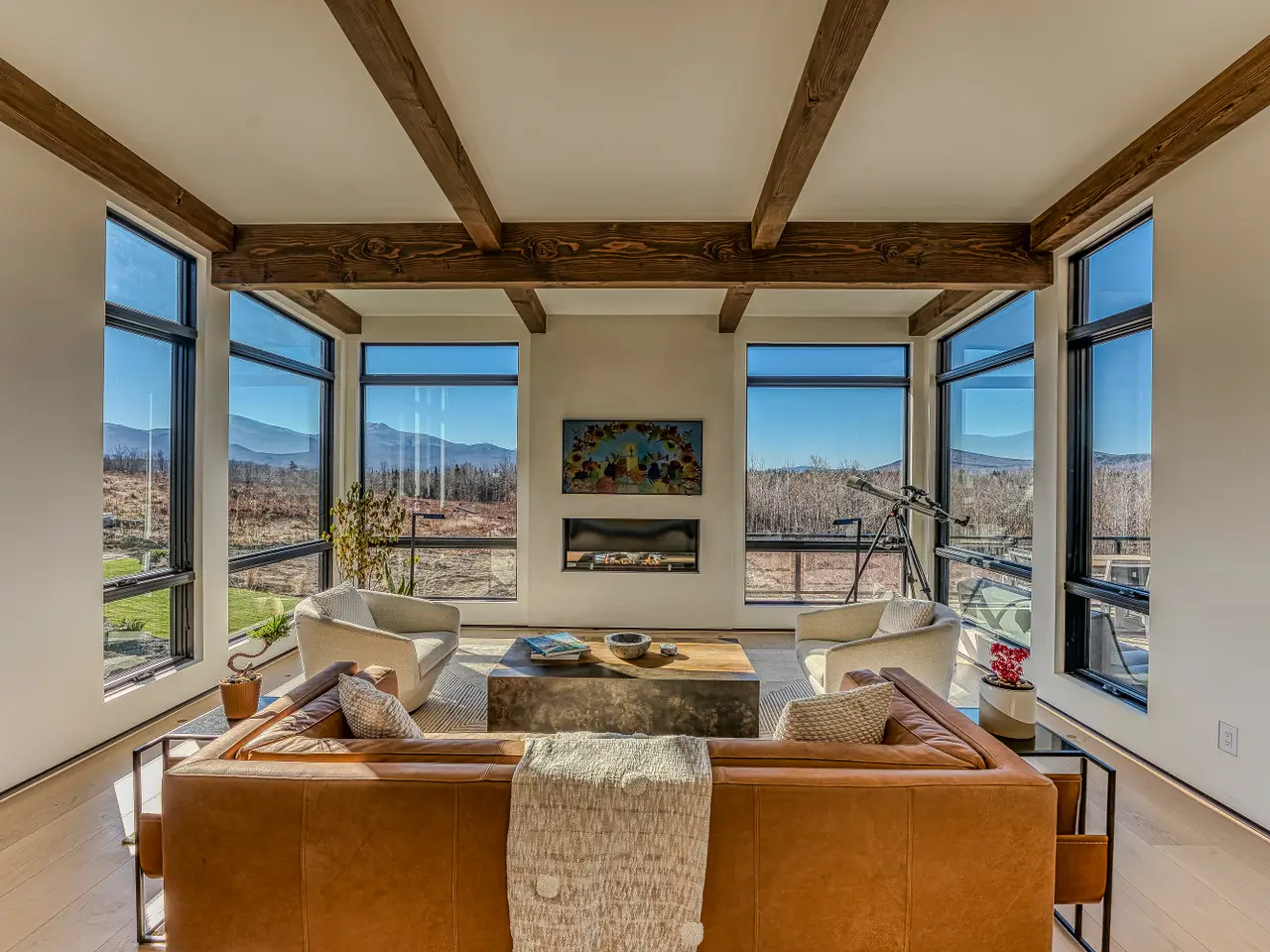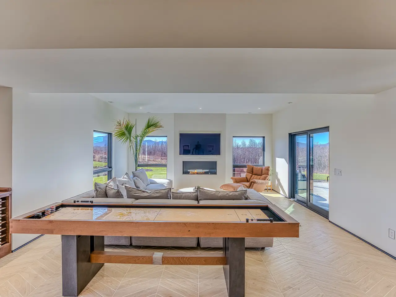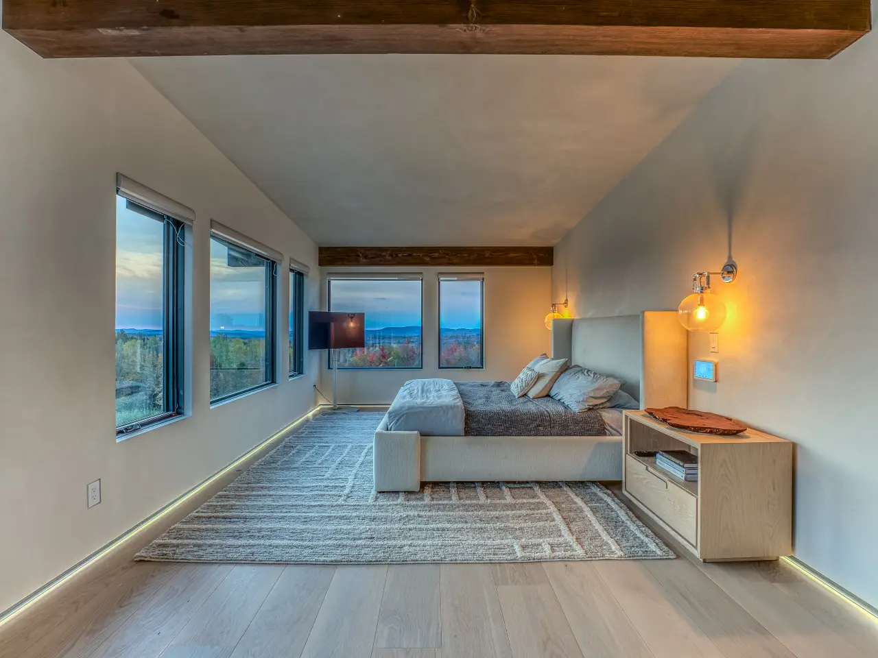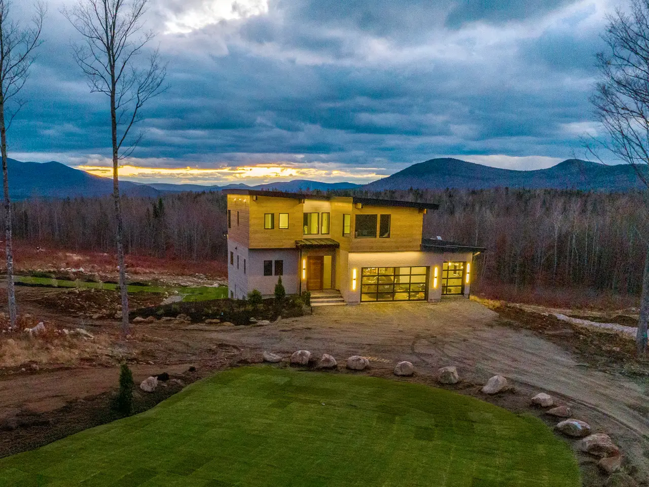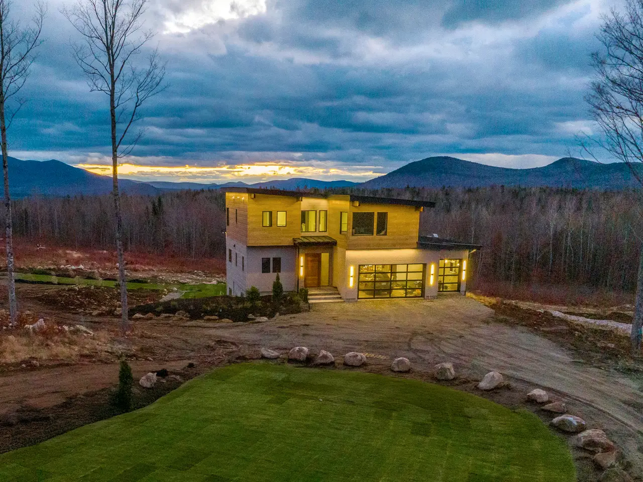 Located in the famed Ledgewood Subdivision, this modern Yankee Barn Home is both architecturally inspired and technologically innovative. Experience some of the finest sunsets in the north country, painted amongst a backdrop of Cannon and Lafayette Mountains into the rolling hills of Vermont. Every detail has been thoughtfully considered, from the finest materials to cutting-edge smart home technology. The use of materials such as tadelakt, lime plasters, clay, wood, quartz, and ceramic seamlessly blends the indoors with the outdoors, while being illuminated by in-wall linear LED lighting. Custom cabinetry from Germany and a Thermador appliance suite form the foundation of the open-concept, luxurious chef's kitchen. The primary bedroom and bath were expertly designed to accommodate the southwesterly-facing view, with large picture windows that give the sense of being perched among nature. Two additional bedrooms and a full bath are featured on the second level, as well as a built-in walnut desk. All the closets in the home were designed by California Closets, showcasing efficiency and luxury. The lower level features an exercise area and living room, as well as a bedroom with a walk-in closet, a Balinese-inspired steam shower in the bathroom and built-in full over full bunk beds. The home has been given an EnergyStar certification, features geothermal heating/cooling and has two bioethanol fireplaces for ambiance and warmth. Broker-owned.