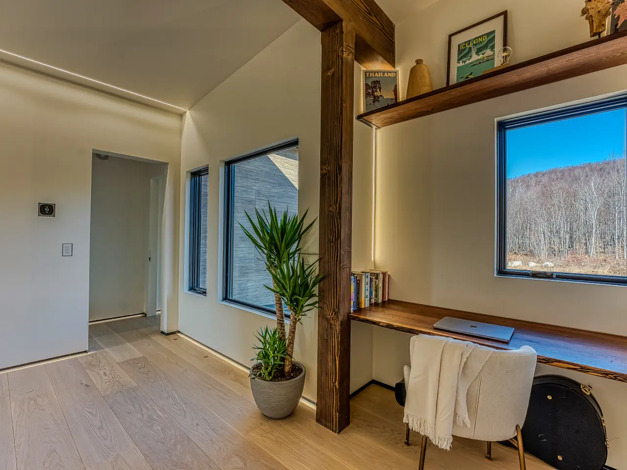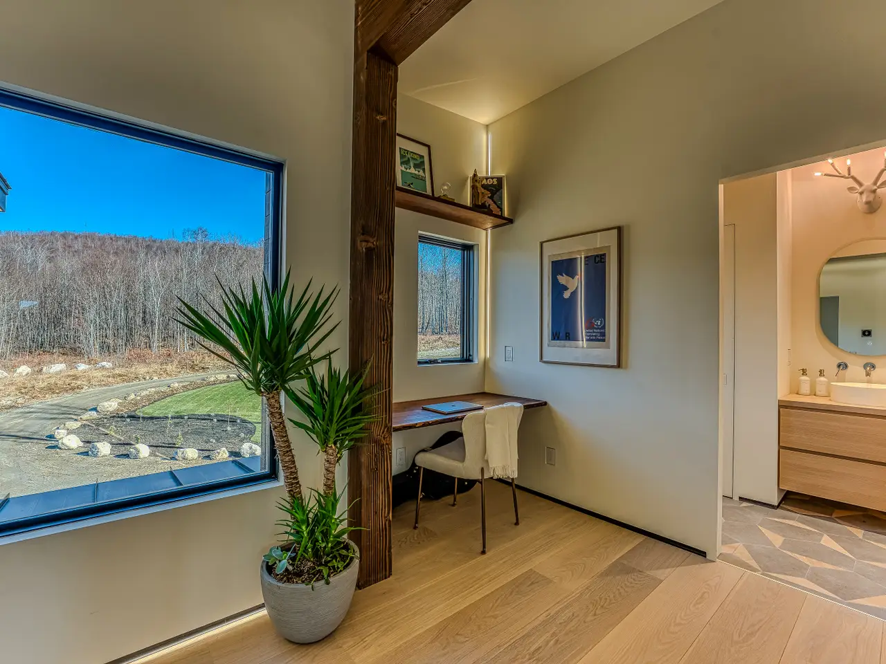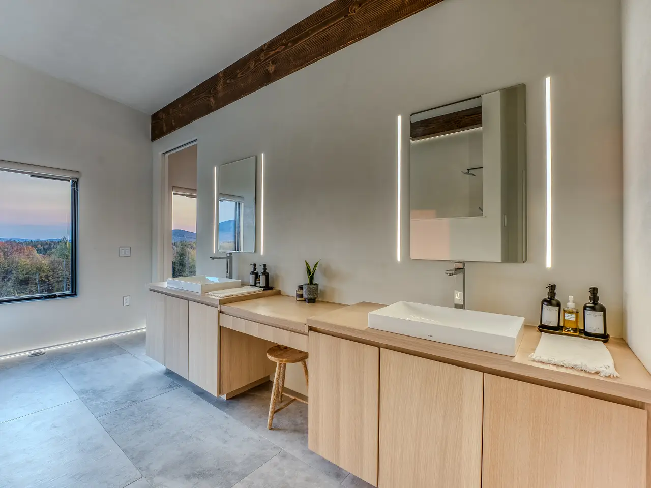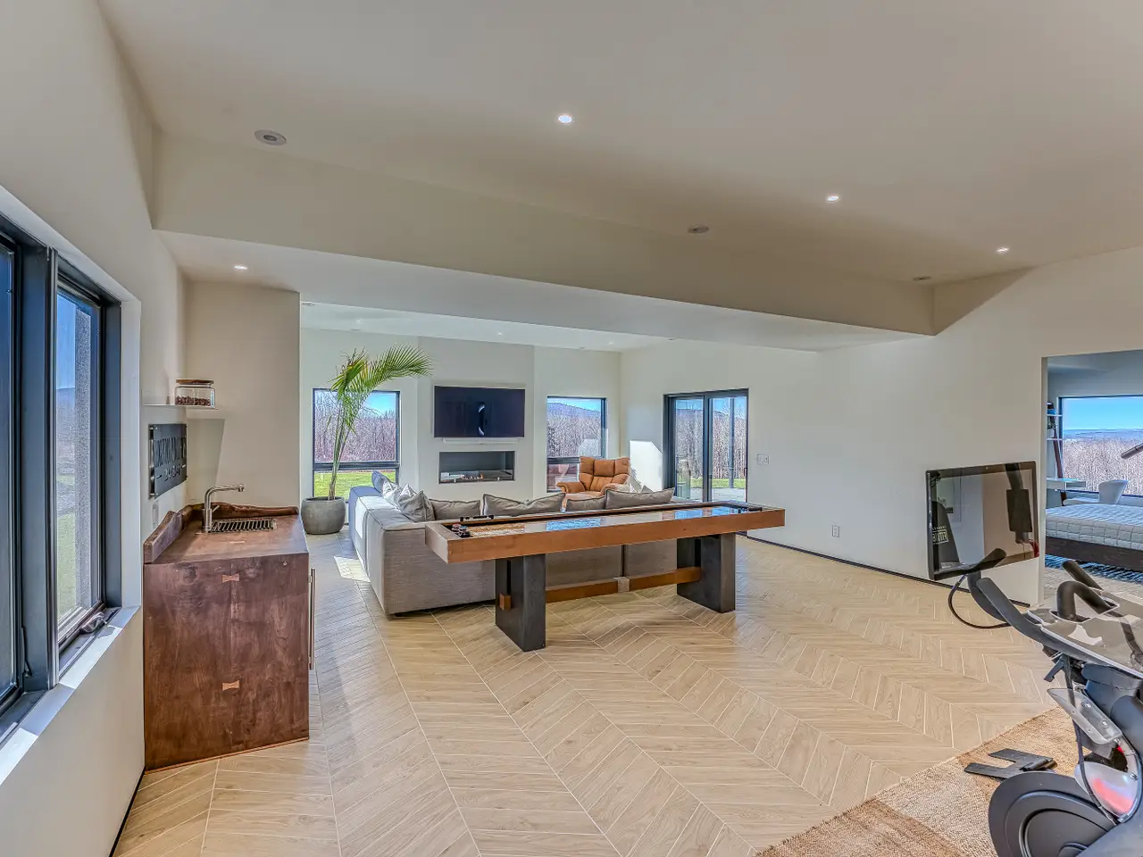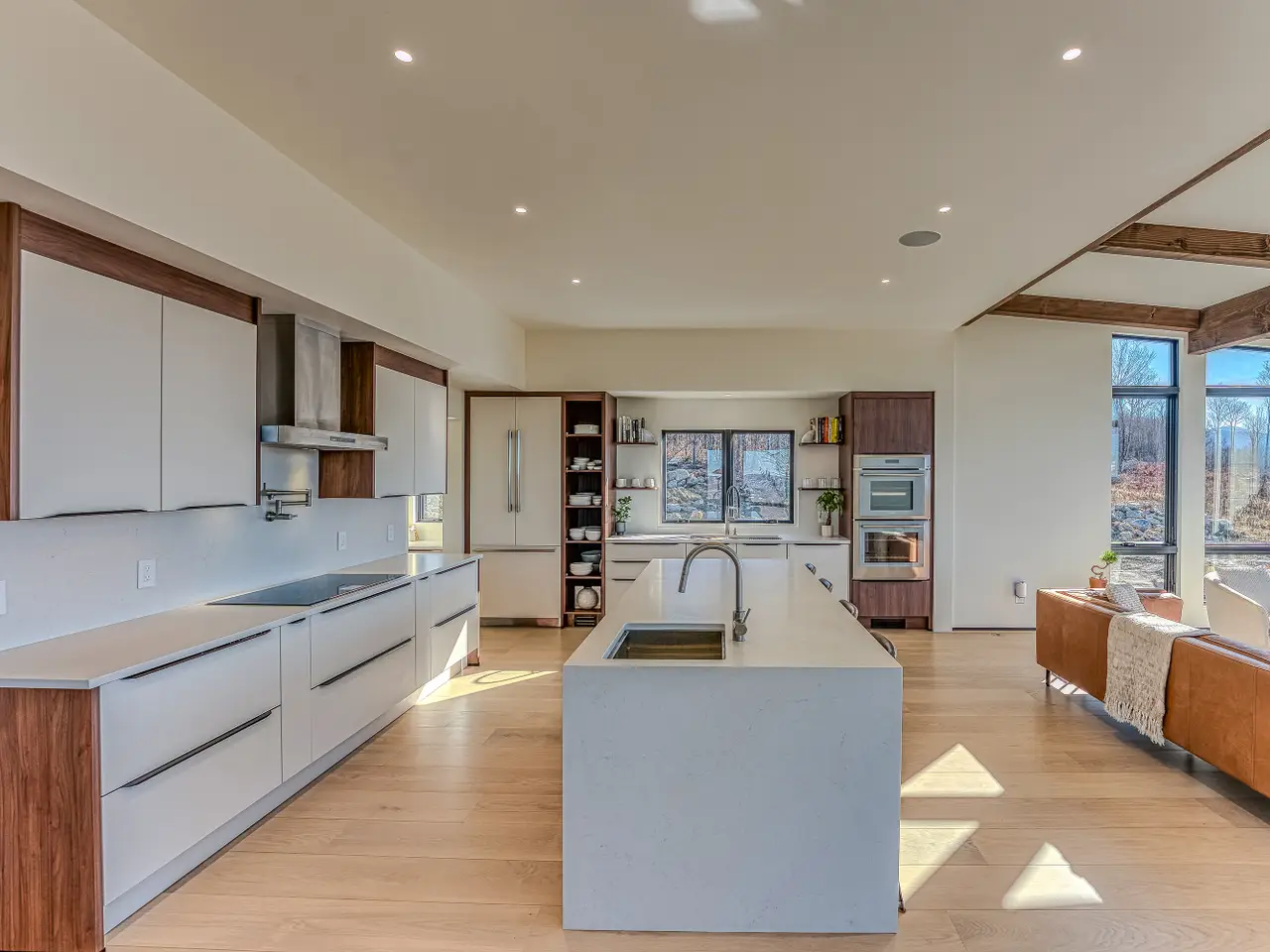 Located in the famed Ledgewood Subdivision, this modern Yankee Barn Home is both architecturally inspired and technologically innovative. Experience some of the finest sunsets in the north country, painted amongst a backdrop of Cannon and Lafayette Mountains into the rolling hills of Vermont. Every detail has been thoughtfully considered, from the finest materials to cutting-edge smart home technology. The use of materials such as tadelakt, lime plasters, clay, wood, quartz, and ceramic seamlessly blends the indoors with the outdoors, while being illuminated by in-wall linear LED lighting. Custom cabinetry from Germany and a Thermador appliance suite form the foundation of the open-concept, luxurious chef's kitchen. The primary bedroom and bath were expertly designed to accommodate the southwesterly-facing view, with large picture windows that give the sense of being perched among nature. Two additional bedrooms and a full bath are featured on the second level, as well as a built-in walnut desk. All the closets in the home were designed by California Closets, showcasing efficiency and luxury. The lower level features an exercise area and living room, as well as a bedroom with a walk-in closet, a Balinese-inspired steam shower in the bathroom and built-in full over full bunk beds. The home has been given an EnergyStar certification, features geothermal heating/cooling and has two bioethanol fireplaces for ambiance and warmth. Broker-owned.