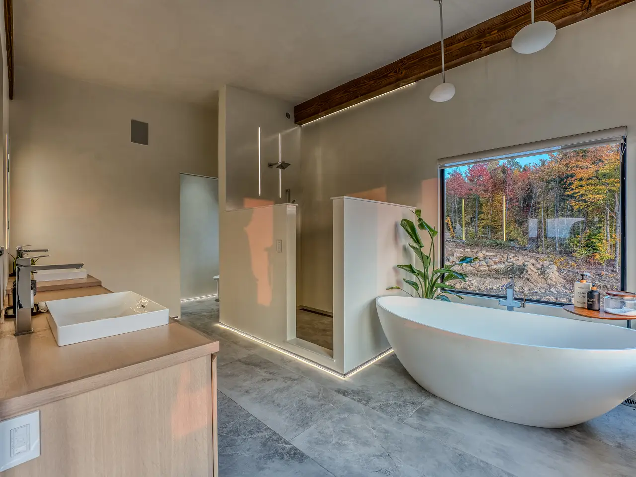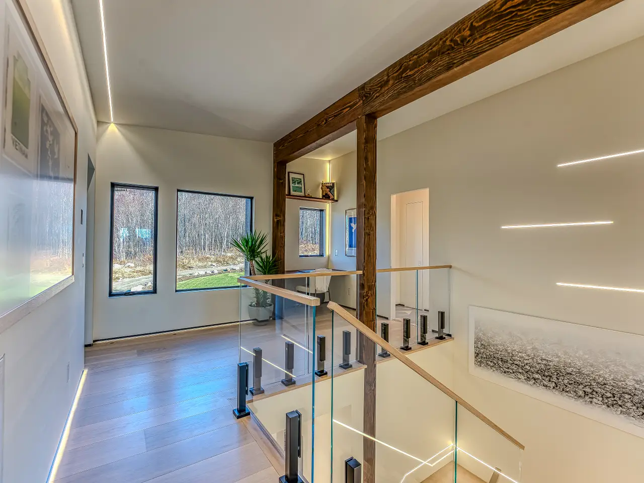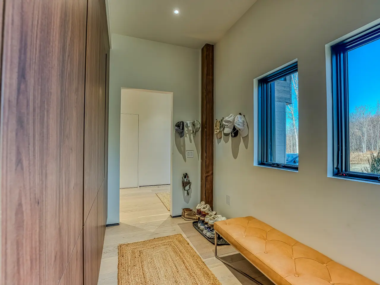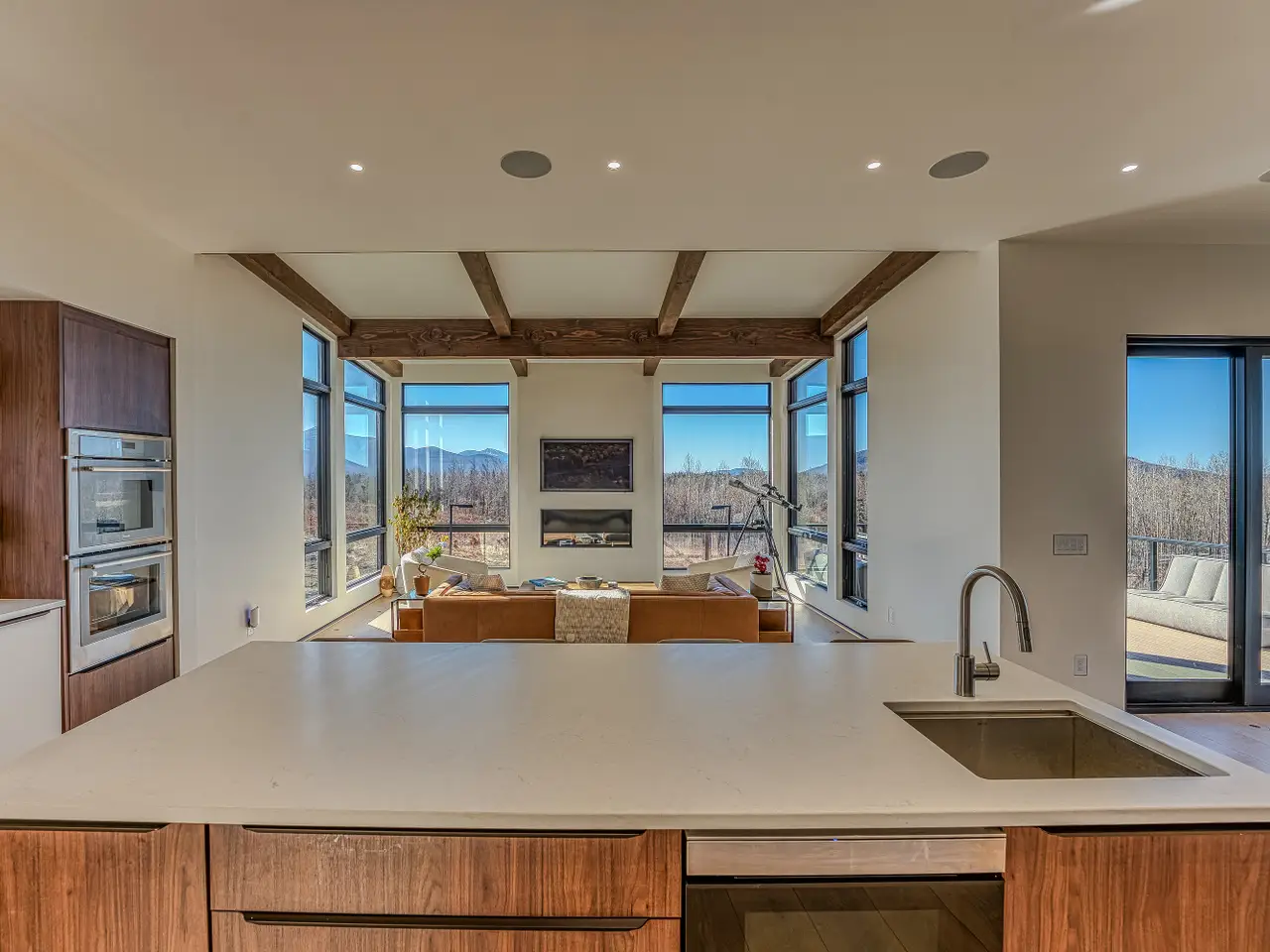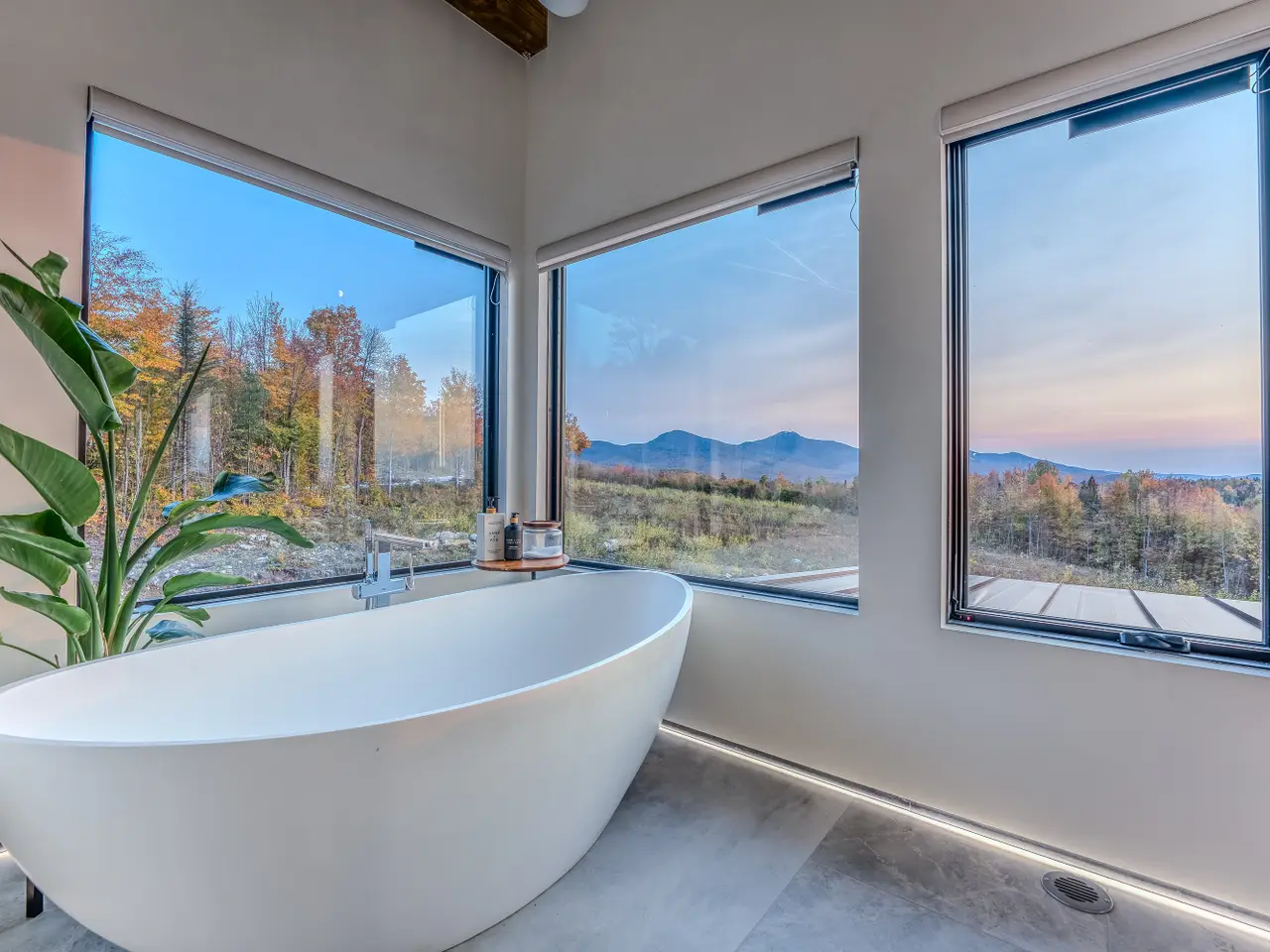 Located in the famed Ledgewood Subdivision, this modern Yankee Barn Home is both architecturally inspired and technologically innovative. Experience some of the finest sunsets in the north country, painted amongst a backdrop of Cannon and Lafayette Mountains into the rolling hills of Vermont. Every detail has been thoughtfully considered, from the finest materials to cutting-edge smart home technology. The use of materials such as tadelakt, lime plasters, clay, wood, quartz, and ceramic seamlessly blends the indoors with the outdoors, while being illuminated by in-wall linear LED lighting. Custom cabinetry from Germany and a Thermador appliance suite form the foundation of the open-concept, luxurious chef's kitchen. The primary bedroom and bath were expertly designed to accommodate the southwesterly-facing view, with large picture windows that give the sense of being perched among nature. Two additional bedrooms and a full bath are featured on the second level, as well as a built-in walnut desk. All the closets in the home were designed by California Closets, showcasing efficiency and luxury. The lower level features an exercise area and living room, as well as a bedroom with a walk-in closet, a Balinese-inspired steam shower in the bathroom and built-in full over full bunk beds. The home has been given an EnergyStar certification, features geothermal heating/cooling and has two bioethanol fireplaces for ambiance and warmth. Broker-owned.