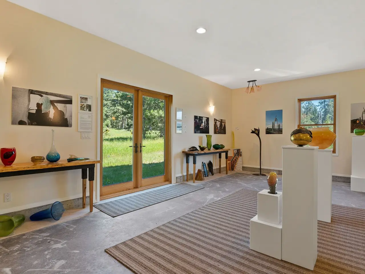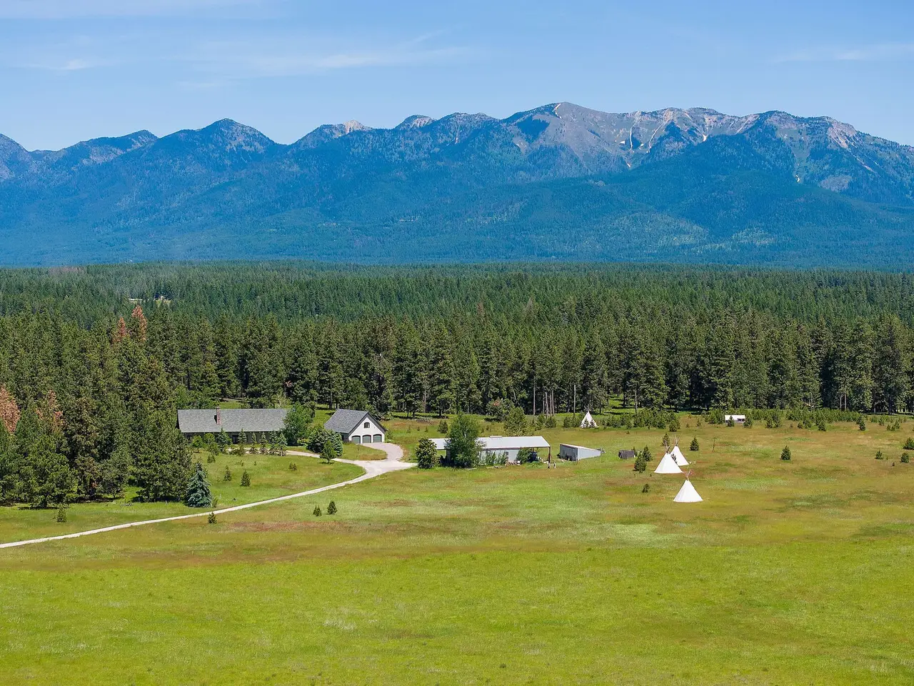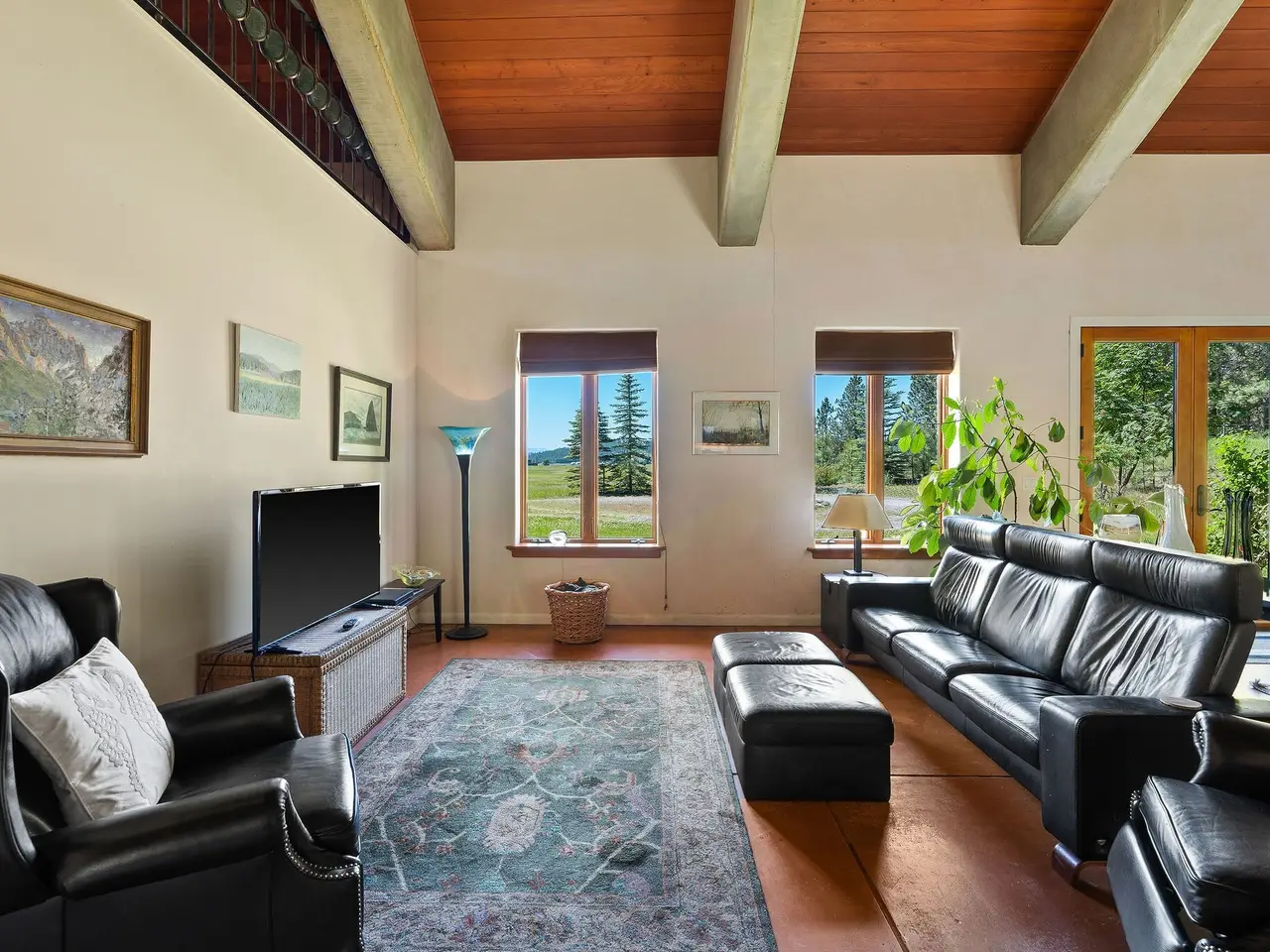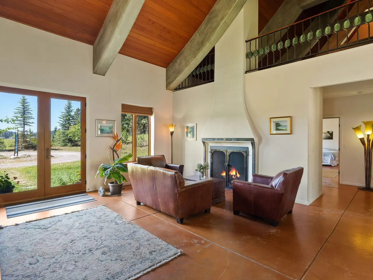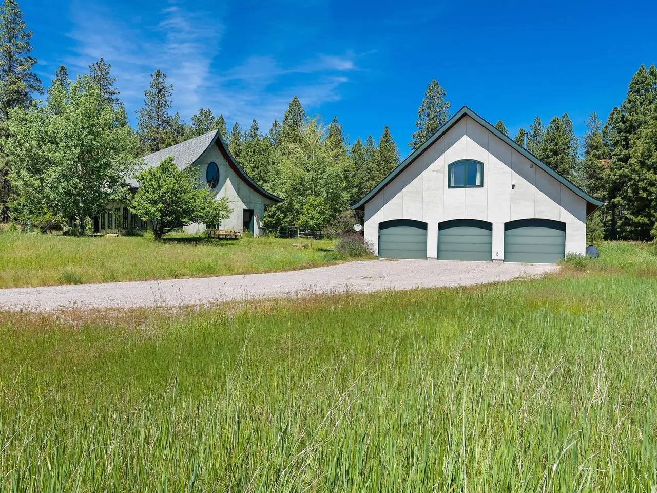This stunning concrete tilt-up home is set on a breathtaking 20-acre meadow property, offering a serene and tranquil atmosphere just minutes from downtown Bigfork. The exceptional architectural design features magnificent arched concrete beams that support the unique structure. Inside, the spacious great room includes three luxurious bedroom suites and two distinctive lofts, all showcasing spectacular views of the surrounding meadow and mountain range. A guest suite above the garage adds a fourth bedroom, complete with a full bath, mini kitchen and gas fireplace. Additional rooms on the ground floor provide versatile options for various uses. The property also boasts a fully functional 2,120-square-foot workshop garage, currently serving as a working artist studio. This one-of-a-kind home is truly a masterpiece.