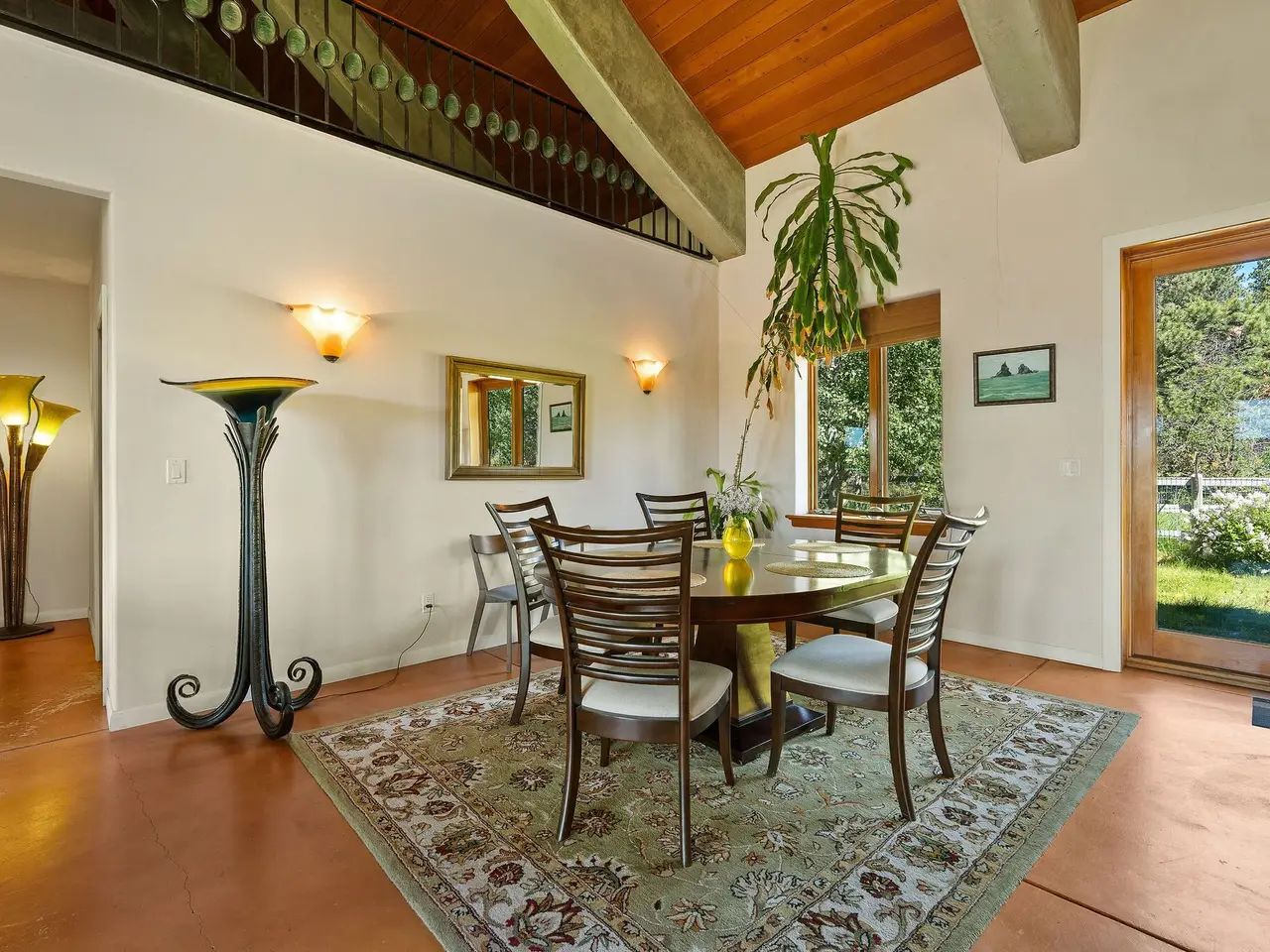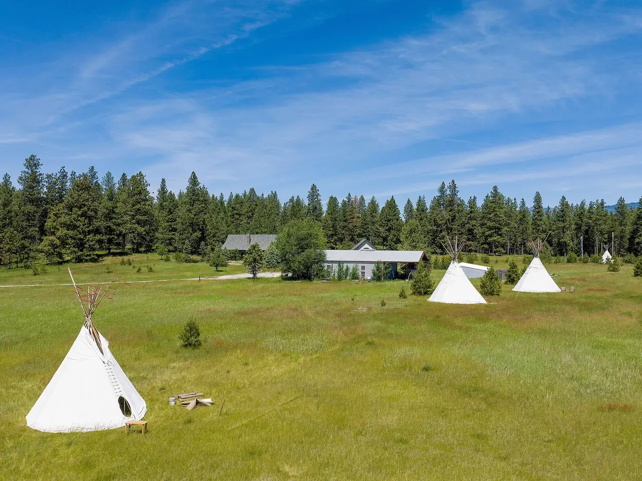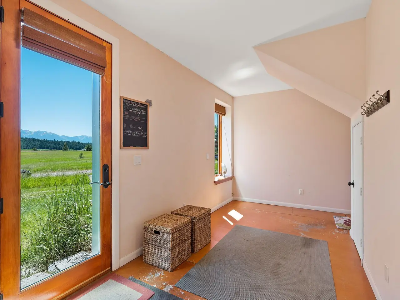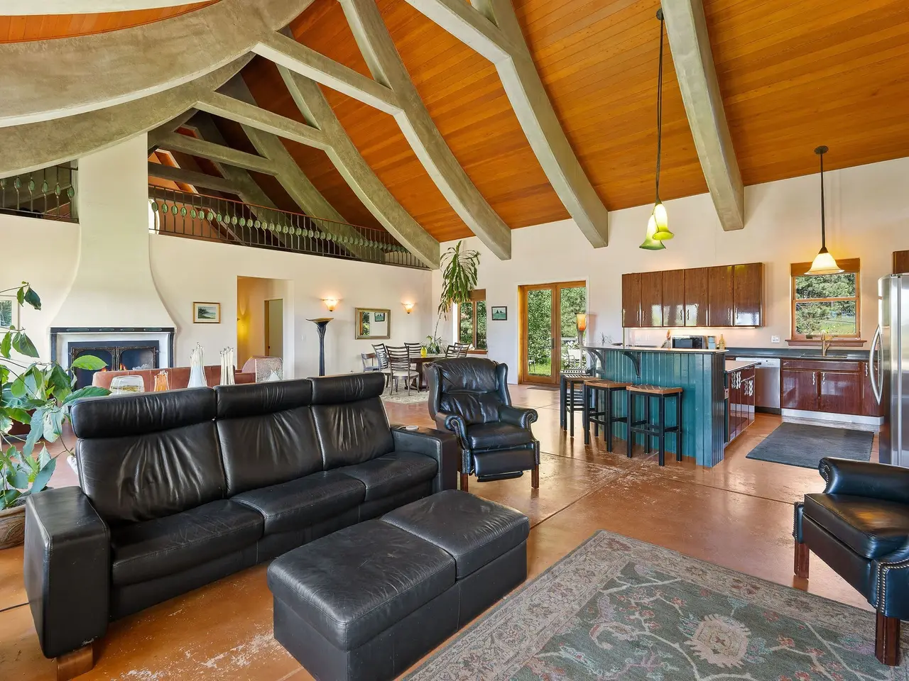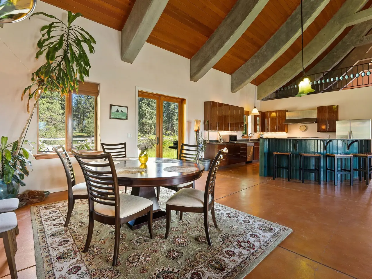 This stunning concrete tilt-up home is set on a breathtaking 20-acre meadow property, offering a serene and tranquil atmosphere just minutes from downtown Bigfork. The exceptional architectural design features magnificent arched concrete beams that support the unique structure. Inside, the spacious great room includes three luxurious bedroom suites and two distinctive lofts, all showcasing spectacular views of the surrounding meadow and mountain range. A guest suite above the garage adds a fourth bedroom, complete with a full bath, mini kitchen and gas fireplace. Additional rooms on the ground floor provide versatile options for various uses. The property also boasts a fully functional 2,120-square-foot workshop garage, currently serving as a working artist studio. This one-of-a-kind home is truly a masterpiece.