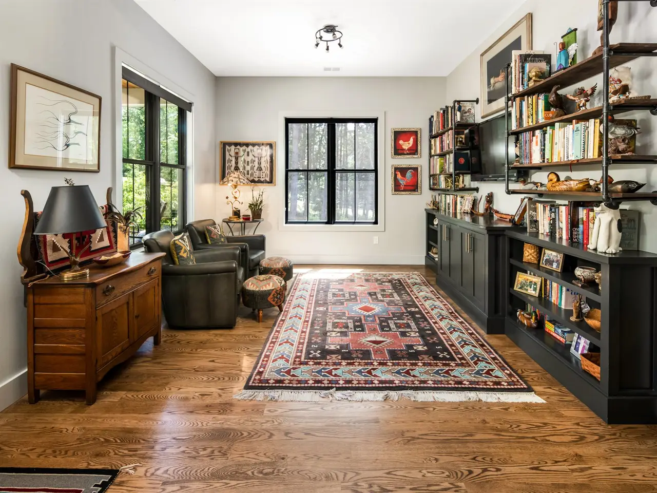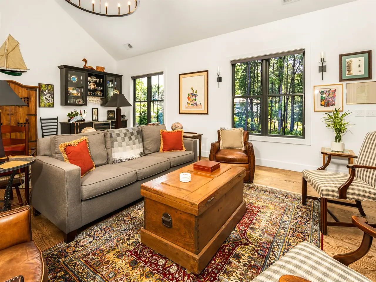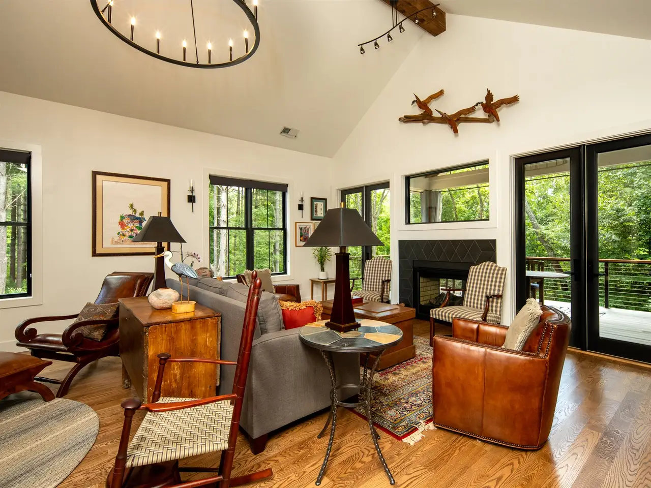 Open-concept great room with soaring ceilings