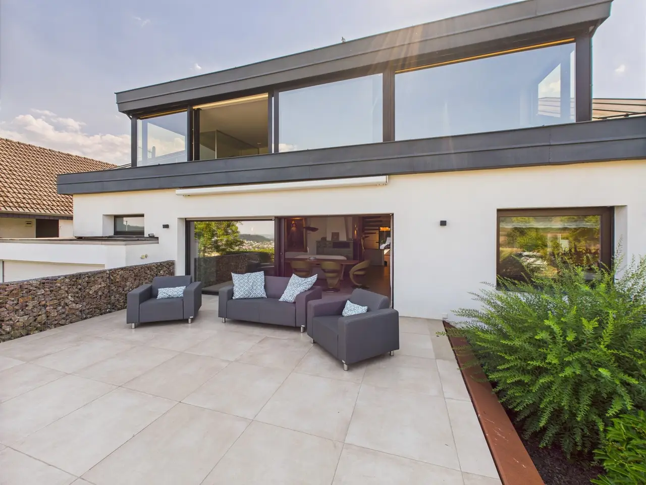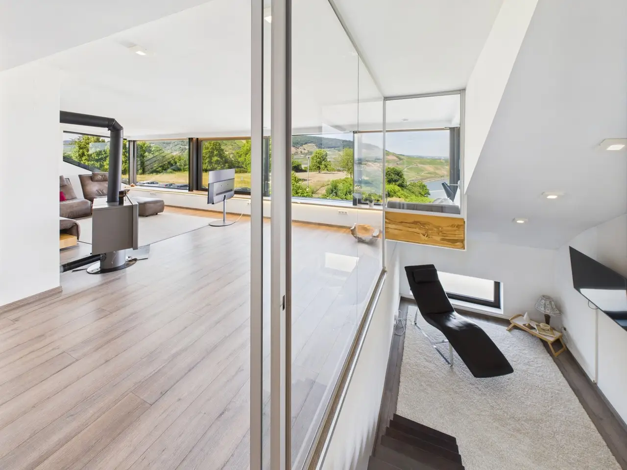 Welcome to your new home - a light-flooded property in a prime location in Bingen am Rhein. This stylish and well-kept house from 1974, which was extensively renovated in 2017, impresses with a successful combination of modern living comfort and spectacular panoramic views. Situated on a lovingly landscaped plot of approx. 778 m², the property offers a living space of approx. 351 m² and approx. 190 m² of usable space, spread over six generously proportioned rooms. The house is ideal as a family home and offers plenty of space for personal development. The inviting entrance area leads directly into the open-plan living and dining area, where a high-quality fitted kitchen offers space for culinary delights. The adjoining large window front with direct access to the terrace not only provides plenty of natural light, but also opens up a breathtaking view of the picturesque landscape of Bingen, the Rhine and, on a clear day, even as far as Frankfurt am Main. The first floor is complemented by a guest WC, two stylish bathrooms and two further well-designed rooms that can be used flexibly. A special highlight is the private relaxation and spa area, which invites you to enjoy relaxing moments within your own four walls. The adjoining terrace with sheltered garden area offers a peaceful outdoor retreat - ideal for lingering and enjoying. Another architectural highlight awaits you on the upper floor. Here you will find a spacious TV and relaxation room with a cozy fireplace corner and a light-flooded work area that extends across the entire Rhine front thanks to floor-to-ceiling windows. The open design of these rooms creates an inviting and versatile atmosphere - perfect for concentrated work, leisurely reading or relaxing. This level is completed by a daylight bathroom, a bedroom with dressing room and a direct view of the Rhine from the bed - an incomparable sight that will delight visual connoisseurs in particular. The house also offers generous possibilities in the basement. The rooms are spacious and offer ample storage space for hobbies, storage or housekeeping. A double garage and the parking spaces in front of it ensure maximum convenience in everyday life. The location of the property impresses with its quiet, mature neighborhood and at the same time its proximity to all important infrastructure such as schools, shopping facilities and public transport. This special property combines generous living space, modern facilities and a location that offers both tranquillity and proximity to urban life. If you are looking for a bright, spacious home with exceptional views and plenty of room for you and your family, then this house is just right for you. We would be happy to arrange a personal viewing so that you can see the benefits of this unique property for yourself.