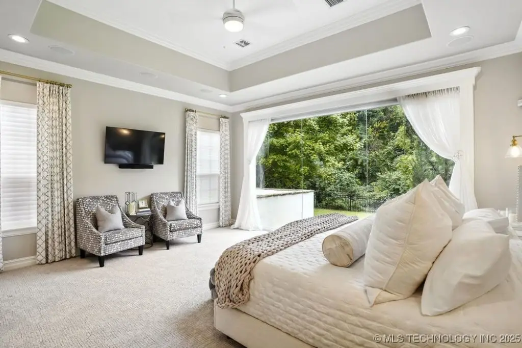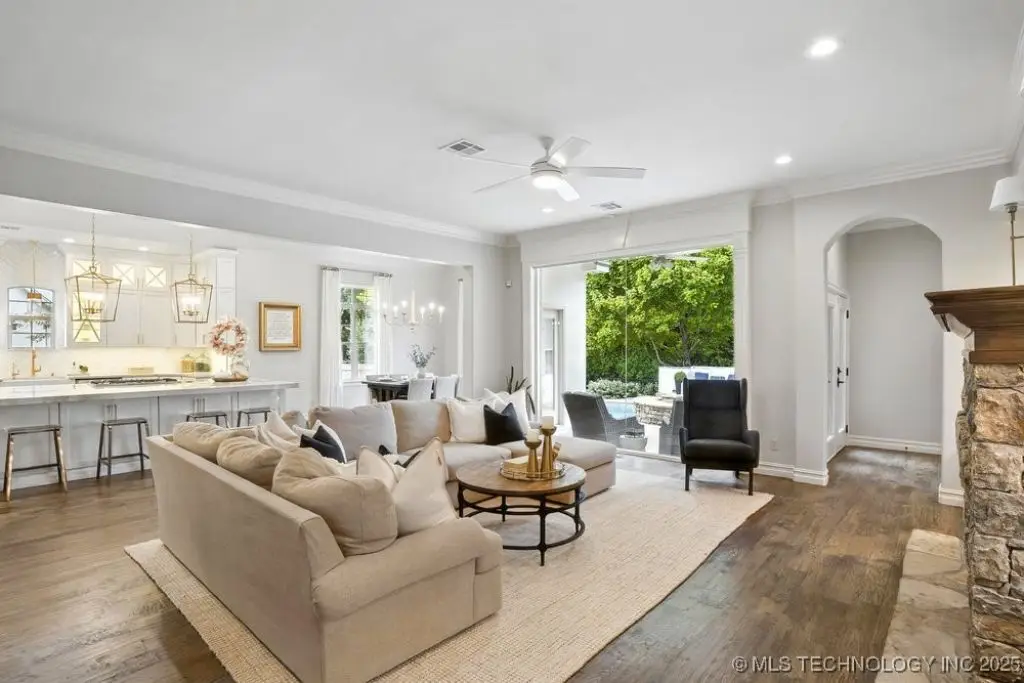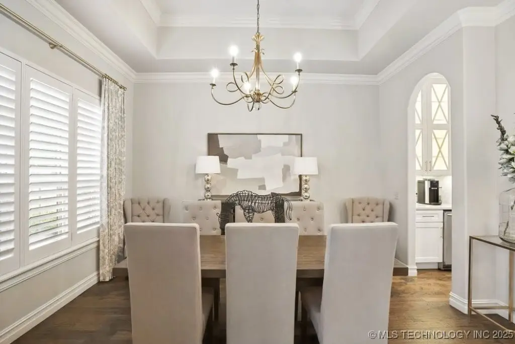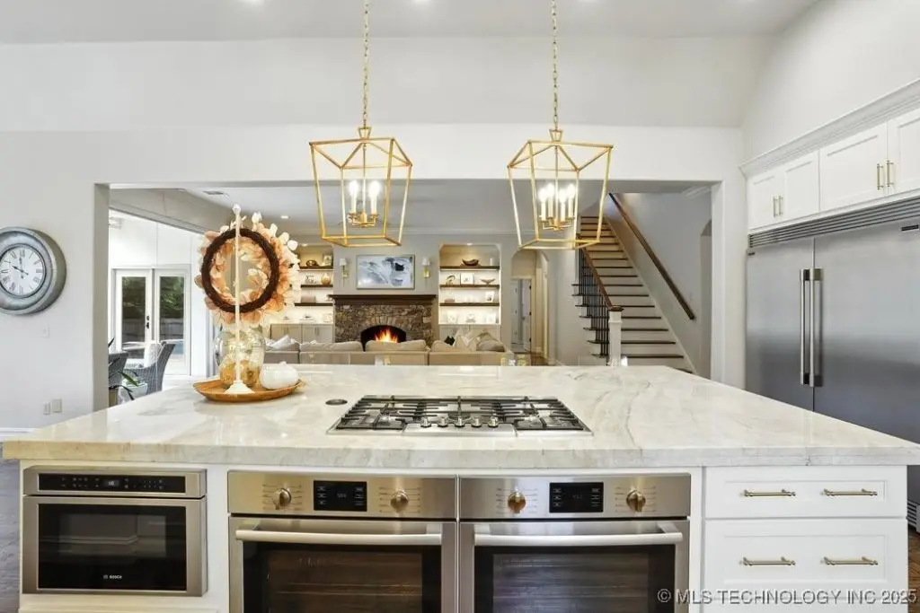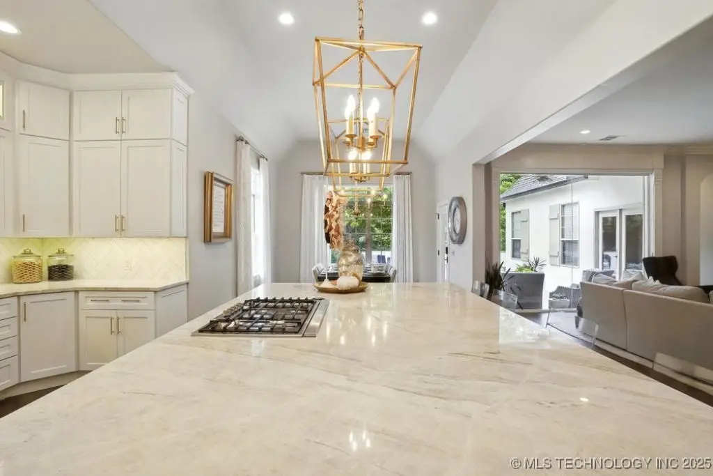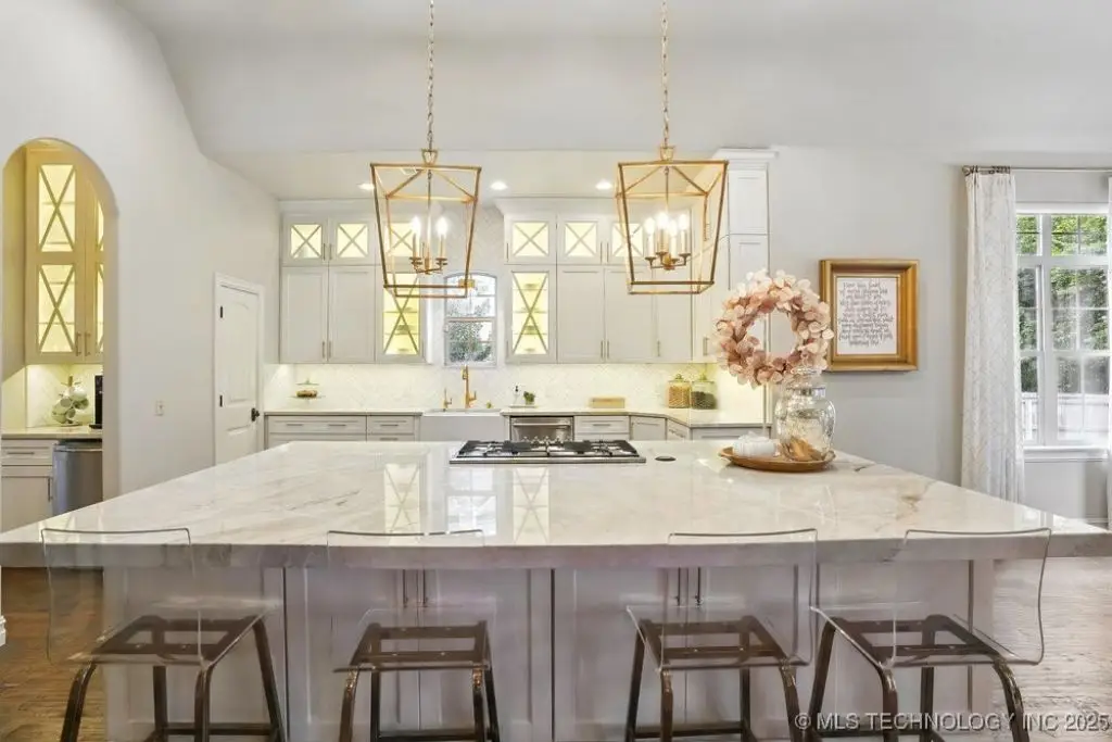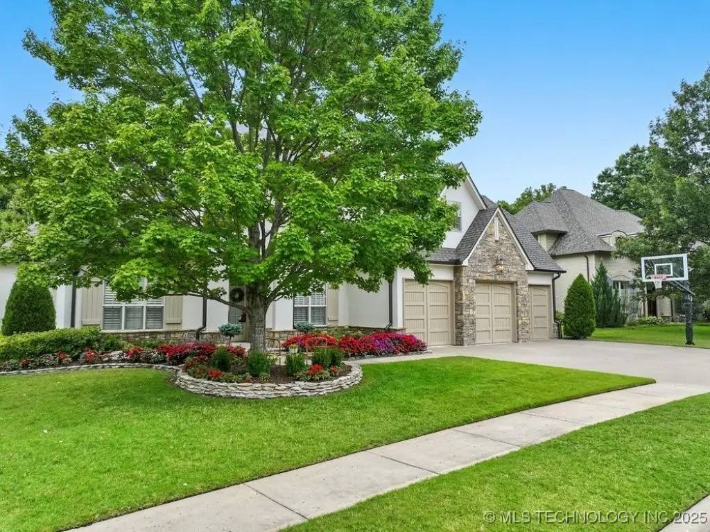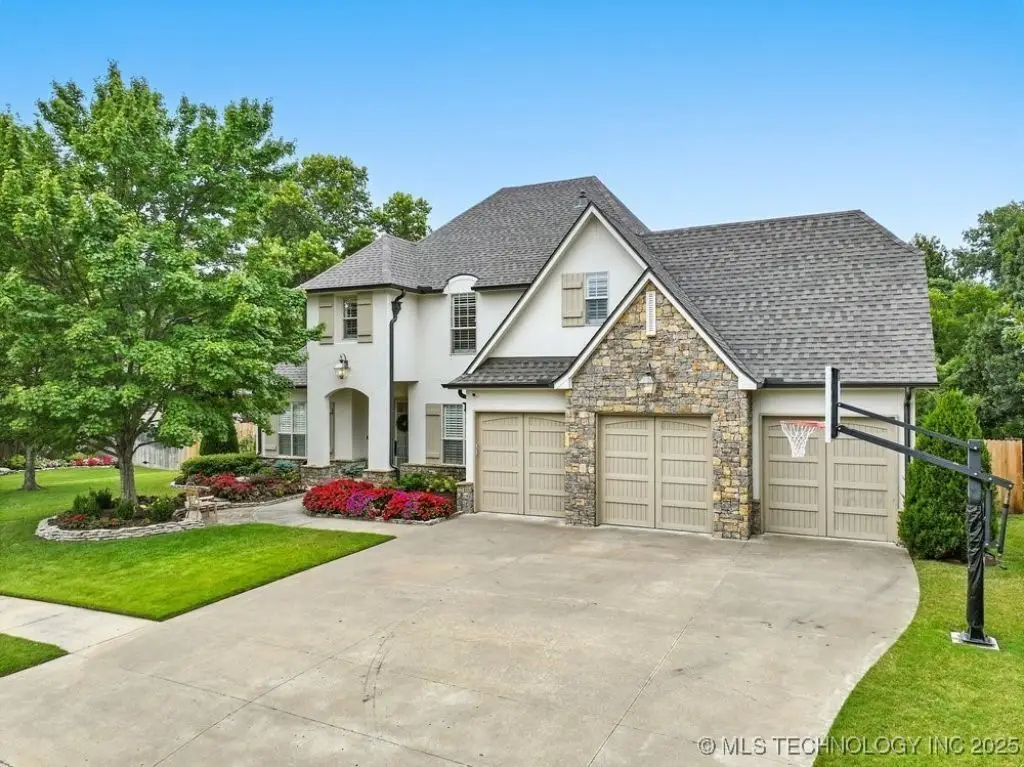 Welcome to your luxurious retreat, perfectly situated at the crossroads of Bixby and South Tulsa, offering the ultimate in comfort and convenience. This beautifully updated residence features five spacious bedrooms, four and a half baths, and a stunning grand foyer that opens to elegant formal spaces, including a formal dining/sitting room and a private office with its own closet. At the heart of the home is a chef's dream kitchen, designed to ignite culinary creativity. Outfitted with top-of-the-line Bosch appliances including double ovens and a built-in drawer microwave. This chefs kitchen is adorned with quartzite countertops, a Dolomitic Marble backsplash, and custom cabinetry extending to the ceiling with soft-close doors and drawers. A large STUNNING single-slab center island seats five, making it ideal for casual dining. Step outside to your private backyard oasis, featuring an in-ground pool, spa, firepit, and a fully equipped outdoor kitchen all set against the serene backdrop of a lush greenbelt. Gorgeous mature trees surround the home and are a focal point through the picturesque windows adorning the home. The luxurious primary suite offers a true escape, complete with a gas fireplace, all-new custom cabinetry, and elegant Dolomitic Marble finishes. The spa-inspired ensuite bath boasts a composite quartz stand-alone soaking tub, a curbless walk-in shower with multiple showerheads, and a heated quartzite bench designed for pure relaxation. On the main level, a private guest suite includes its own ensuite bath, perfect for visitors. Upstairs, you'll find three additional bedrooms, one with a private bath and walk-in closet, and two that share a stylish Pullman bath. A flexible living area or game room with a wet bar and mini fridge adds even more versatility. With hand-scraped hardwood floors, plantation shutters, and high-end finishes throughout, this home seamlessly blends timeless elegance with modern luxury. Welcome to refined living. Welcome home.