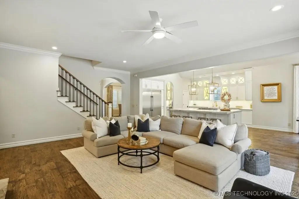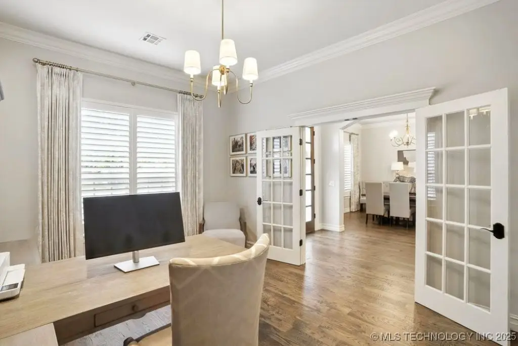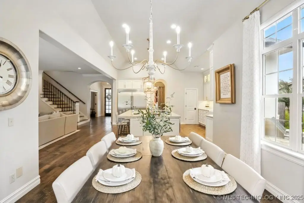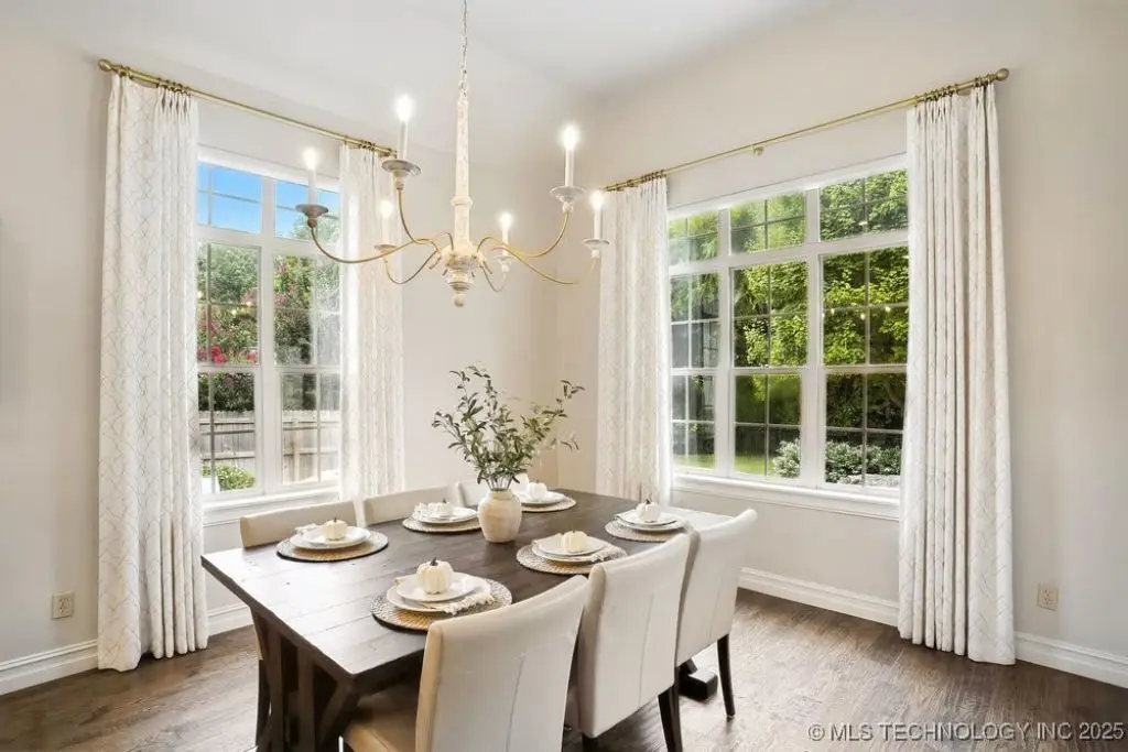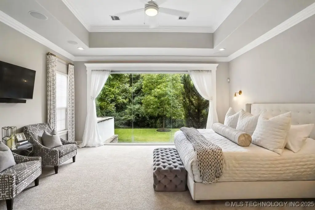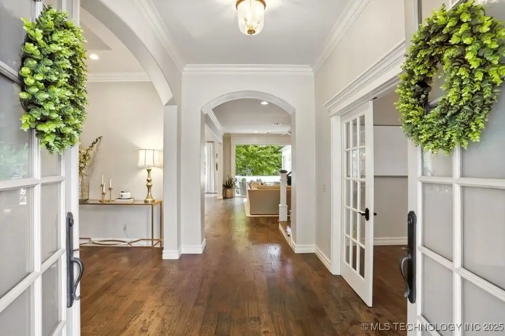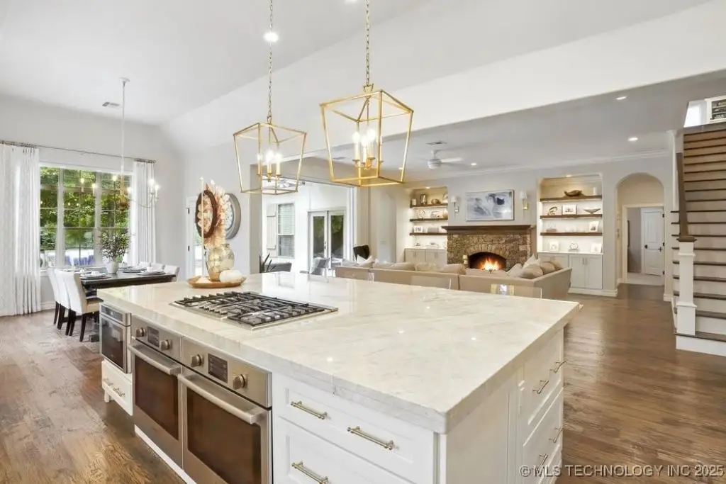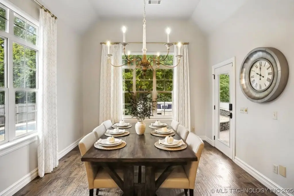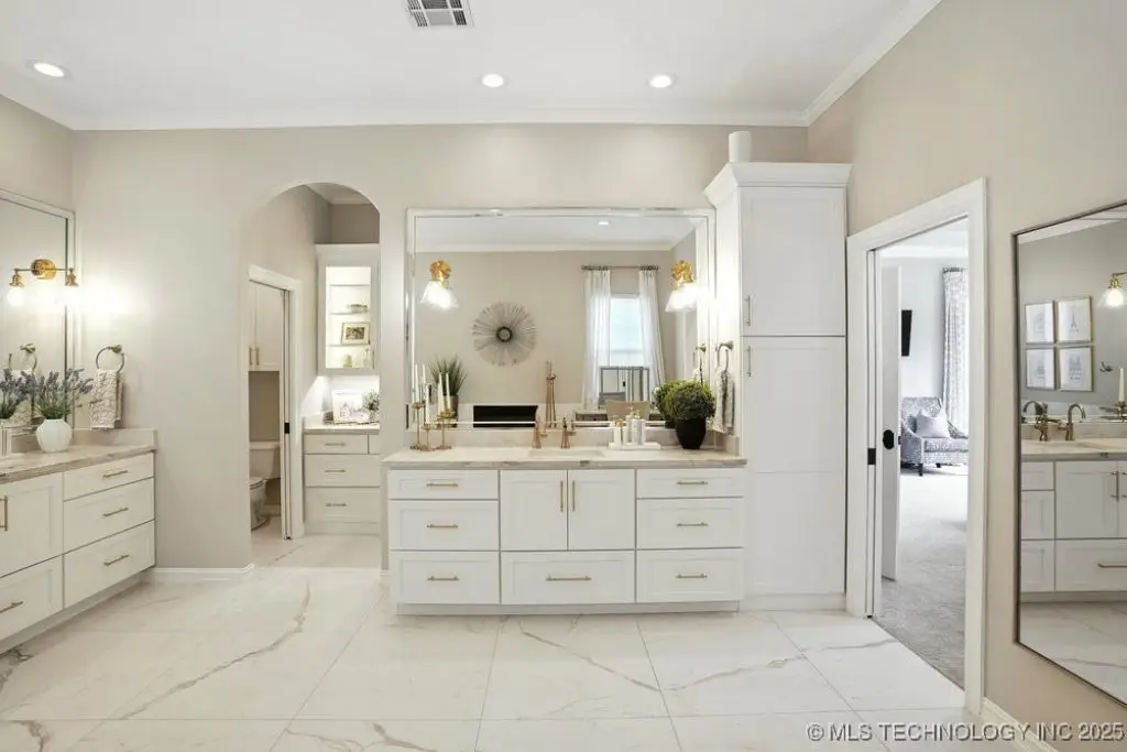 Welcome to your luxurious retreat, perfectly situated at the crossroads of Bixby and South Tulsa, offering the ultimate in comfort and convenience. This beautifully updated residence features five spacious bedrooms, four and a half baths, and a stunning grand foyer that opens to elegant formal spaces, including a formal dining/sitting room and a private office with its own closet. At the heart of the home is a chef's dream kitchen, designed to ignite culinary creativity. Outfitted with top-of-the-line Bosch appliances including double ovens and a built-in drawer microwave. This chefs kitchen is adorned with quartzite countertops, a Dolomitic Marble backsplash, and custom cabinetry extending to the ceiling with soft-close doors and drawers. A large STUNNING single-slab center island seats five, making it ideal for casual dining. Step outside to your private backyard oasis, featuring an in-ground pool, spa, firepit, and a fully equipped outdoor kitchen all set against the serene backdrop of a lush greenbelt. Gorgeous mature trees surround the home and are a focal point through the picturesque windows adorning the home. The luxurious primary suite offers a true escape, complete with a gas fireplace, all-new custom cabinetry, and elegant Dolomitic Marble finishes. The spa-inspired ensuite bath boasts a composite quartz stand-alone soaking tub, a curbless walk-in shower with multiple showerheads, and a heated quartzite bench designed for pure relaxation. On the main level, a private guest suite includes its own ensuite bath, perfect for visitors. Upstairs, you'll find three additional bedrooms, one with a private bath and walk-in closet, and two that share a stylish Pullman bath. A flexible living area or game room with a wet bar and mini fridge adds even more versatility. With hand-scraped hardwood floors, plantation shutters, and high-end finishes throughout, this home seamlessly blends timeless elegance with modern luxury. Welcome to refined living. Welcome home.