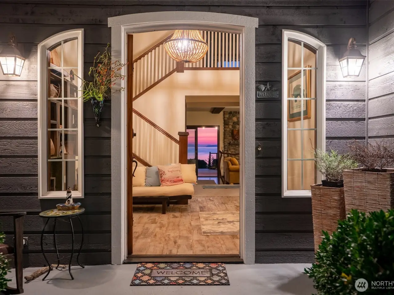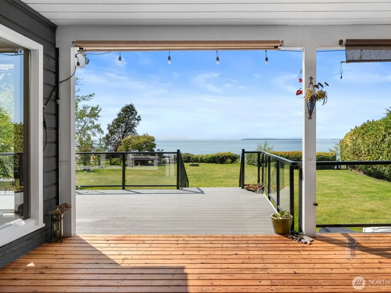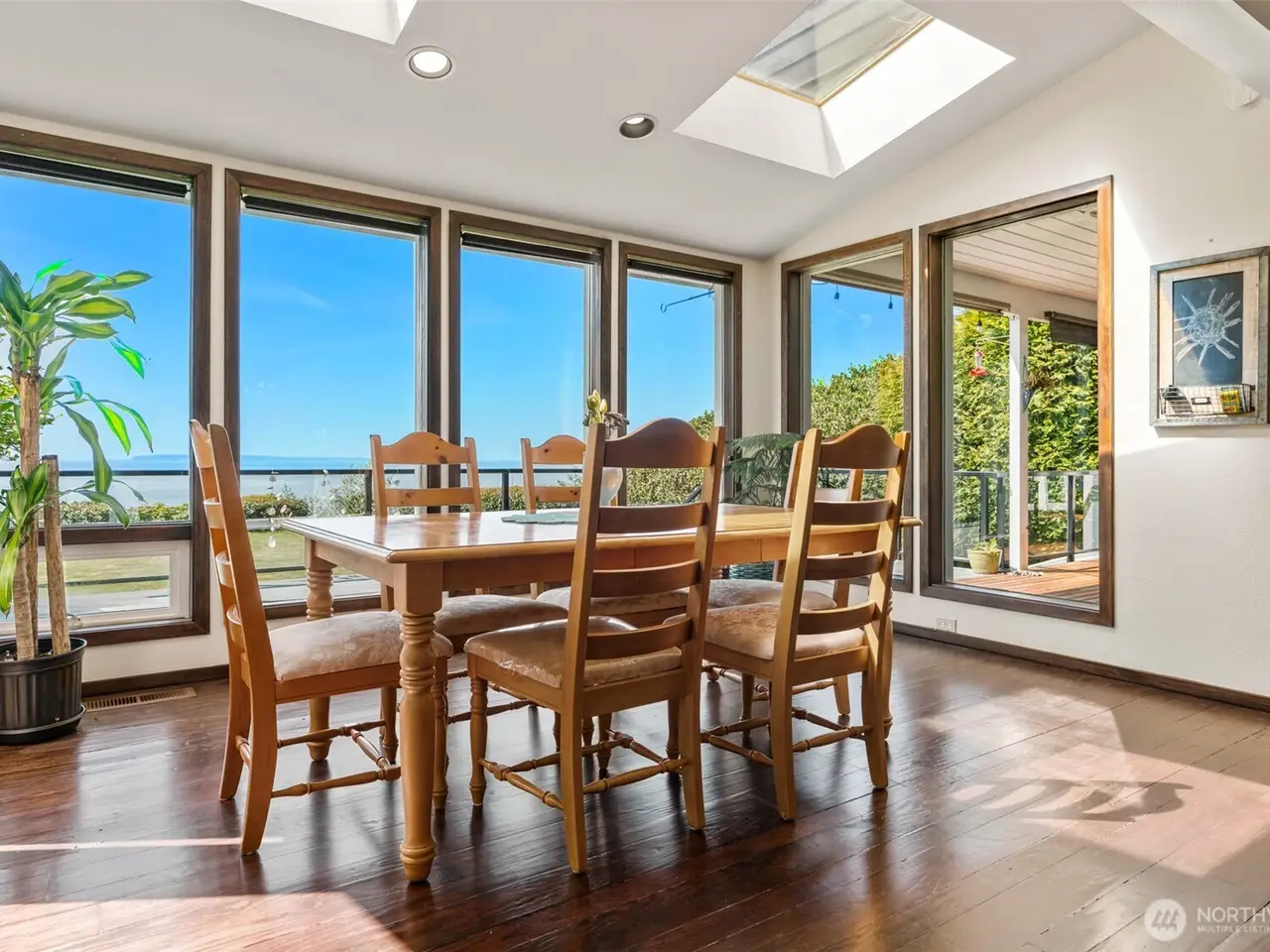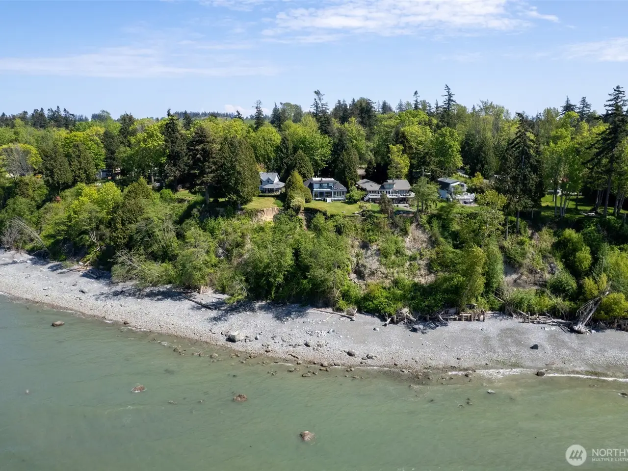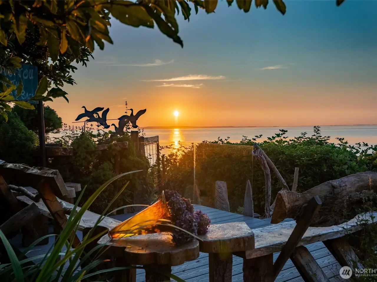 Waterfront Dream Home with picturesque sunset views across 850 ft. of gorgeous view decks! Grand river rock fireplace highlights impressive interiors: 3 comfortable bedrooms, water view kitchen, dining sunroom, vaulted ceiling entry, yoga room. Elegant master suite w/ fireplace, generous walk-in closet, extra bonus space, private decks. Skylights/picture windows infuse natural light. Minutes from Bellingham or White Rock (BC), a stunning waterfront drive carries you into this high-caliber enclave of cottages & handsome estates. Nestled in the trees, just below towering eagle trees, this tranquil private setting is a quiet oasis from noise. Edged w/ green forest; generous sunshine for flowers & outdoor living. Low taxes. Near Semiahmoo Golf.