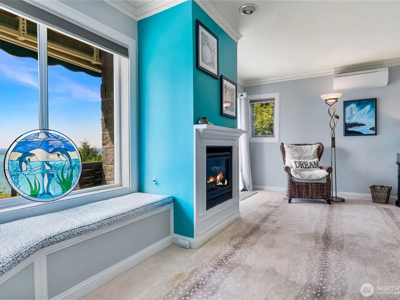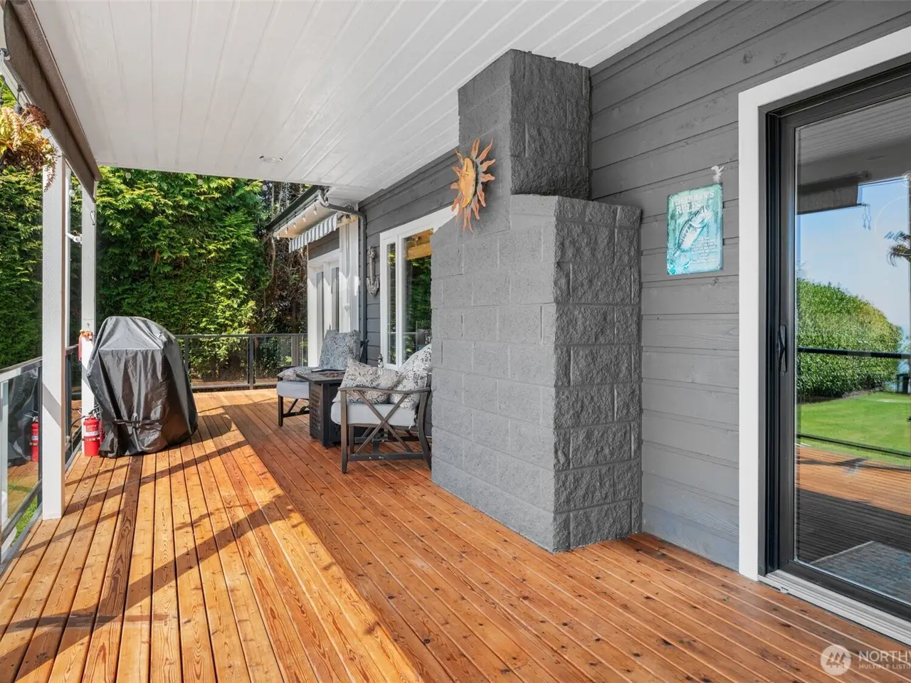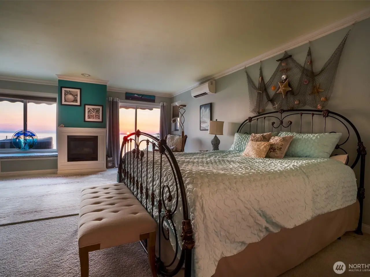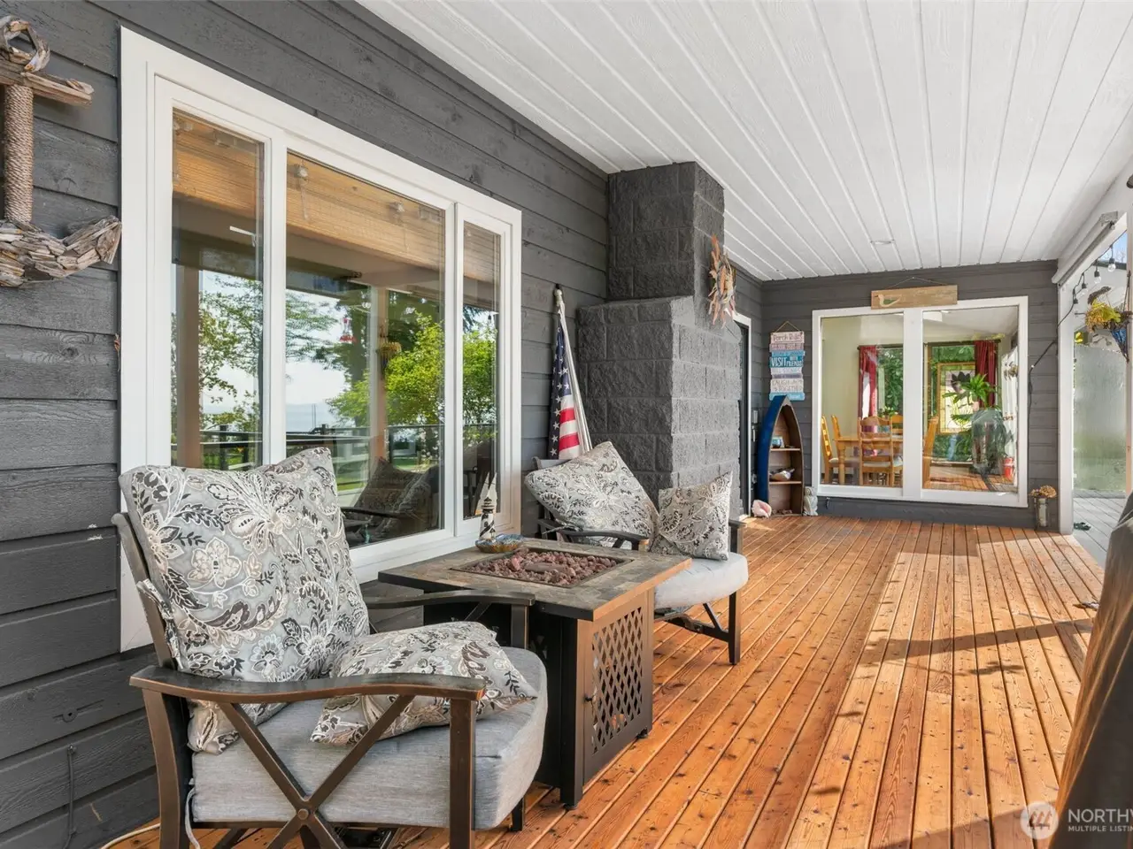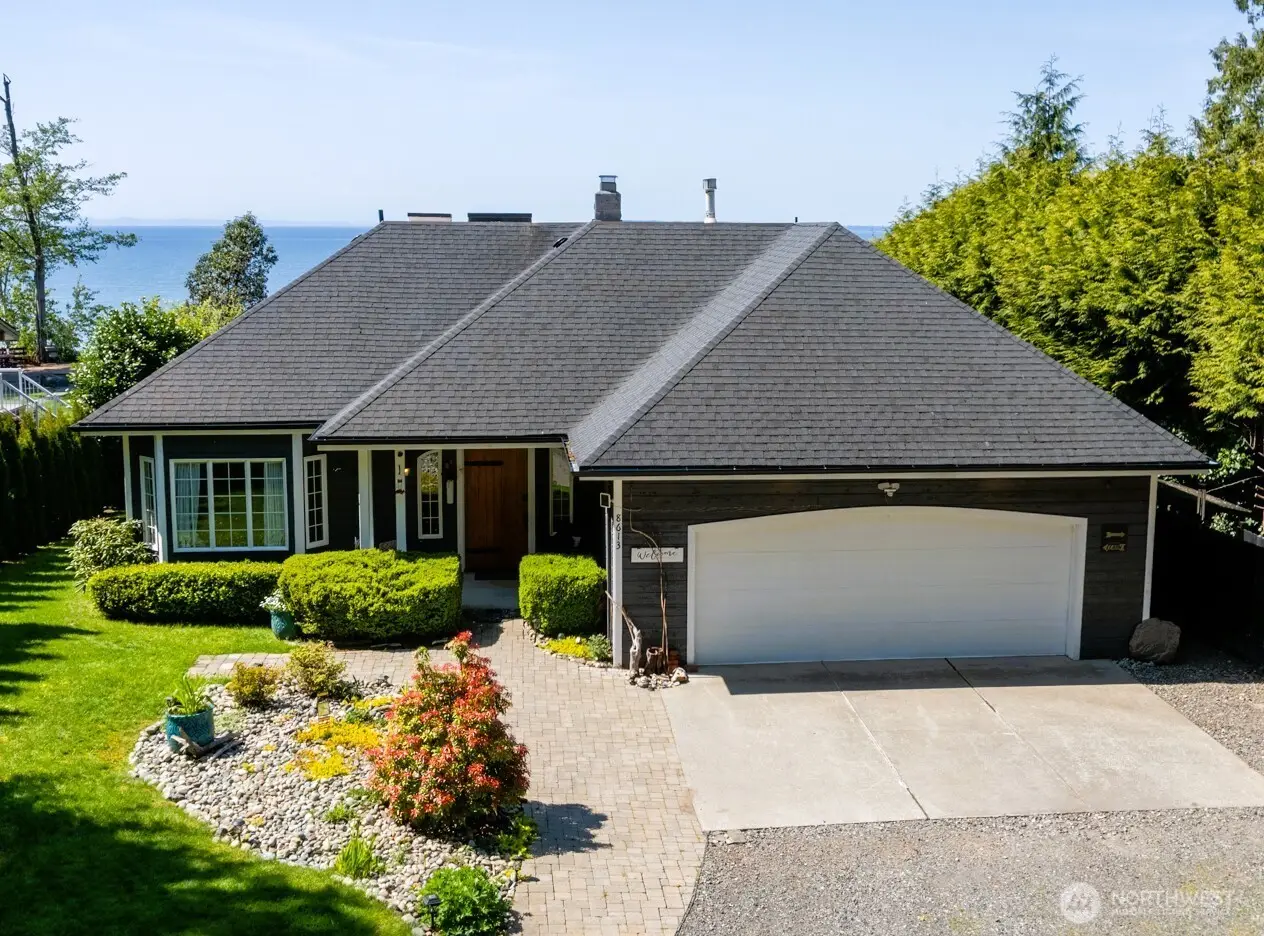Waterfront Dream Home with picturesque sunset views across 850 ft. of gorgeous view decks! Grand river rock fireplace highlights impressive interiors: 3 comfortable bedrooms, water view kitchen, dining sunroom, vaulted ceiling entry, yoga room. Elegant master suite w/ fireplace, generous walk-in closet, extra bonus space, private decks. Skylights/picture windows infuse natural light. Minutes from Bellingham or White Rock (BC), a stunning waterfront drive carries you into this high-caliber enclave of cottages & handsome estates. Nestled in the trees, just below towering eagle trees, this tranquil private setting is a quiet oasis from noise. Edged w/ green forest; generous sunshine for flowers & outdoor living. Low taxes. Near Semiahmoo Golf.