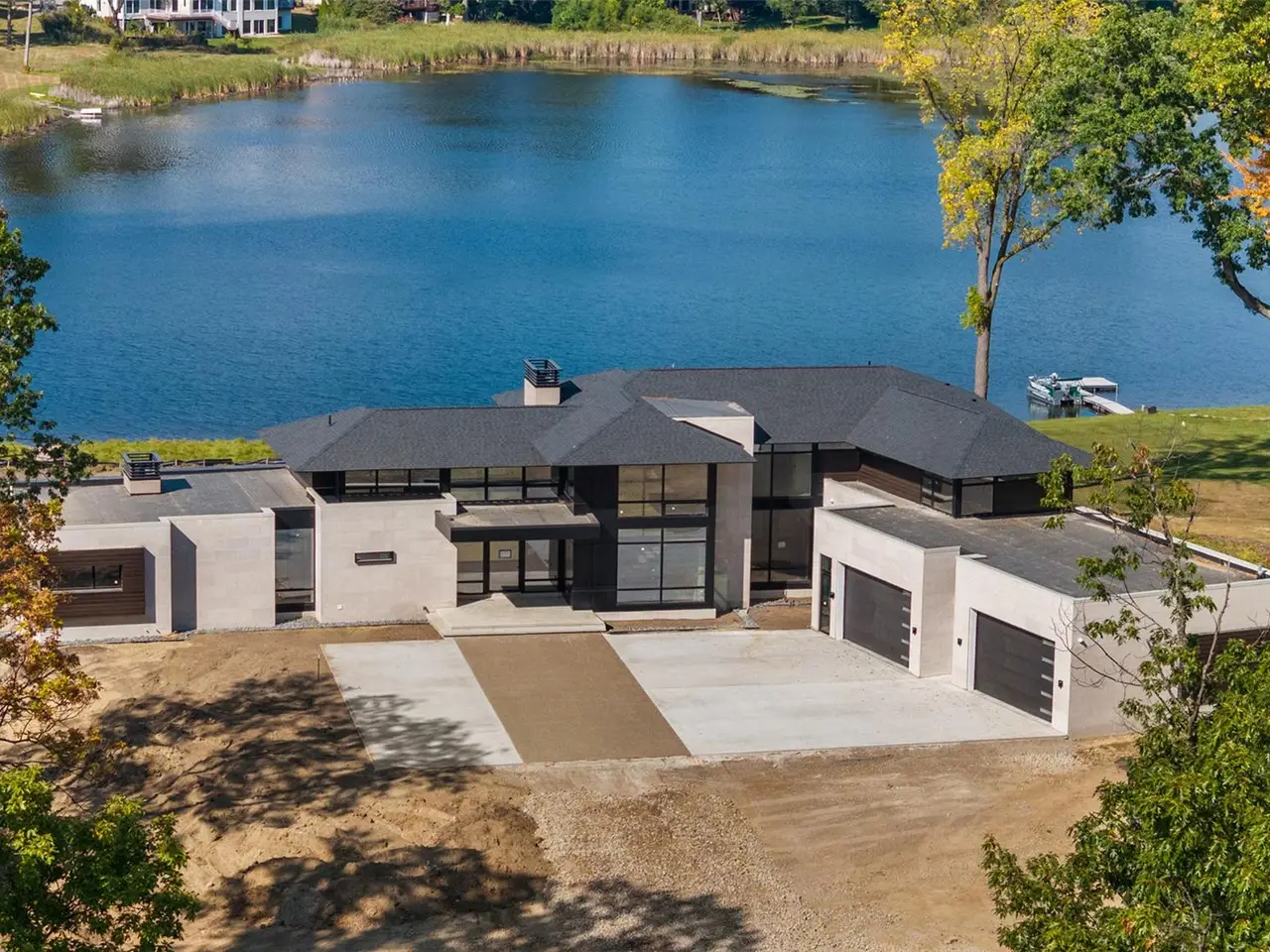A showcase of modern design, this extraordinary residence was created by renowned AZD Architects and meticulously built by Johnson Custom Homes. Offering a rare blend of sophistication, comfort, and elegance, with serene Orange Lake views, this property combines inspired architecture with impeccable craftsmanship. Every space has been intentionally designed. The main level primary suite is a true sanctuary, complete with a spa-like bathroom, dual walk-in closets, a dramatic two-sided fireplace, and a luxurious soaking tub. A concealed drop-down theater screen and full surround sound transform the bedroom into a private cinema. Upstairs, three spacious en suite bedrooms offer stylish accommodations for family or guests. A private office with its own outdoor terrace provides an ideal setting for focused work or quiet study. At the heart of the residence is a bright, open concept living area anchored by a custom formed fireplace. The chef's kitchen opens to an expansive patio, and a discreet prep kitchen adds functionality for effortless entertaining. Every detail, from the thoughtful layout to the curated materials, reflects an elevated approach to modern living. This is more than just a residence; it's a statement of design excellence set in a tranquil location. Professionally landscaped by Matt Mosher and thoughtfully designed interiors by Sharon Kory create a cohesive and luxurious living experience. This exceptional home is a must-see to fully appreciate. Additional notes: Oversized four car garage with multiple 220 outlets and ample room for car lifts. Please see spec sheet attached to this listing. Renderings are conceptual; the home does not include a pool or entry gate. However, final grading, irrigation, and sod are included in the sale.