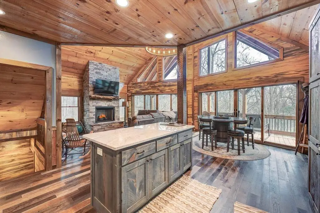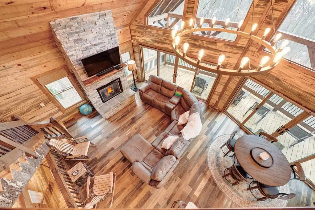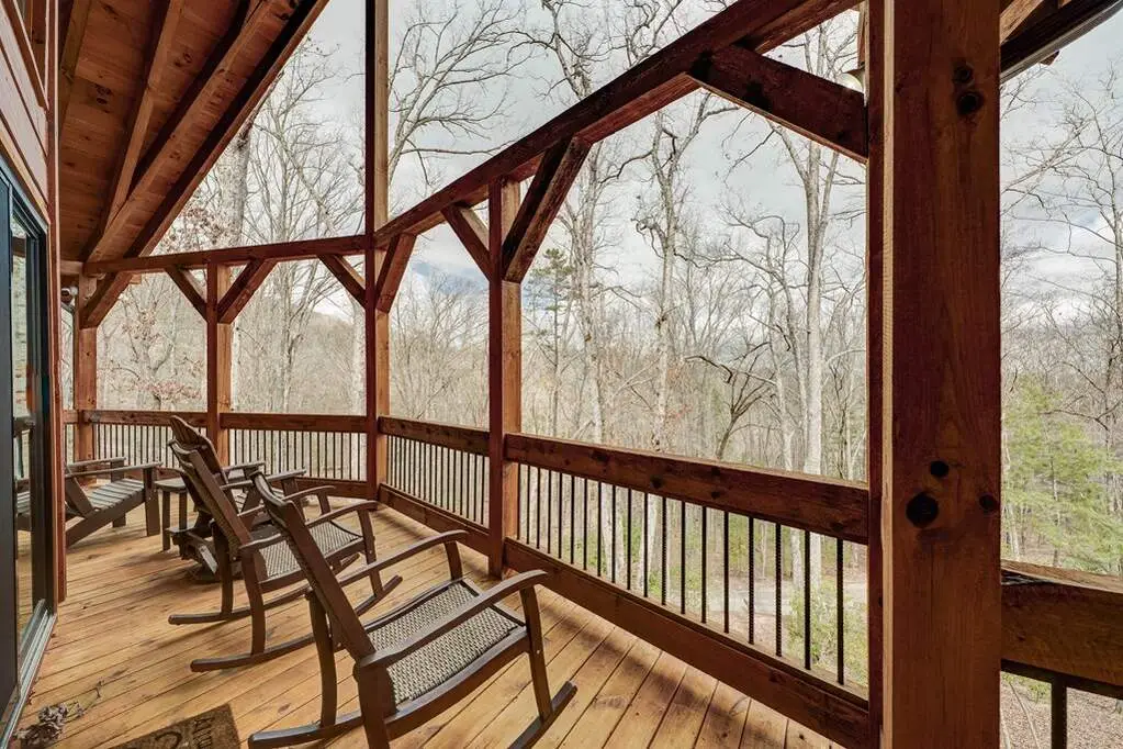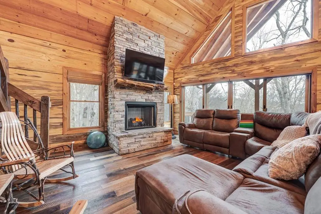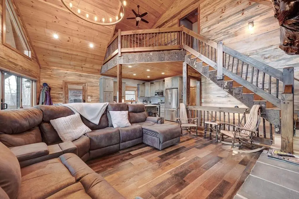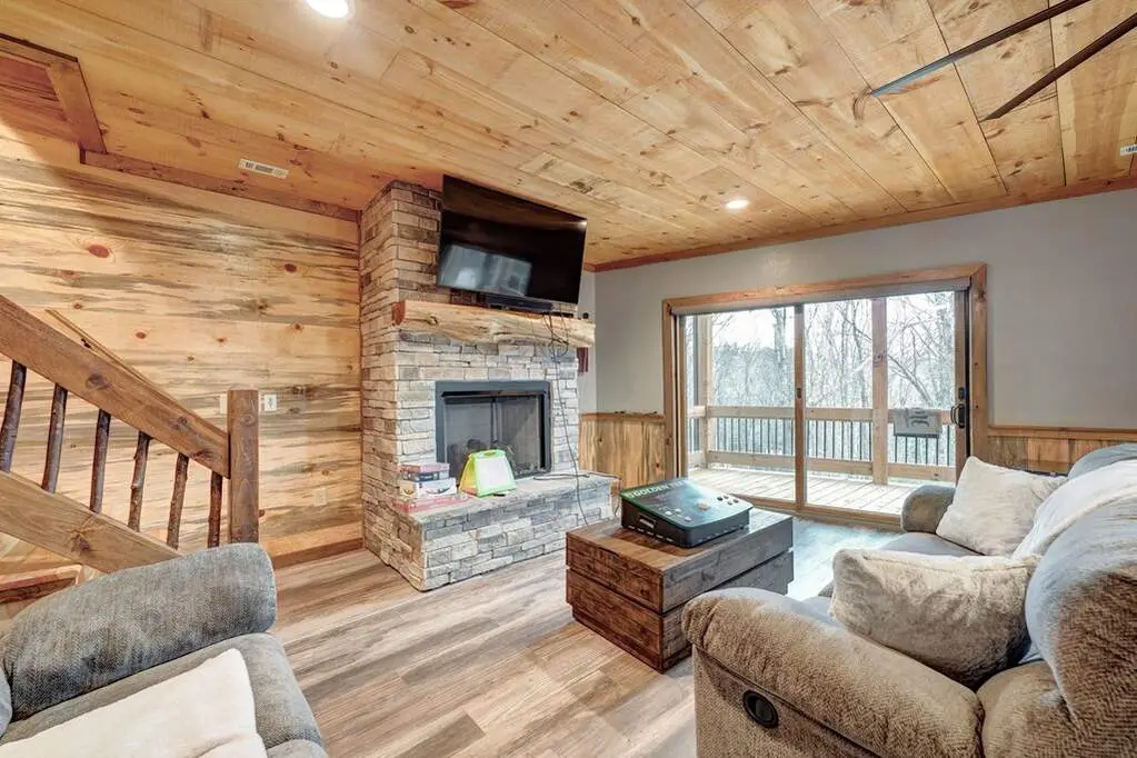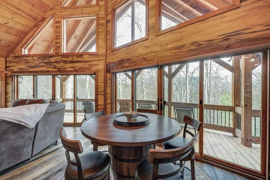 This stunning prow-front cabin features a window wall that brings the outdoors inside. The cabin offers a spacious Garage and multiple outdoor living areas, including a Party Porch with a wood-burning fireplace, a Hot Tub porch, wraparound decks, and a generator. The direct access to Lake Blue Ridge is ideal for kayaking and paddle boarding. The great room boasts a majestic stone fireplace with a cedar mantel that seamlessly flows into the dining area: the kitchen has granite countertops, custom cabinetry, and stainless-steel appliances. The cabin showcases beautiful "Blue Buggy" tongue-and-groove (T&G) interior walls, bark accents, tiled showers, and granite countertops. The terrace level includes a family room featuring a wet bar, pool table, and rocked fireplace. Each level has a spacious bedroom with a full bath and an additional half bath on the main floor. The laundry is conveniently located on the main level, and ample storage space ensures you have room for all your gear and belongings. The cabin is situated in an established neighborhood with all-paved access, this cabin is just a short walk from the Necowa Cove community access. You can take advantage of the nearby Aska Trail System for hiking, mountain biking, and immersing yourself in nature while only ten minutes away from downtown Blue Ridge. Public boat launch and the Toccoa River are just minutes away. Fully furnished and offering seasonal views of the mountains and shimmering light off of the lake, this cabin is the perfect getaway. Short-term rentals are allowed.