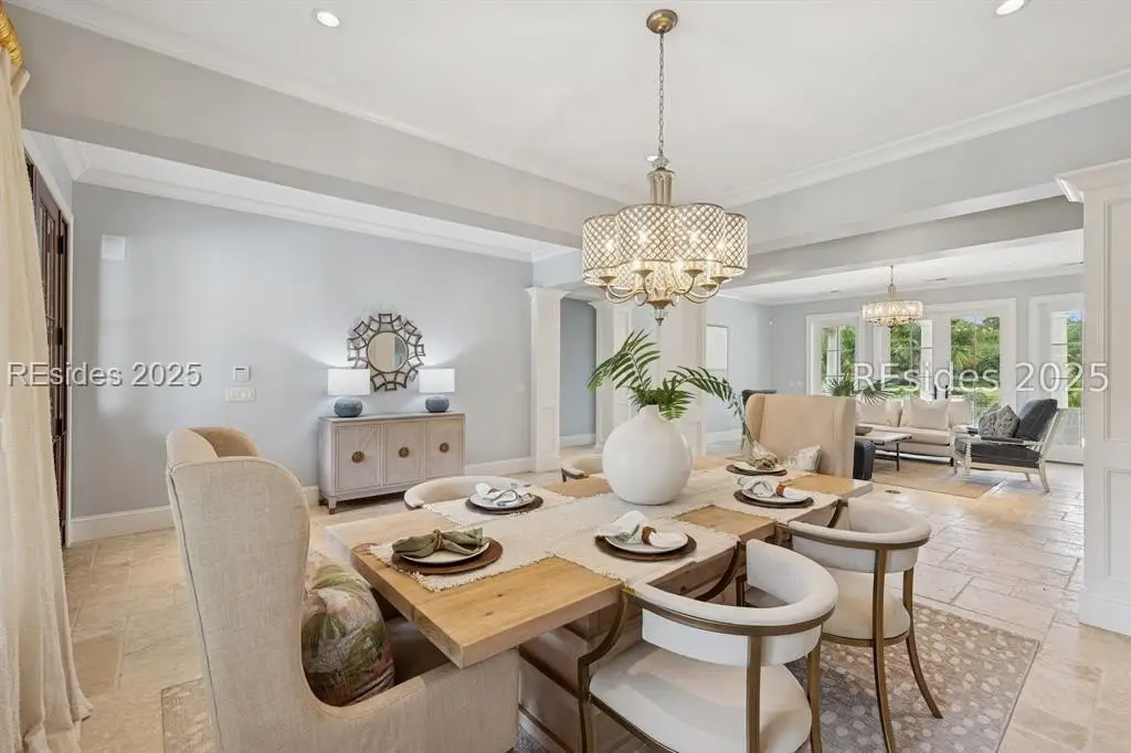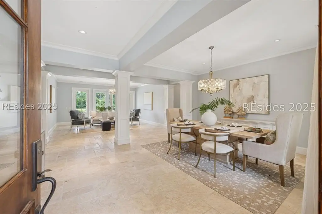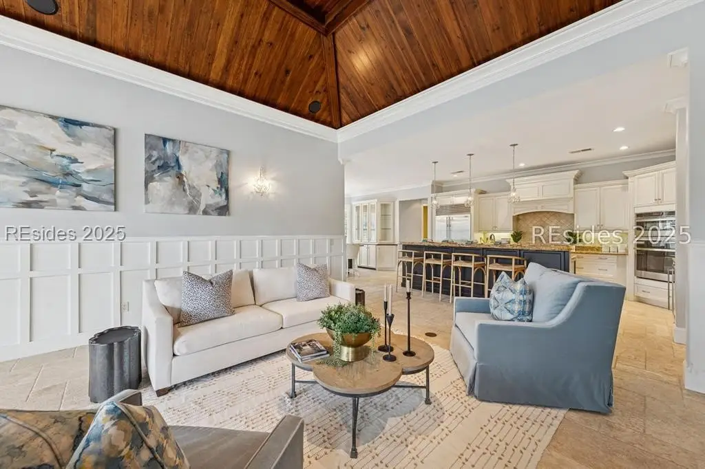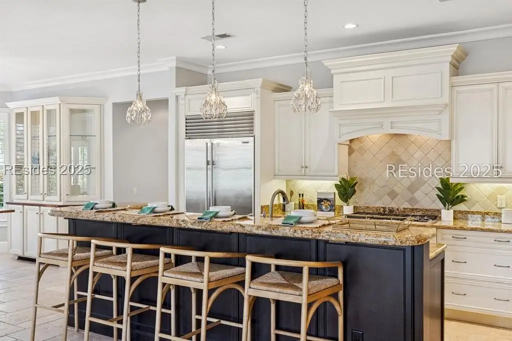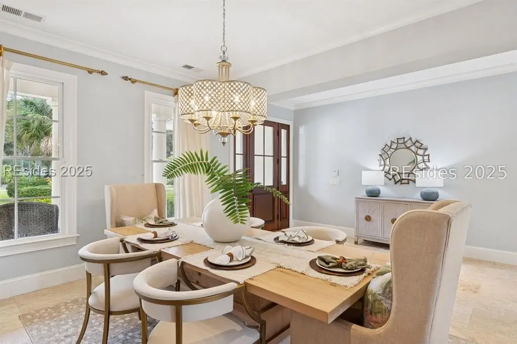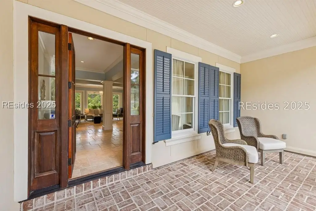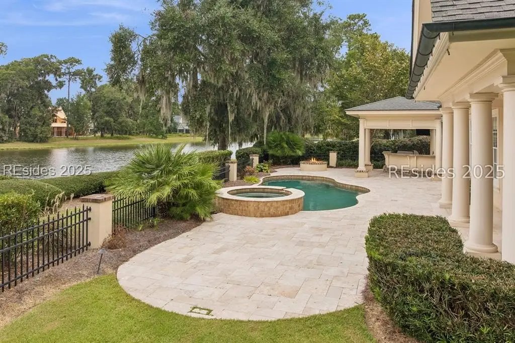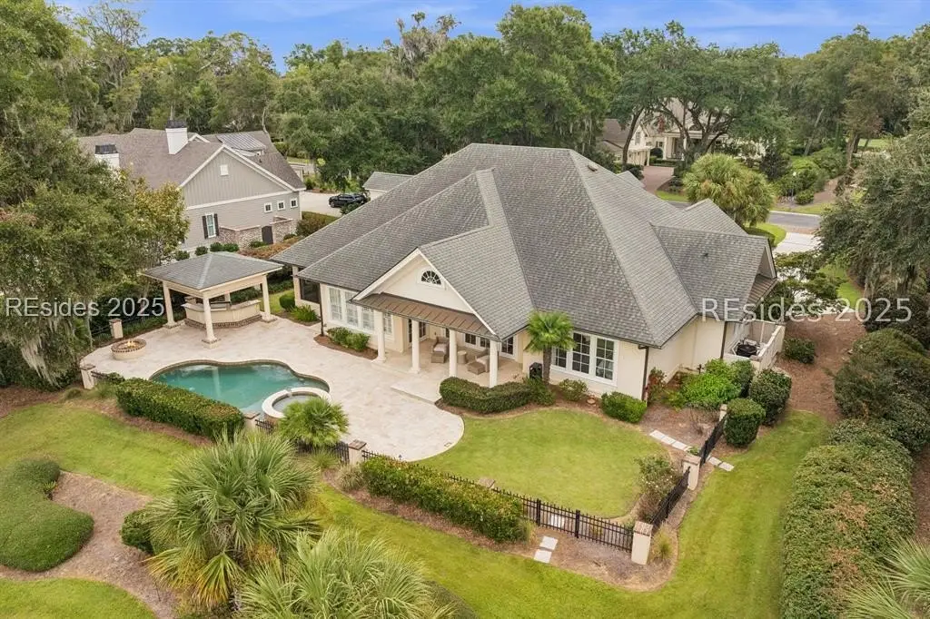 Set along Osprey Lake in Colleton River, this stunning residence offers over 5,000 sq. ft. of refined Southern living with 5 bedrooms and 5.5 baths. The thoughtful floor plan places three en suite bedrooms on the main level, complemented by spacious living areas finished with limestone and heart pine floors, exquisite moldings, and timeless architectural detail. The chef's kitchen is a true centerpiece, showcasing a Sub-Zero refrigerator, Wolf cooktop, and granite and slate counters throughout. Just beyond, a screened porch extends the living space outdoors, where a private pool, covered poolside bar with grill and TV, and a fully fenced backyard create an ideal entertaining retreat, perfect for gatherings or simply enjoying the Lowcountry lifestyle. Two separate stairwells lead to private upstairs retreats, each with a bedroom and full bath. These versatile spaces provide endless possibilities, serving as guest suites, home offices, media rooms, gyms, or even a golf simulator. A walk-in attic with 1,500+ sq. ft. of storage and an oversized three-car garage add everyday practicality. Every detail of this home has been designed with intention, offering a rare combination of craftsmanship, comfort, and livability. From formal entertaining to casual gatherings by the pool, this Colleton River residence is as versatile as it is timeless.