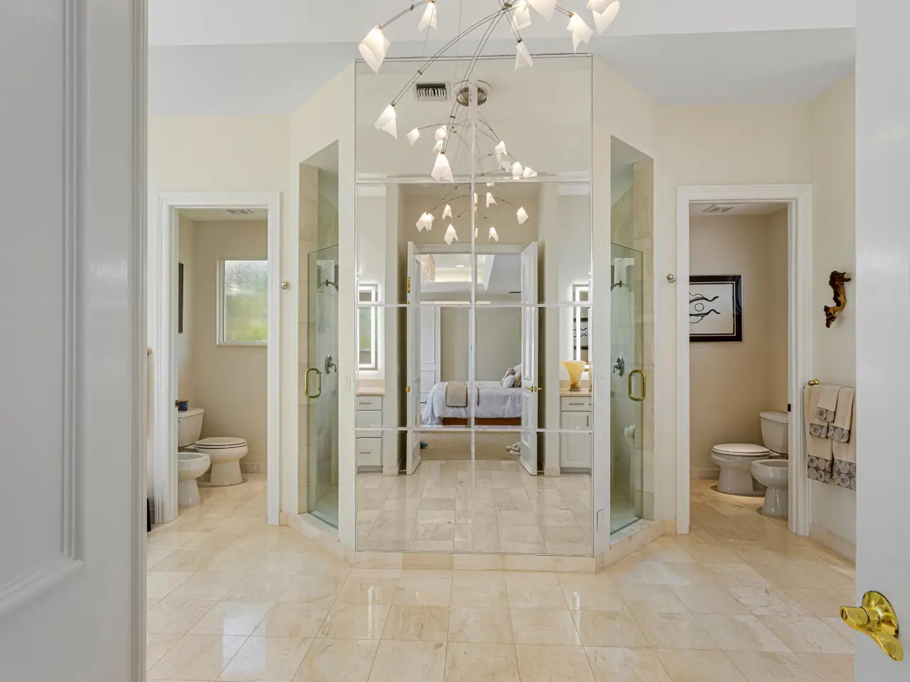 Luxe Boca Raton deepwater estate in the desirable Lake Rogers community fronts 80 feet on a deep-water canal with a dock offering easy ocean access, desirable for boaters. Interiors are peerlessly defined by grand architectural adornments, and the magnificent outdoor entertaining area centers on a sun-splashed pool with a spill-over spa bounded by an expansive patio with a wet bar and barbeque area.