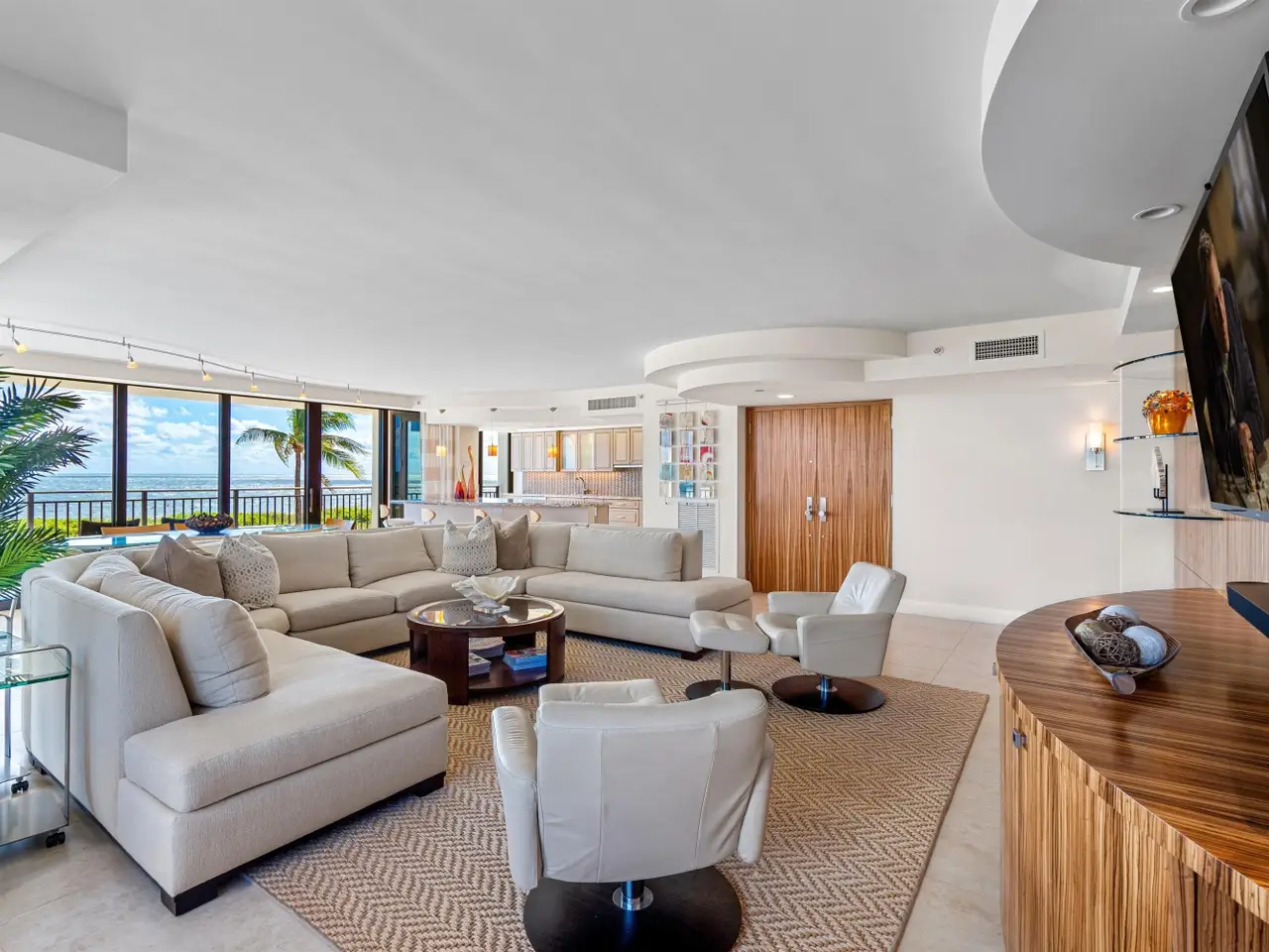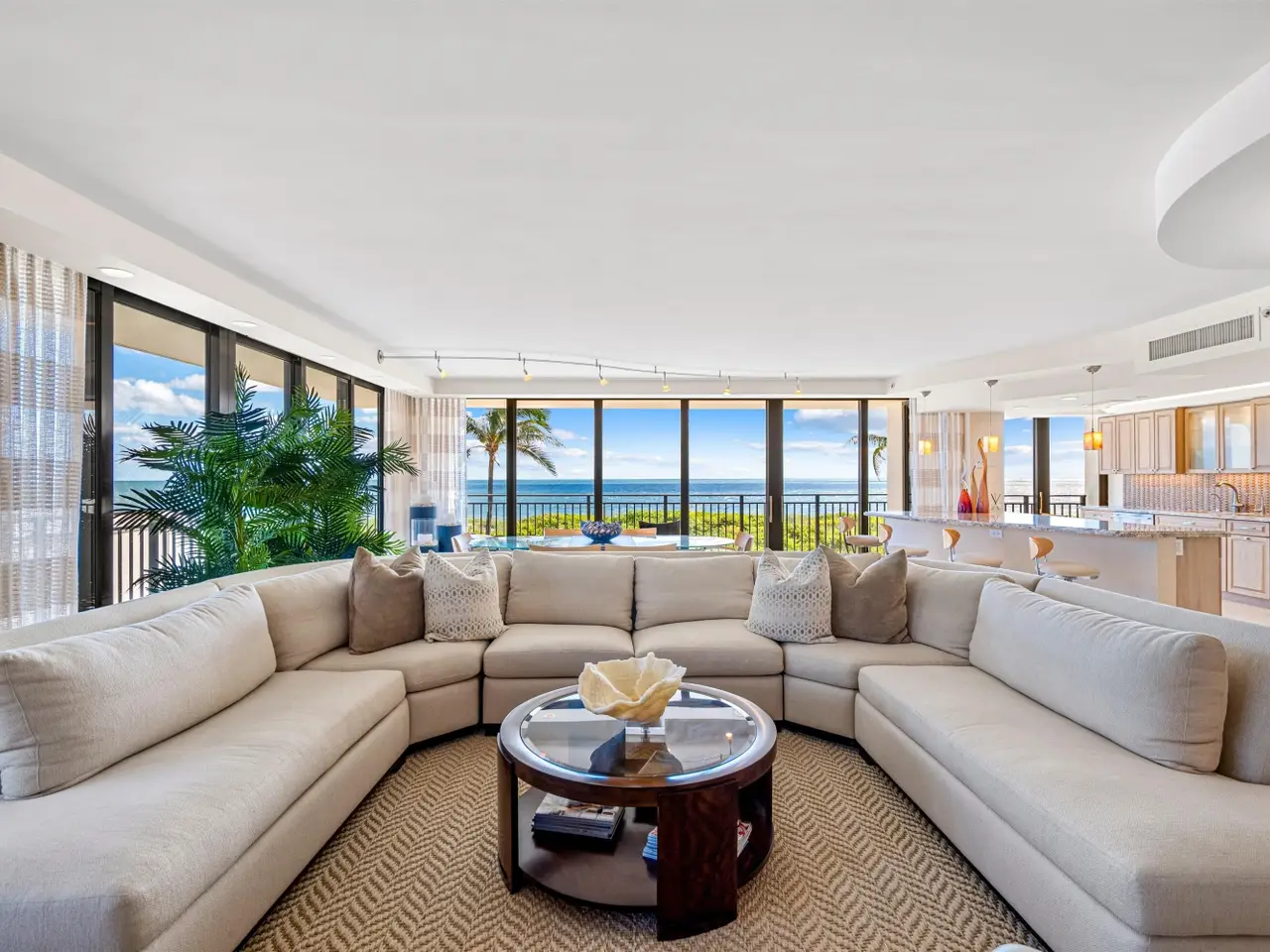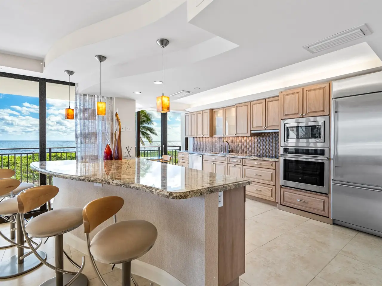 Stunningly updated residence designed by famed Boca Raton designer. This corner great room floor plan features an open kitchen that flows through walls of impact glass sliders to a spacious oceanfront balcony. The designer kitchen offers abundant storage, custom cabinetry, and high-end appliances. The great room showcases a custom media wall. A corner primary suite includes a beautifully fitted dressing room and a luxurious bath with soaking tub and glass-enclosed shower. The third bedroom is customized as a stylish office with built-ins. Enjoy boutique oceanfront living with a resort-style pool overlooking the Atlantic and direct access to miles of pristine sandy beach. Amenities include a club room, fitness center, and lobby with doorman. Pet friendly building!