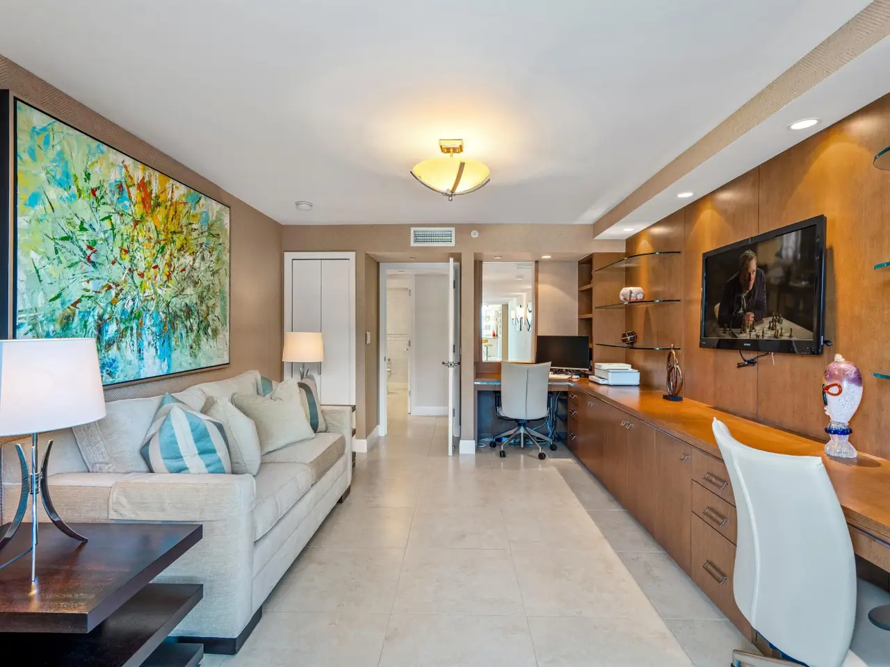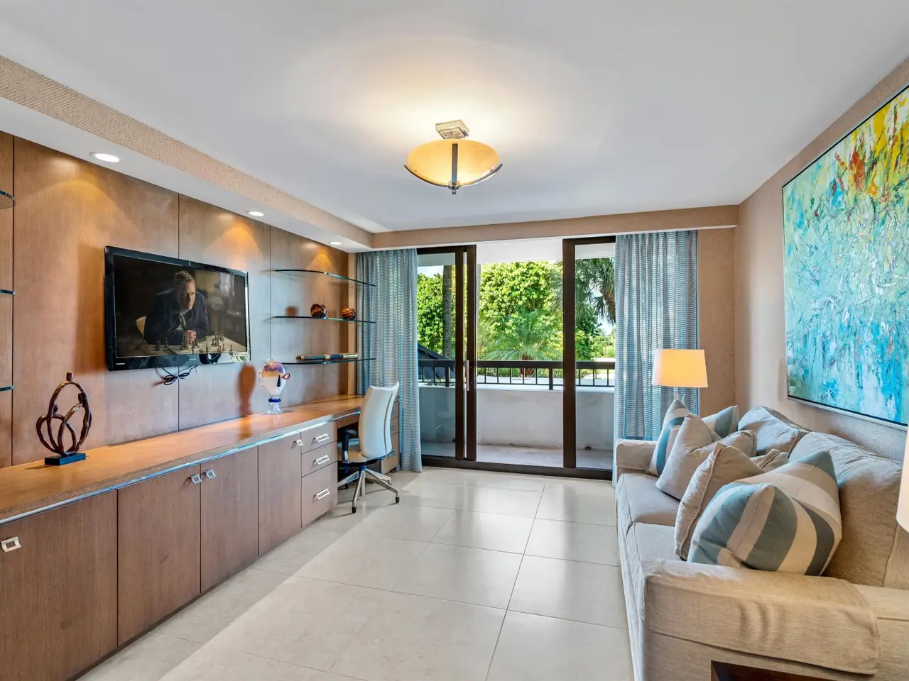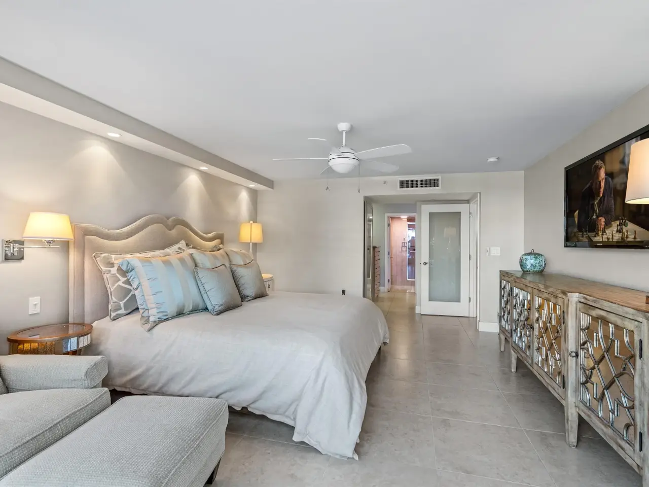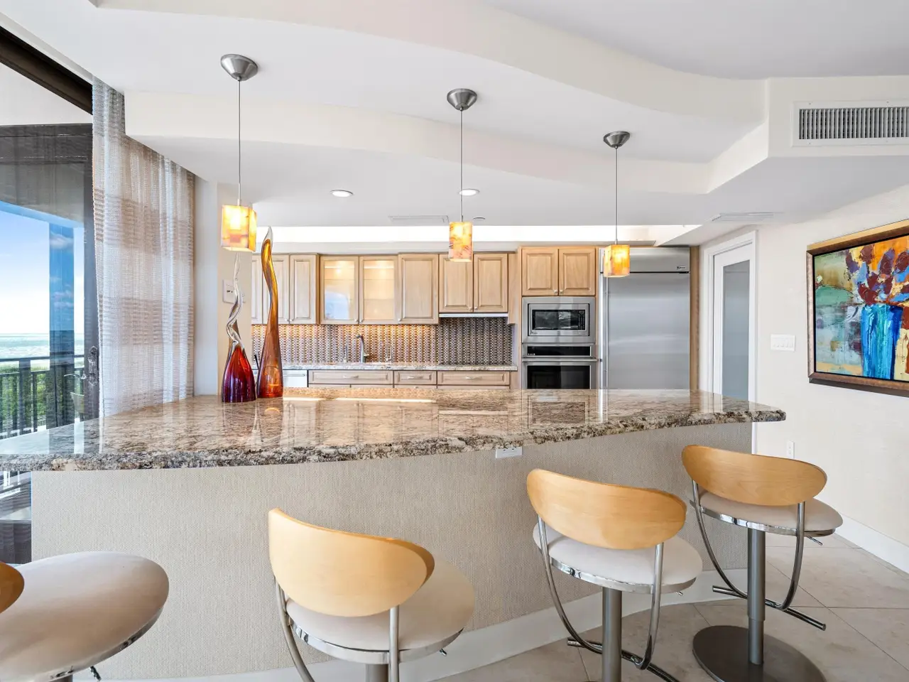 Stunningly updated residence designed by famed Boca Raton designer. This corner great room floor plan features an open kitchen that flows through walls of impact glass sliders to a spacious oceanfront balcony. The designer kitchen offers abundant storage, custom cabinetry, and high-end appliances. The great room showcases a custom media wall. A corner primary suite includes a beautifully fitted dressing room and a luxurious bath with soaking tub and glass-enclosed shower. The third bedroom is customized as a stylish office with built-ins. Enjoy boutique oceanfront living with a resort-style pool overlooking the Atlantic and direct access to miles of pristine sandy beach. Amenities include a club room, fitness center, and lobby with doorman. Pet friendly building!