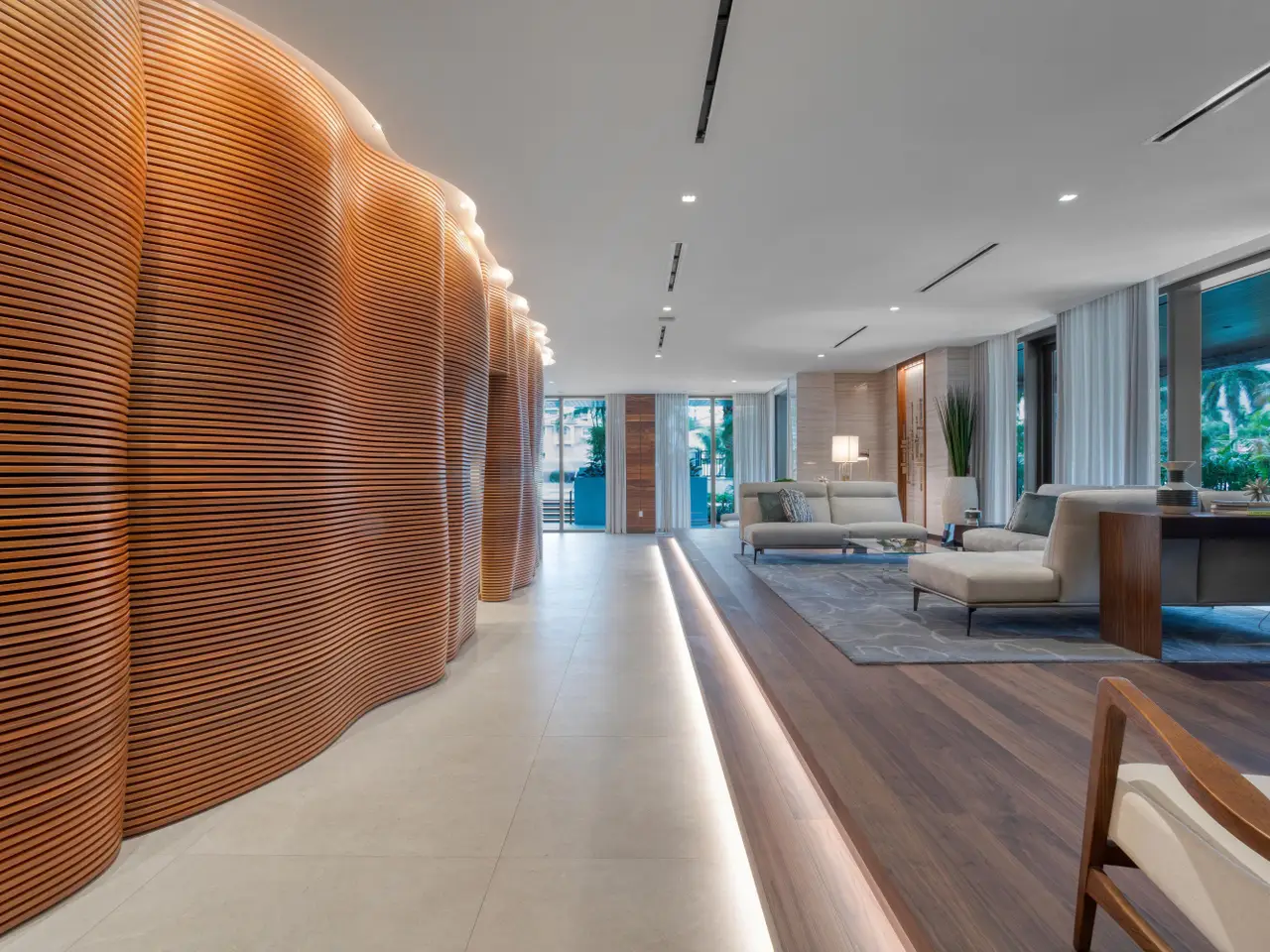 Immersed in verdant, canopied landscaping, offering panoramic fairway vistas and delivering a sense of tranquility and tropical ambience, this three-bedroom masterpiece, with 4,299 +/- total square feet, features an open-layout/split-bedroom plan comprising light, bright, sun-kissed interiors. Defined by soaring ten-foot ceilings, large-format tile flooring, custom built-ins and decorator finishes that combine to impart an elegant yet relaxed contemporary vibe, this stunning residence conveys an elegant arrival experience. The elevator opens directly into the residence's private entry foyer, where a sophisticated art-gallery concourse culminates at the great room showcasing window-walls of glass that open to the wraparound balcony offering expansive southeast golf course views.