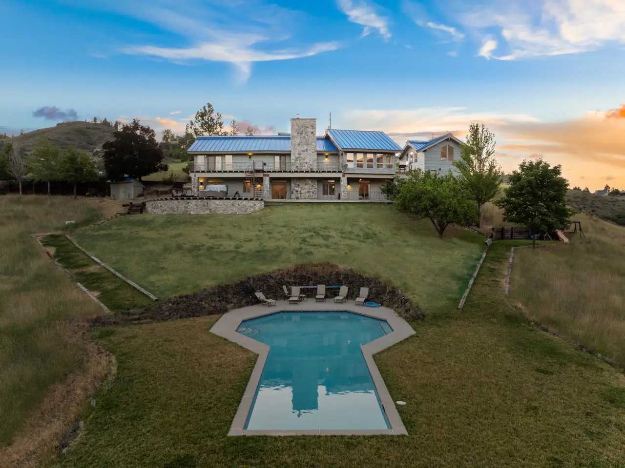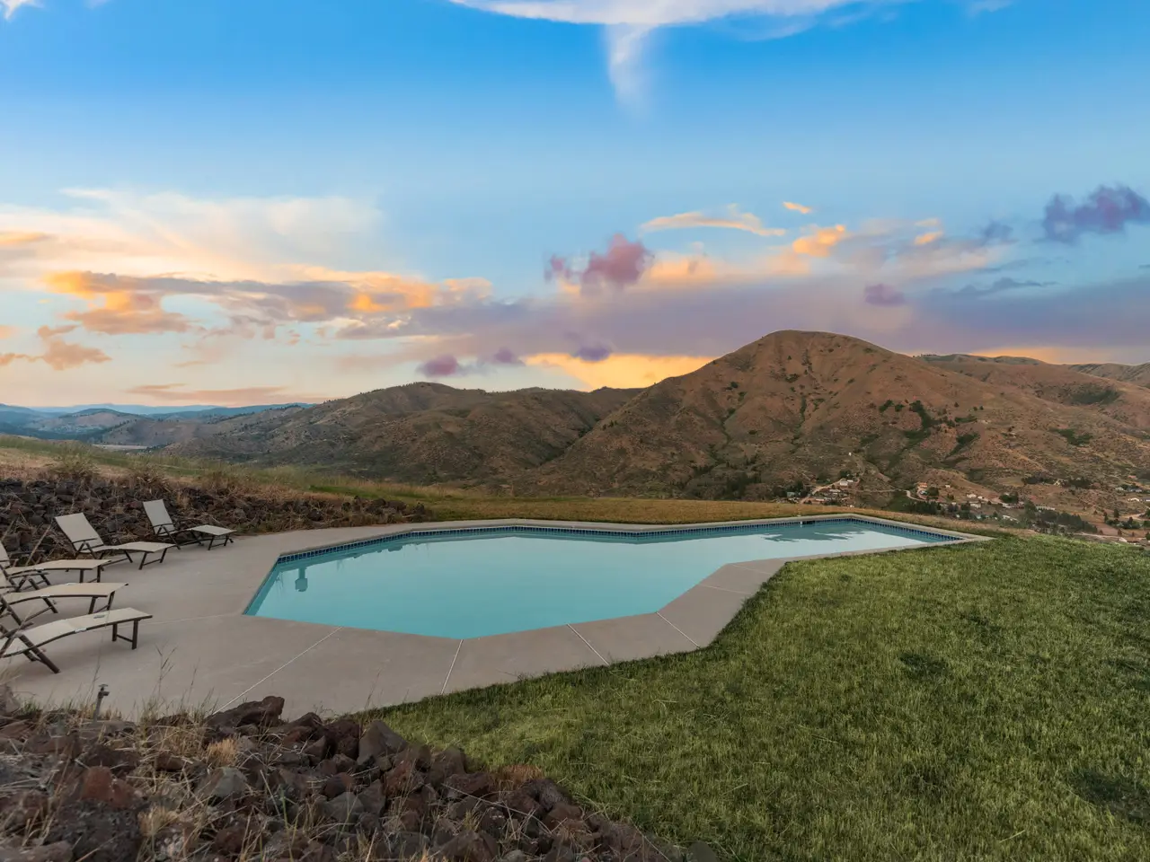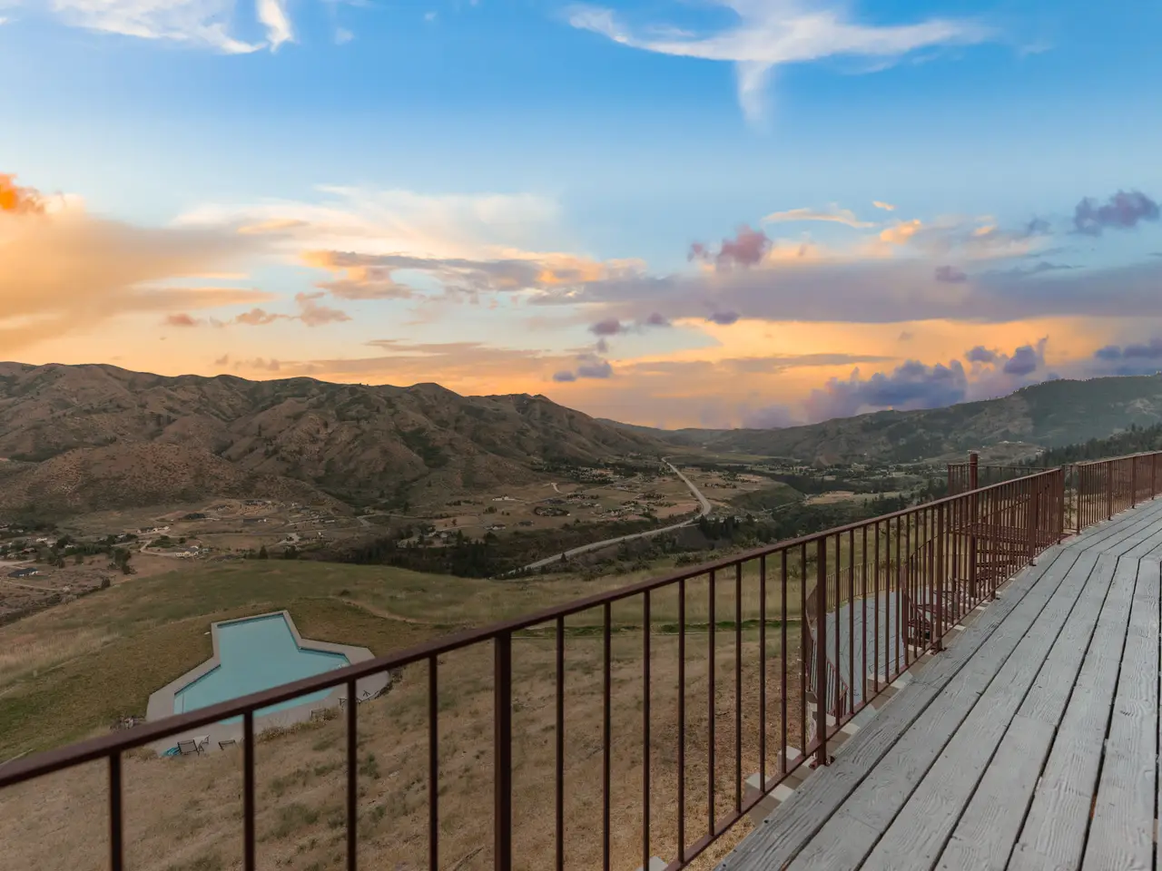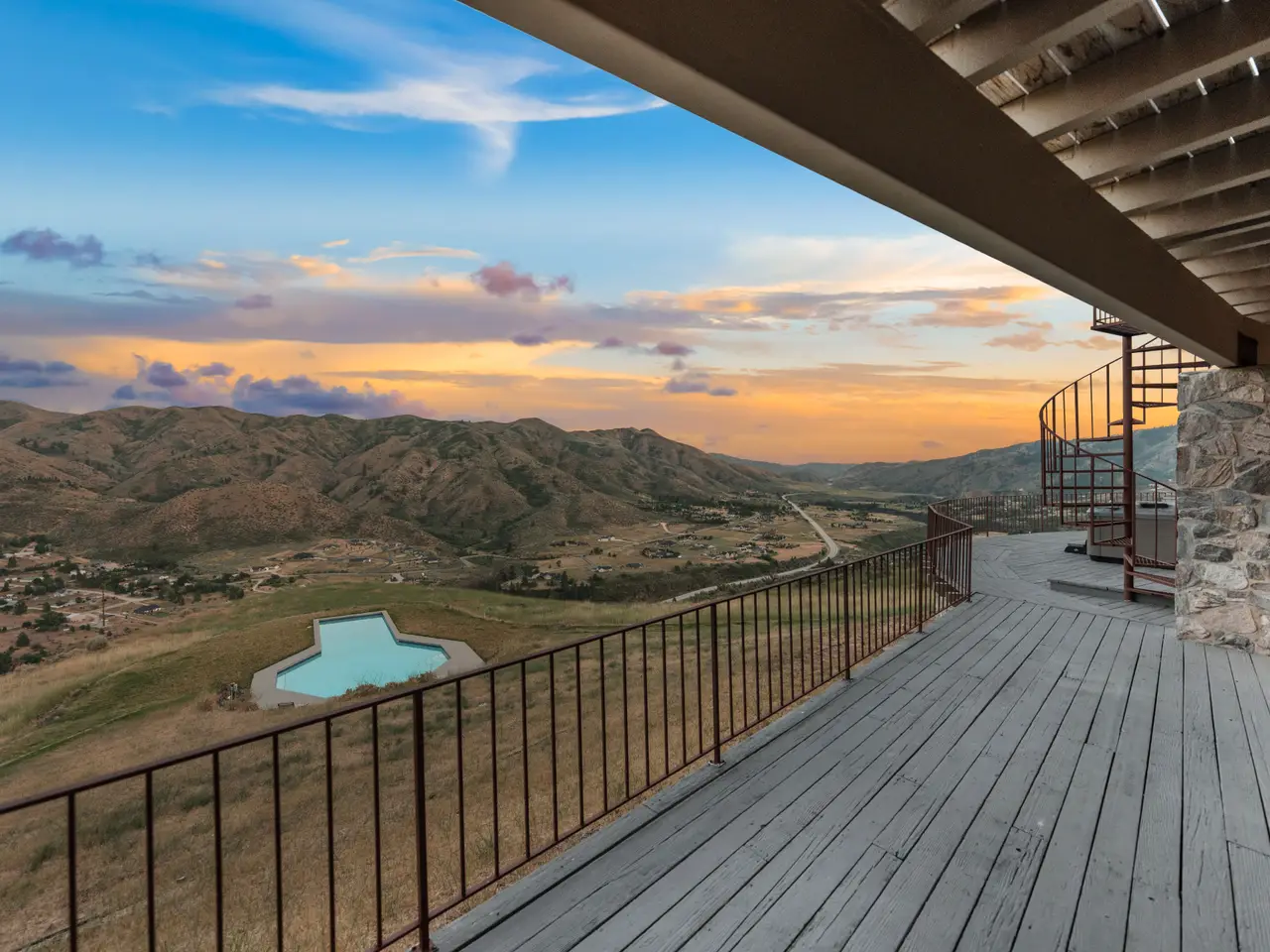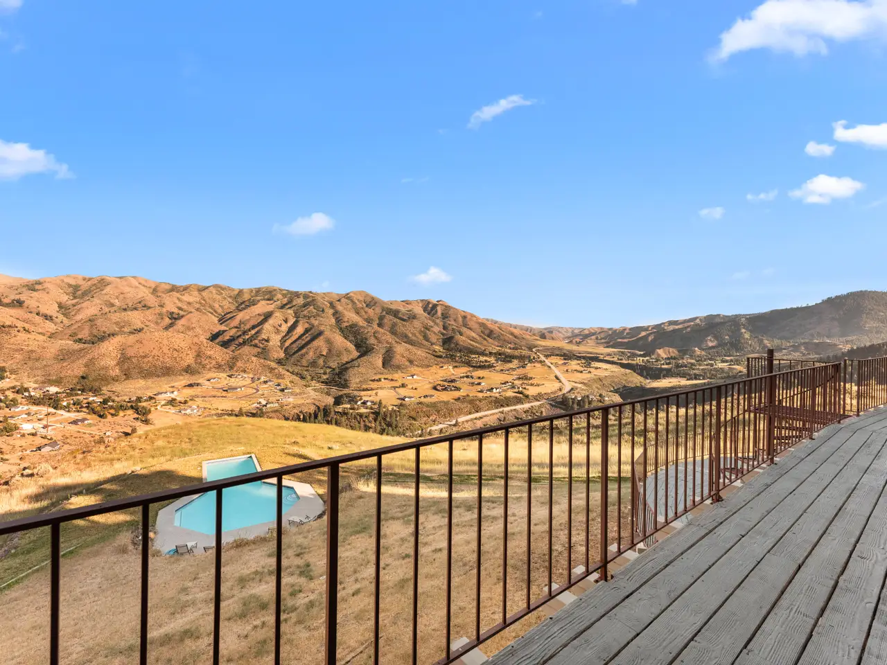 Experience over 17 acres of rural Idaho living, just 35 minutes from Boise with sweeping views of the Sawtooth Mountain Range in every direction! This charming mountain estate offers a spacious main residence and a flexible guest house/ADU. A 24’x47’ in-ground pool overlooks the endless mountain range. The interior features hardwood flooring, intricate mahogany woodwork, cathedral ceilings with exposed wood beams, and expansive architectural windows that frame the natural landscapes. Main-level master suite features direct balcony access, dual walk-in closets, and spacious en suite bathroom. On the lower level, enjoy a vast bonus room with a wet bar, a cozy library, three additional guest bedrooms and a newly renovated bathroom. The elevated guest house offers open-concept living, dining, and kitchen area, a secluded bedroom, and a full bathroom. Minutes from hiking, biking, hunting, & Lucky Peak dock access. HOA maintains roads for year round ease. Steel roof with 30 yr warranty & 500 gal propane tank.