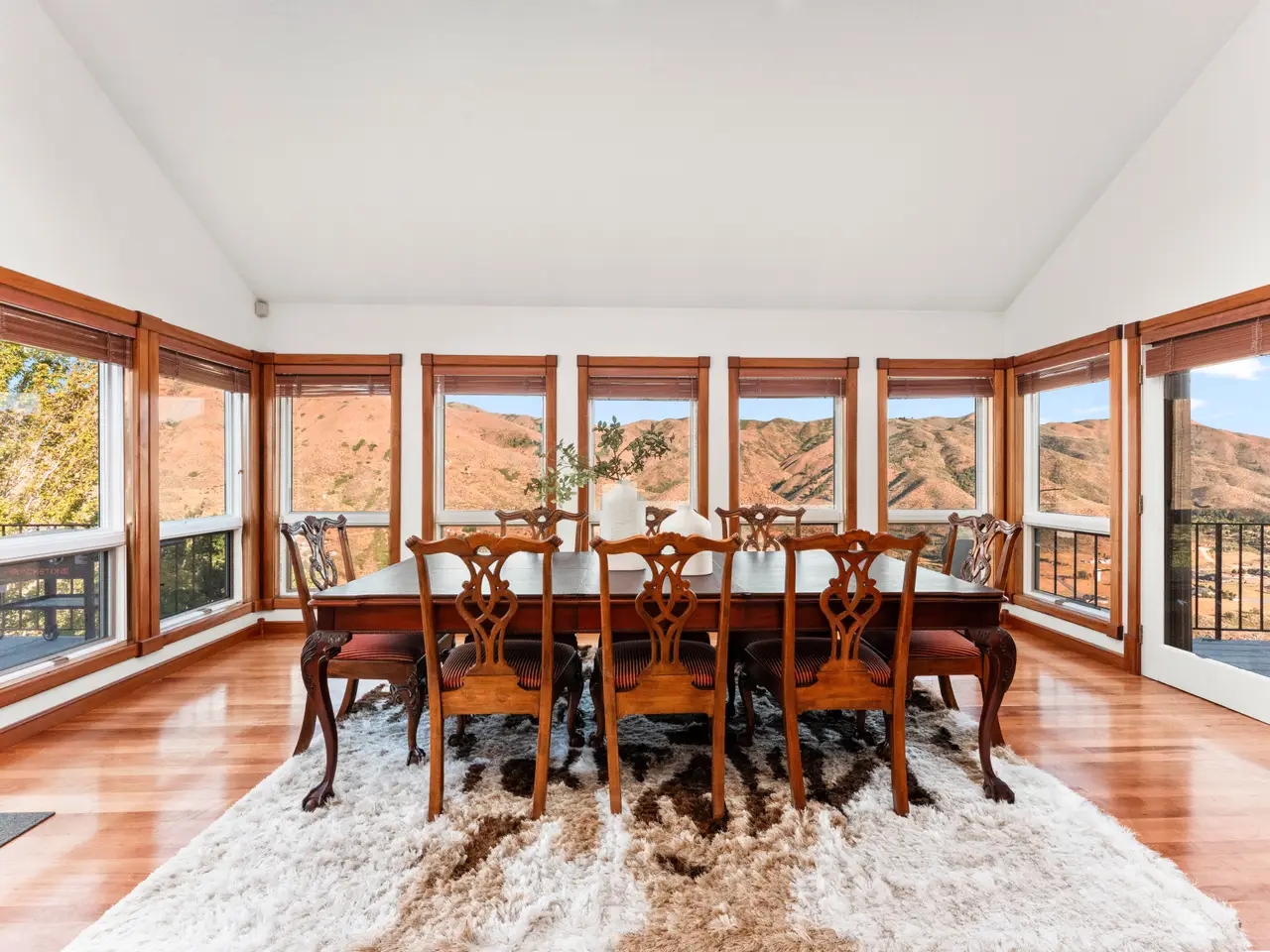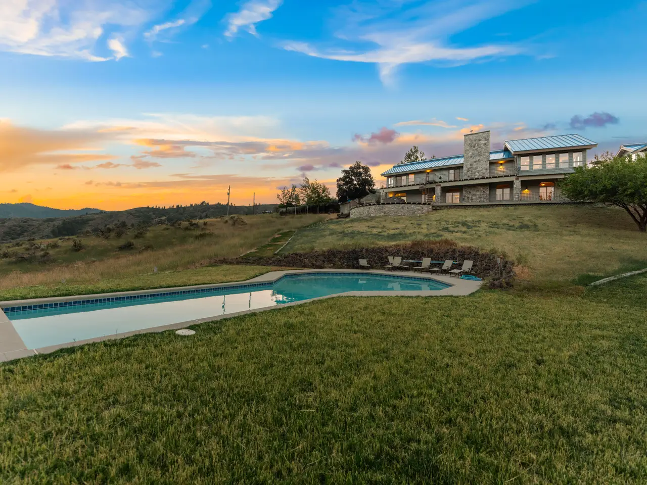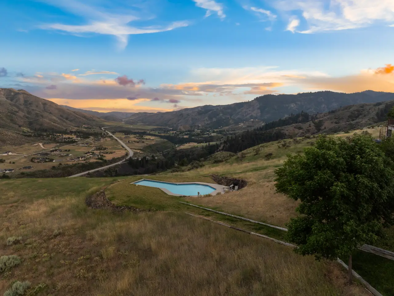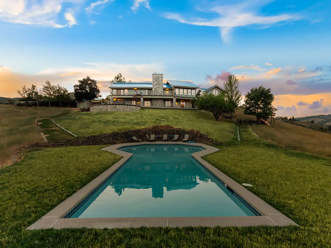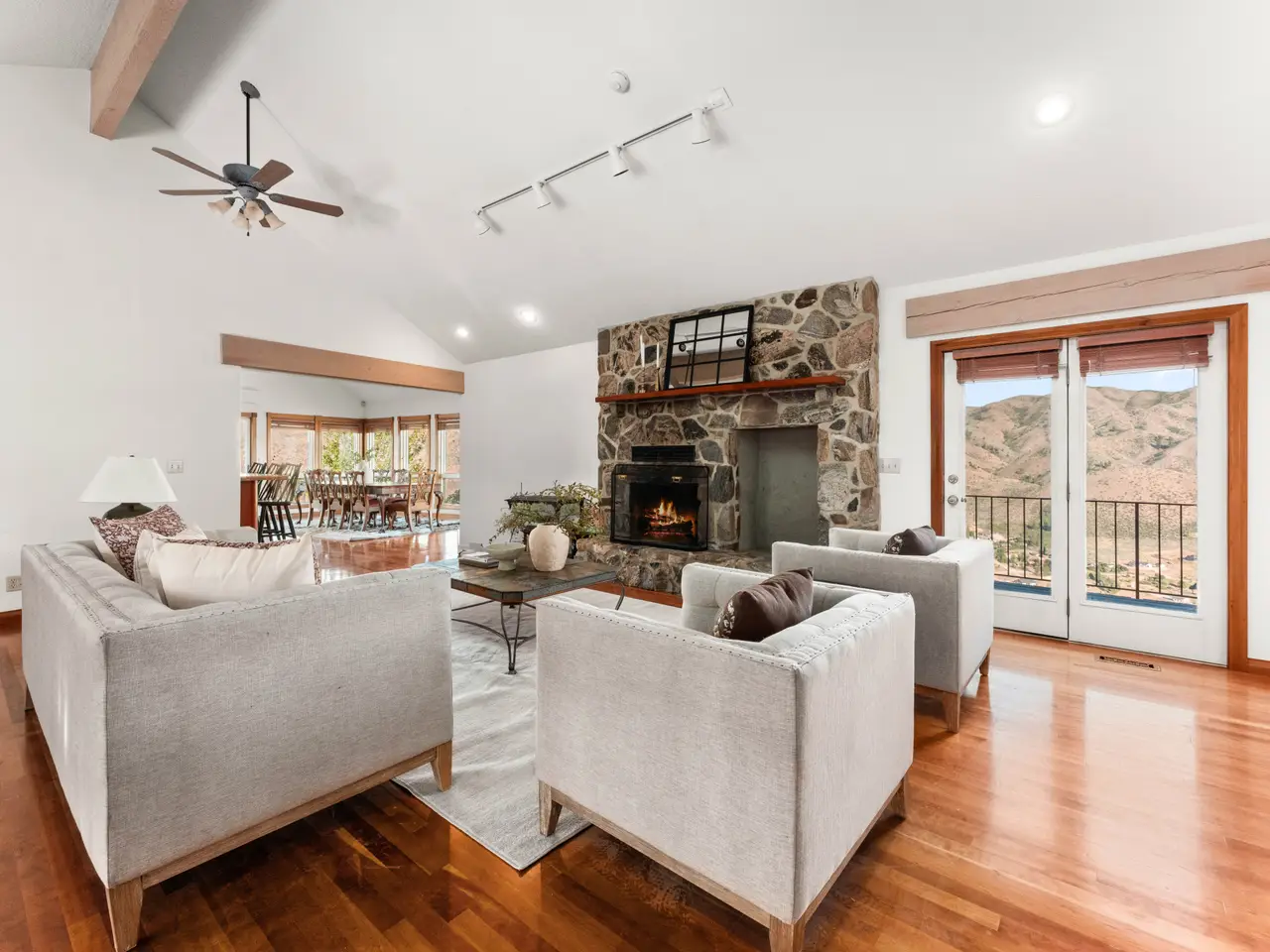 Experience over 17 acres of rural Idaho living, just 35 minutes from Boise with sweeping views of the Sawtooth Mountain Range in every direction! This charming mountain estate offers a spacious main residence and a flexible guest house/ADU. A 24’x47’ in-ground pool overlooks the endless mountain range. The interior features hardwood flooring, intricate mahogany woodwork, cathedral ceilings with exposed wood beams, and expansive architectural windows that frame the natural landscapes. Main-level master suite features direct balcony access, dual walk-in closets, and spacious en suite bathroom. On the lower level, enjoy a vast bonus room with a wet bar, a cozy library, three additional guest bedrooms and a newly renovated bathroom. The elevated guest house offers open-concept living, dining, and kitchen area, a secluded bedroom, and a full bathroom. Minutes from hiking, biking, hunting, & Lucky Peak dock access. HOA maintains roads for year round ease. Steel roof with 30 yr warranty & 500 gal propane tank.