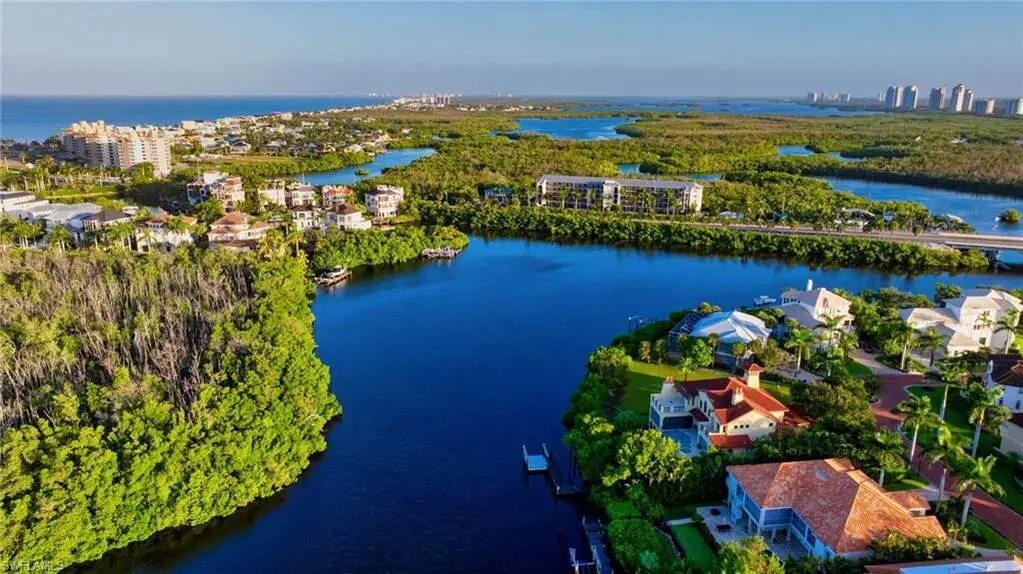 COVETED Southport on the Bay Grand Home, featuring 8 car garage, gorgeous SW exposure, waterfront with Mangrove and wooded views, 2 slip IPE dock with direct/no bridge gulf access and deeded beach access at Barefoot Beach! Succulent interior and design by Freestyle Design in Naples, this beautiful home boasts 4 bedrooms, all ensuite each with access to private balconies. The elevator is a superior convenience from the ground floor garage area. Step into this luxurious masterpiece with stunning ceiling treatments to Travertine flooring throughout the common areas and onto the fabulous outdoor living space. Delectable delights are inspired in the extensive kitchen complete with butler's pantry and 2 dishwashers, featuring Miele and Wolf appliances, anchored by a huge masterfully created island. The beautiful living room features a soaring ceiling and centers around an Italian tiled fireplace that mimics the gorgeous Italian tile you will find throughout the home. Outdoor living is a major component to SWFL lifestyle and this beautiful home features one of the finest spaces you will find, with an outdoor kitchen, fireplace wall and loads of entertaining space covered and open, you will feel as though you are on holiday any day the year! The heated, infinity-edge pool with integrated spa looks over the lake to the mangroves and wooded area beyond and the private outdoor shower provides a sense of serenity. Retractable screens and impact windows offer peace of mind. Southport on the Bay is a double gated community, first through Barefoot Beach entry and then a second gated entry to Southport. Guard patrolled and perfectly located close to all the amenities you can imagine; shopping, dining, Arts, trails, the beaches, oh, the fabulous beaches!