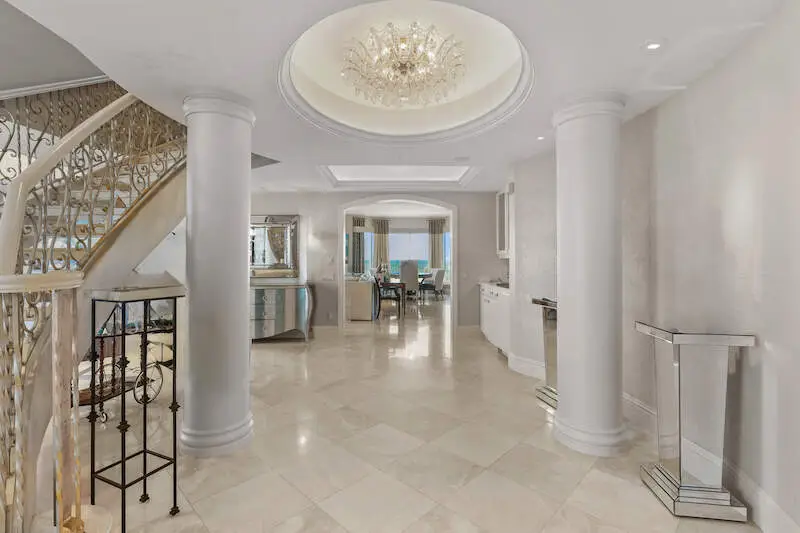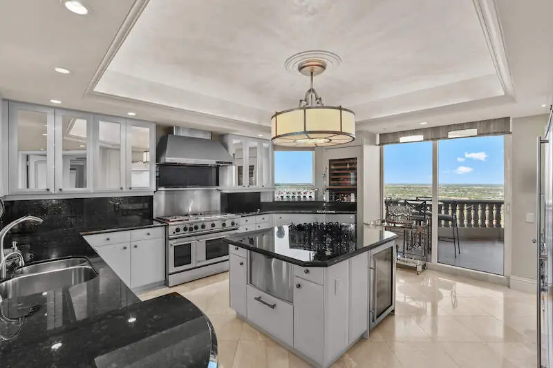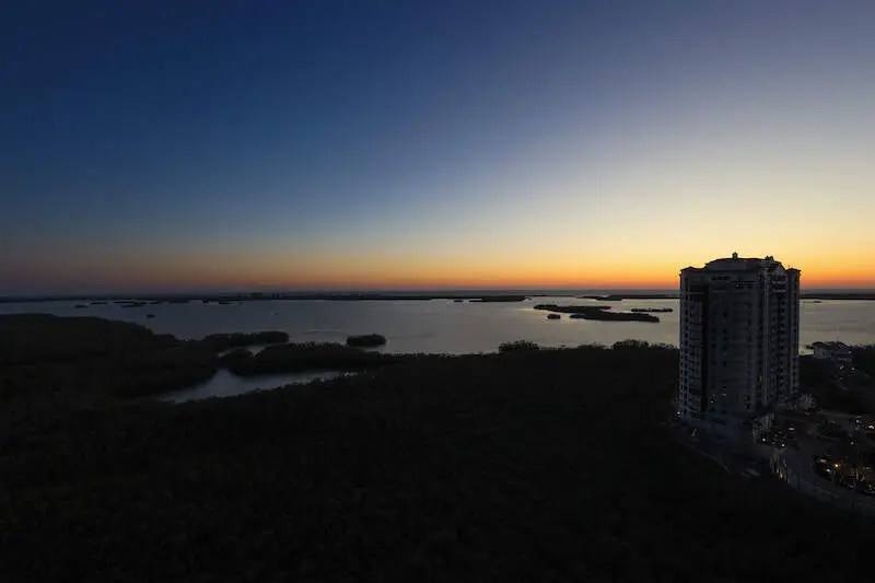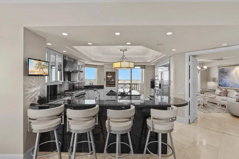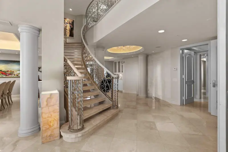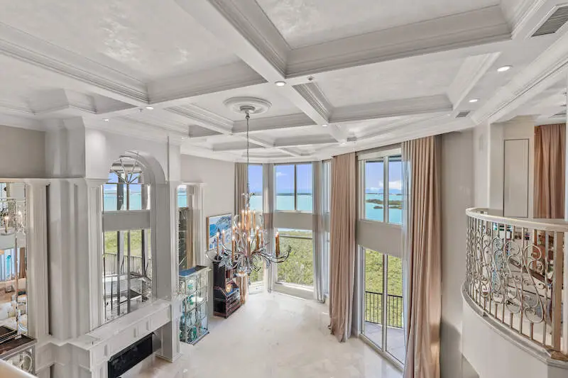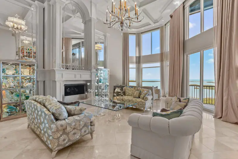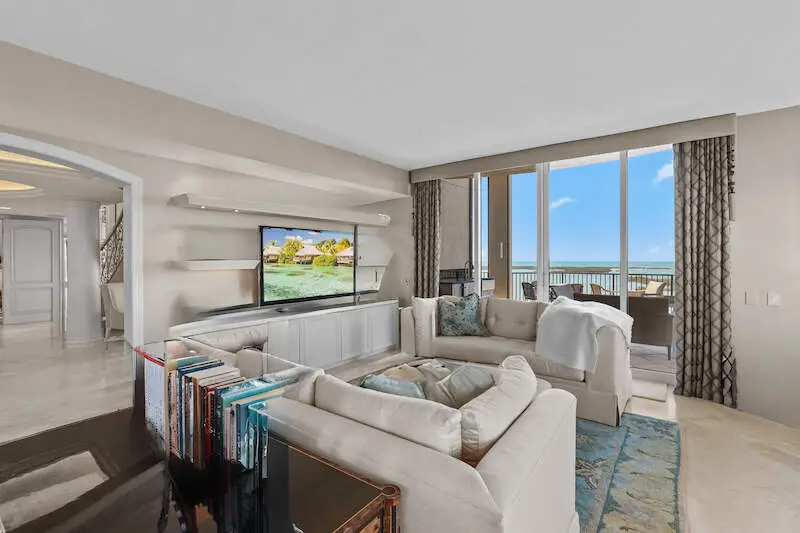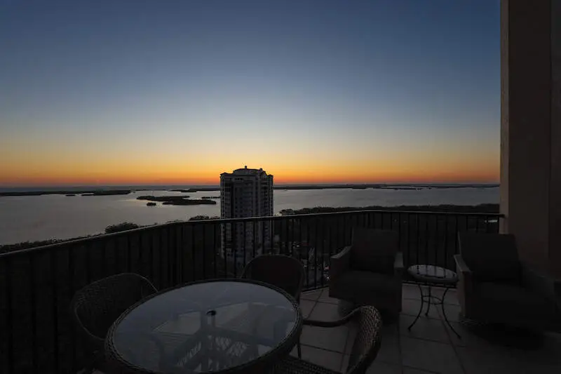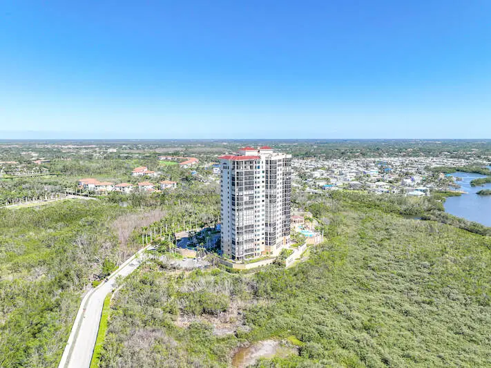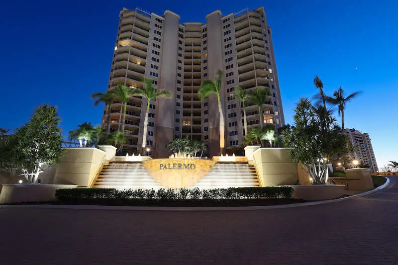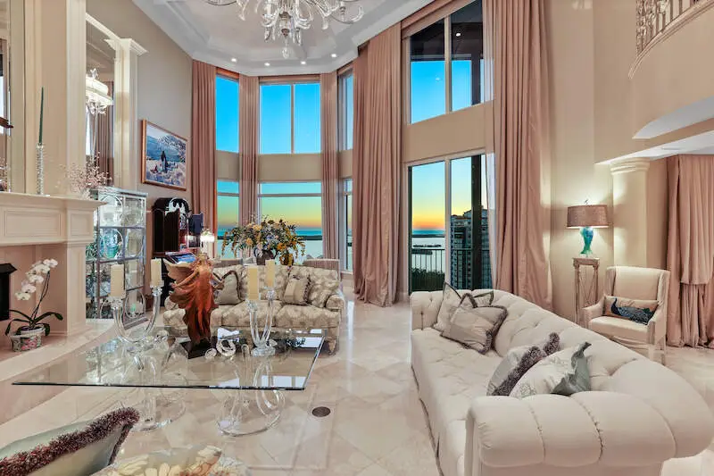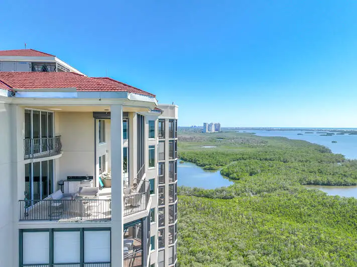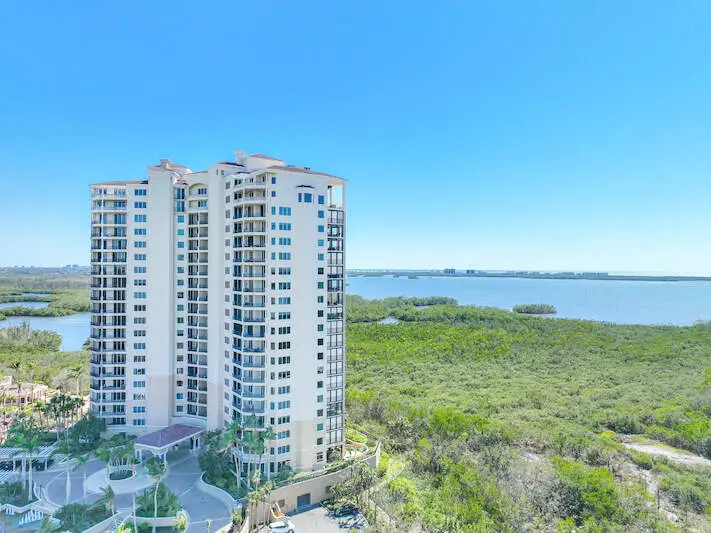 This luxurious two-story penthouse offers sweeping views of Estero Bay and the Gulf of Mexico. Polished marble tile flooring in a beautiful neutral tone creates a luxurious and timeless look. A custom-made curved staircase with wrought iron balusters adds a dramatic touch to the entryway. Soaring windows in the living room with a gas fireplace set the tone for entertaining. Sub-Zero built-in wine locker with temperature and humidity control to store and age your favorite wines. Top-of-the-line appliances, 6-burner gas range, and center island with additional dishwasher. Custom cabinets in the den, family room, library, upgraded lighting, laundry on both floors, and private enclosed two-car garage with storage. Your most discerning buyers will fall in love. Palermo has two guest suites, a theater, billiards, a pool/spa, a BBQ pavilion, a fitness center, front desk staff, and an on-site building manager. Residents of The Colony enjoy private membership to a waterfront dining facility, The Bay Club, with exceptional views with sunset dining/entertainment. Experience a full array of amenities such as kayaking, canoeing, sailing, bocce, tennis, pickleball, and the private beach park accessed by water taxi. 15 minutes to the airport.