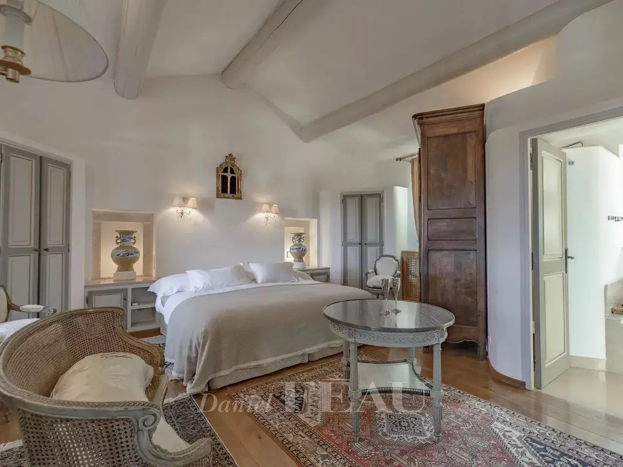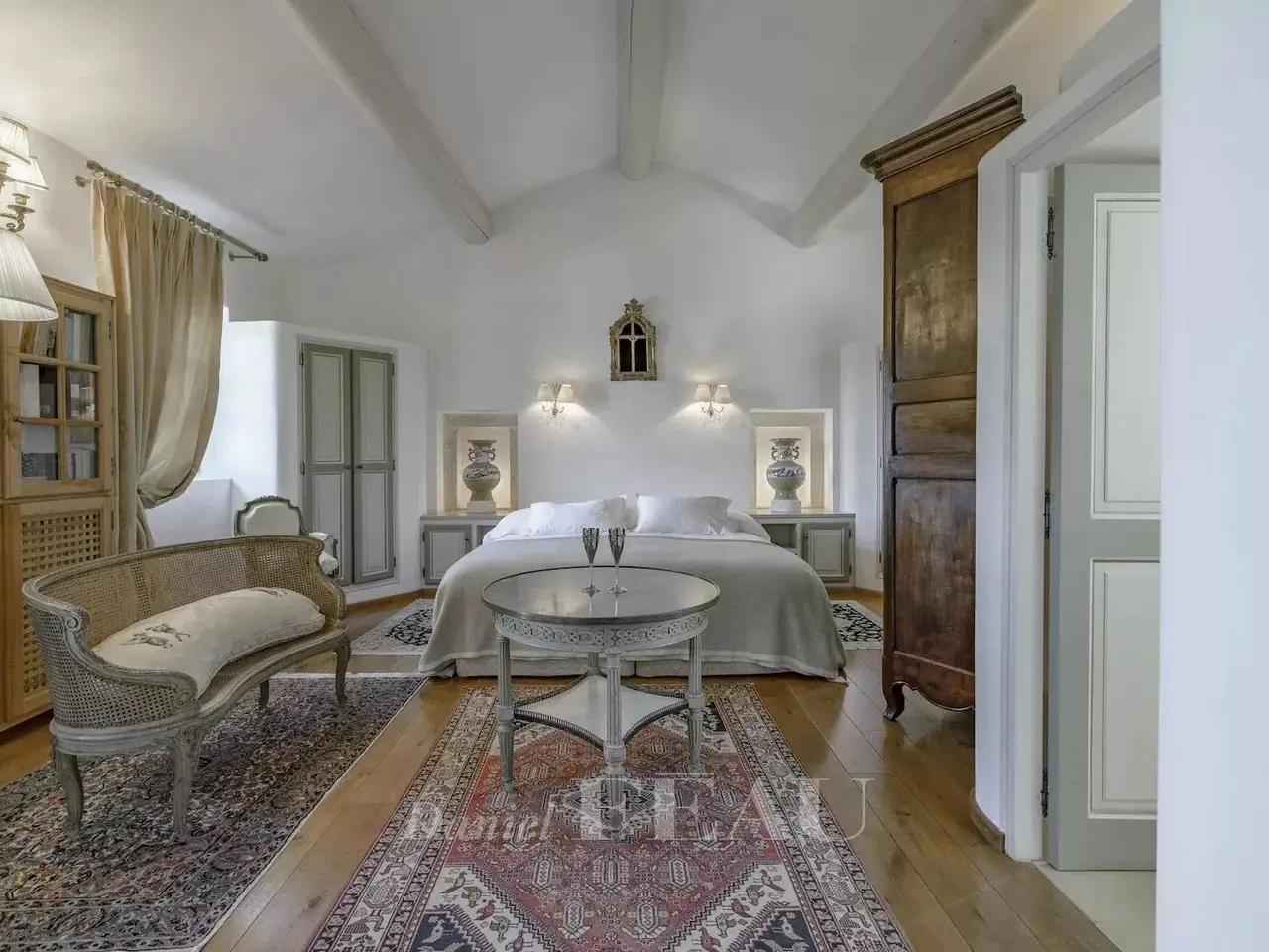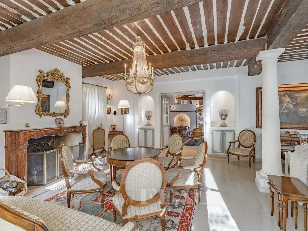 In a privileged location just a few minutes from hilltop Bonnieux village and 20 minutes from Gordes, this elegant and peaceful 18th century “mas” offers about 630 sqm of living space. It is set in over 1 hectare of landscaped grounds planted with olive and cherry trees, with terraces offering an exceptional panoramic view of the Luberon Valley and the neighbouring villages. Tastefully restored bringing contemporary comfort allying with authentic period charm, it includes a triple living/reception room, two kitchens, and a ground-floor bedroom. Five further bedrooms including four suites, and a boudoir are upstairs. It would be easy to divide the property into two separate houses for two families. An extensive water feature surrounded by olive trees contributes to the exceptional charm of this authentic property.