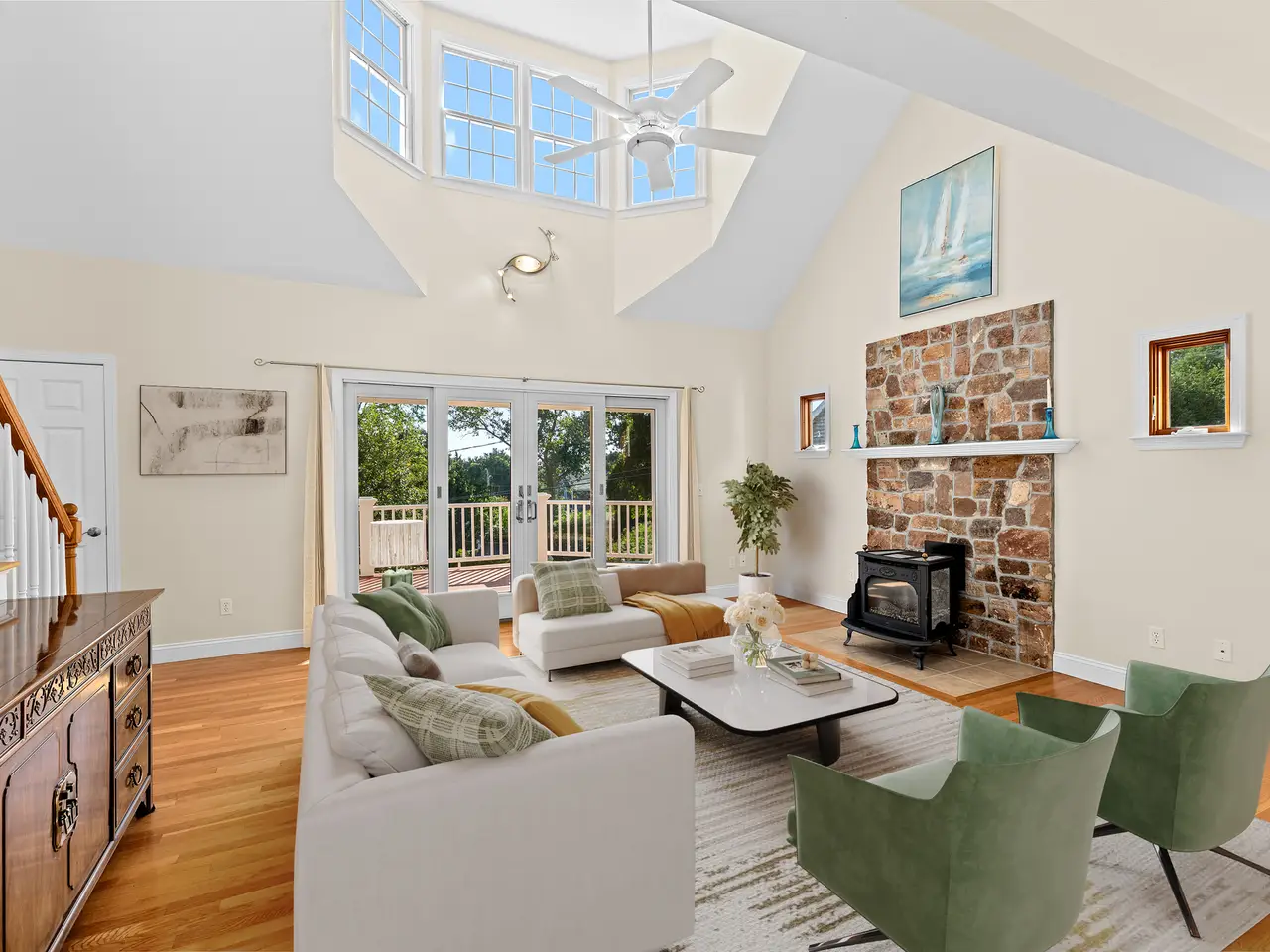 Tucked down a charming gravel lane close to the beach, with tennis, pickleball, canal fishing, and bike rides nearby. The open-concept main level features a kitchen with stainless appliances, gas stove, and door to the yard plus decks and patios. The dining and living area offers a gas fireplace and French doors opening to a sunlit front deck. A bedroom, spacious laundry room, and versatile den/office complete the first floor. Upstairs boasts a loft-style living space ideal for a second family room or guest overflow, plus two additional bedrooms and two full baths. Upgrades include abundant closets, a new gas furnace, hot water tank, and a dumbwaiter. The basement includes two garages and a half bath. Passing Title V—no flood insurance required.
