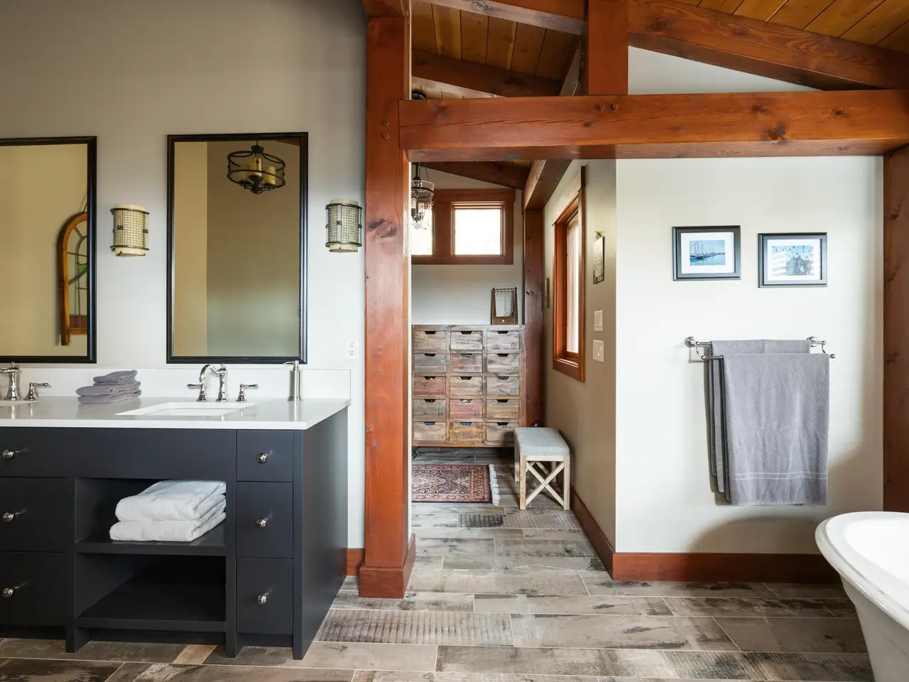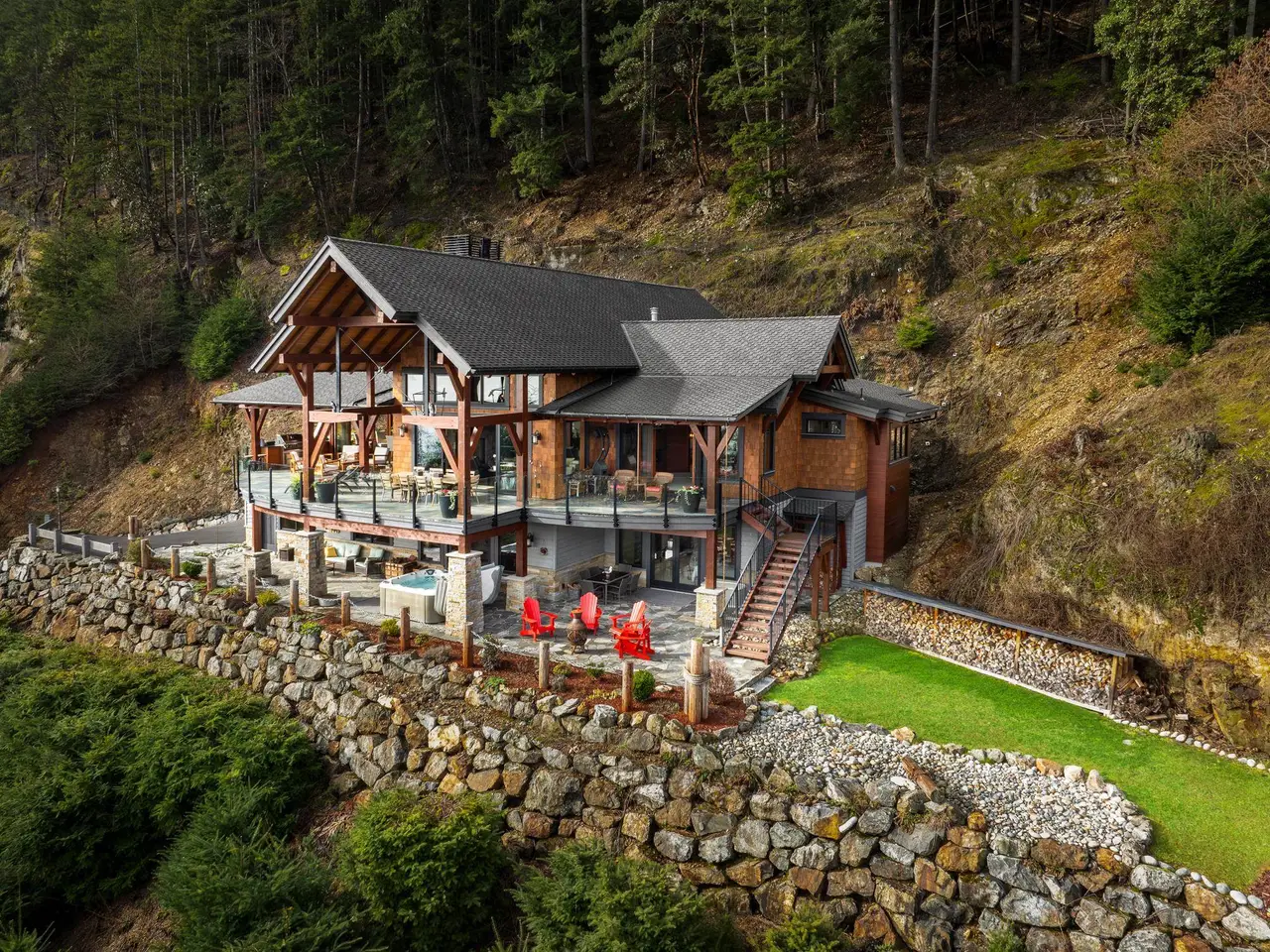 This stunning ocean view property featuring a masterpiece of engineering, custom built, Canadian Timberframe Ltd home is ready to welcome a new family. The expansive timber peaks & over 1100 sq.ft. covered entertainment deck sets it apart. The open plan main floor boasts timberframe ceilings soaring over 24'. Custom Loewen Douglas Fir interior/metal exterior windows & doors, engineered Hickory flooring & exclusive lighting compliment the space. Chefs will covet the gourmet kitchen with state of the art appliances & expansive Quartz countertops. Main level primary bedroom, ensuite & walk in closet showcase the cathedral timberframe ceilings. A special retreat w/floor to ceiling fireplaces & private decks overlooking ocean, mountain and coastal views. Vancouver within easy reach.
