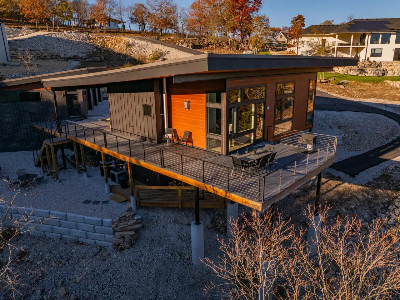 Welcome to this exclusive Modern Lakefront home that features clean lines, open floor plan, and a minimalist aesthetic, with an emphasis on natural light. This custom home was completed in 2024, sits on nearly an acre and combines classy contemporary features, offering a perfect blend of style and comfort. Explore the wet weather creek as you walk to a secluded cove which is a short walk from your private fire pit area bordered by 1.5 acre greenspace. Step inside to discover an open floor plan that seamlessly integrates living, dining, and kitchen areas with plenty of outdoor living space. The property boasts a serene setting with stunning views of Table Rock Lake and the surrounding forest, providing a tranquil backdrop for daily living and weekend getaways. Enjoy the outdoor lifestyle regardless of weather as the outdoor spaces include a colossal deck upstairs, and a large, covered deck downstairs, ideal for entertaining or relaxing. The 2nd kitchen downstairs makes entertaining a breeze. The versatile layout of this 3000+ square foot home includes 3 bedrooms, 2 1/2 baths, with a main level master bedroom, a sitting room and laundry room close to the master bedroom. Want more? Oversized 3 car detached garage, Storm Shelter, large mechanical room/workshop room in basement and huge driveway with plenty of room for toys and large vehicles. Parking for everyone. Conveniently located in the sought-after Lake Forest Hills neighborhood near Branson West with easy access to main routes to Springfield and Branson, Situated in a safe, friendly neighborhood, you'll enjoy peace of mind and the opportunity to explore Table Rock Lake and the Ozarks with Ease. (10X28 Boat Slip available for purchase separately as personal property for $65k)Offered fully furnished. Feature Sheet attached as a document