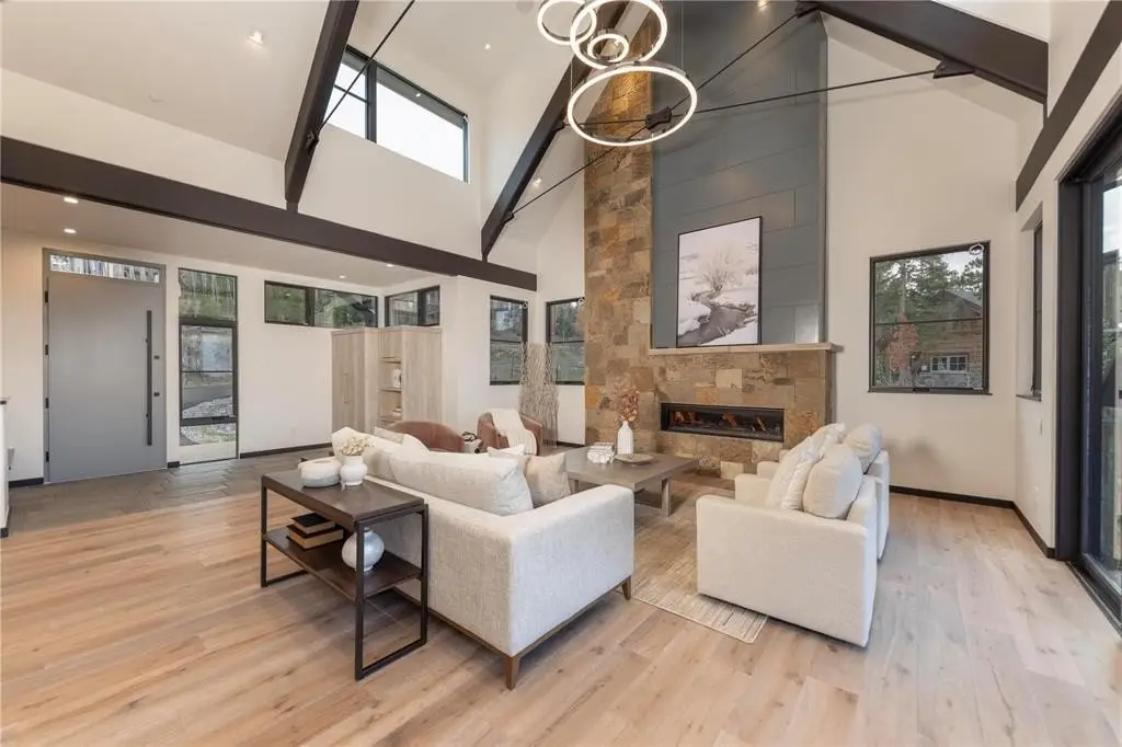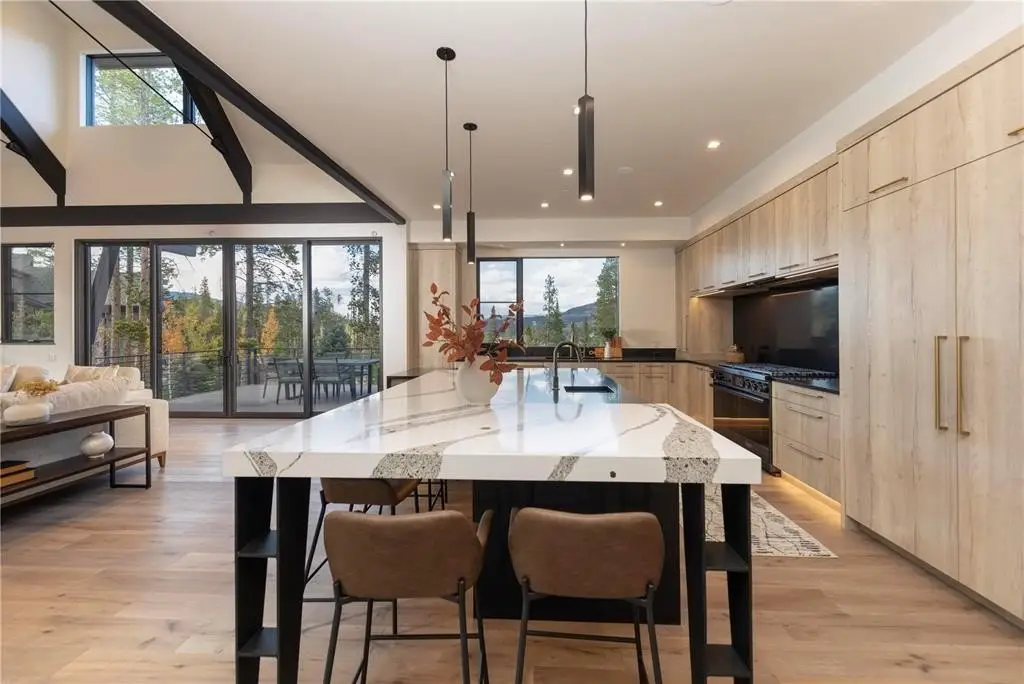 Welcome to this stunning new Allen/Guerra designed masterpiece nestled amidst the serene grandeur of the mountains and seamlessly integrated into the picturesque landscape of the prestigious, Jack Nicklaus signature Breckenridge Golf Course. This architectural treasure seamlessly blends mountain modern design with the picturesque beauty of its surroundings, offering an unparalleled living experience for those seeking a luxurious retreat. Large windows strategically placed throughout the home invite abundant natural light to flood the interior spaces, blurring the boundaries between indoors and outdoors and providing panoramic views of the protected mountain corridor. Step inside, and you are greeted by an open-concept layout that emphasizes spaciousness and fluidity. The interior design showcases custom steel beam work, stacked stone, unique sports bar, stunning glass wine room and multi-level outdoor living areas for everyone to enjoy.