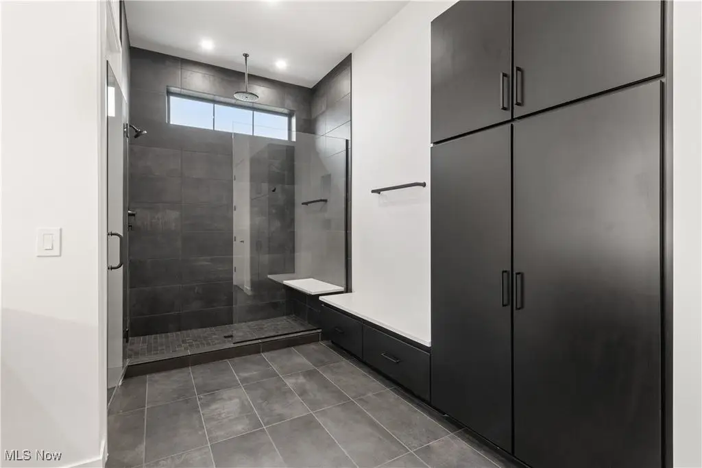 Luxury bath with tiled shower and frameless glass door