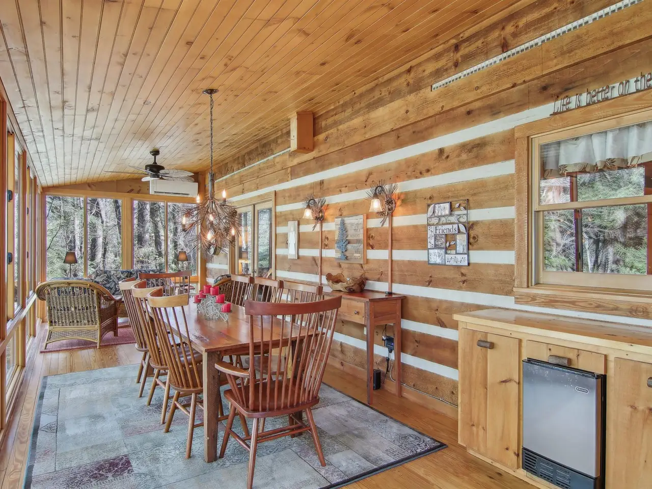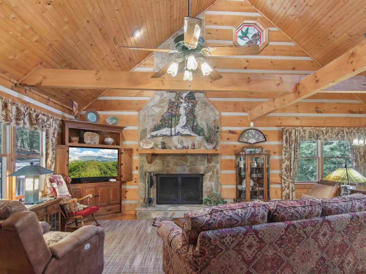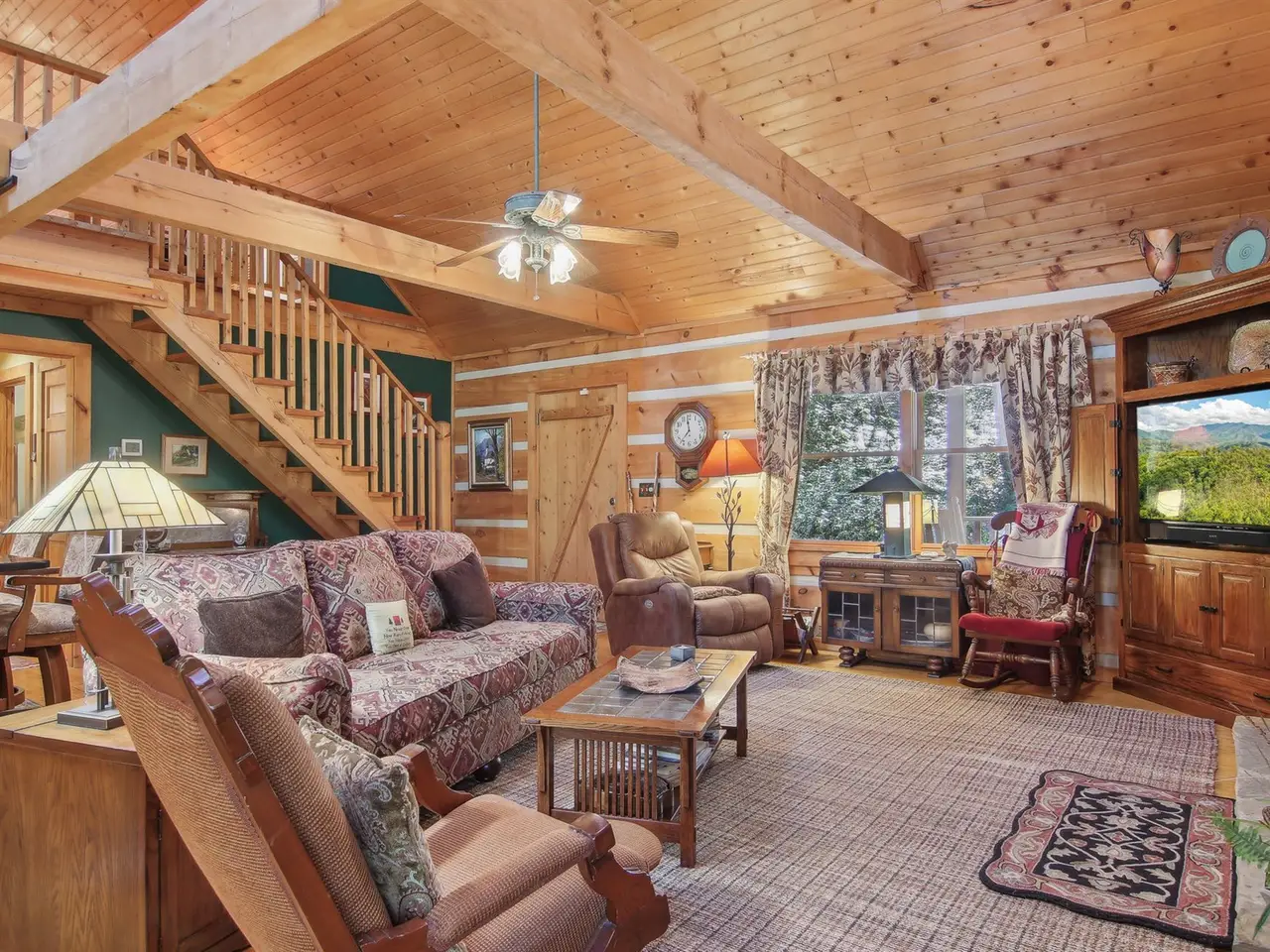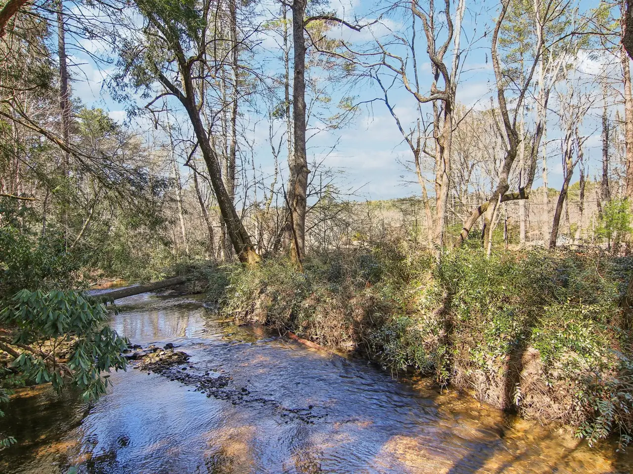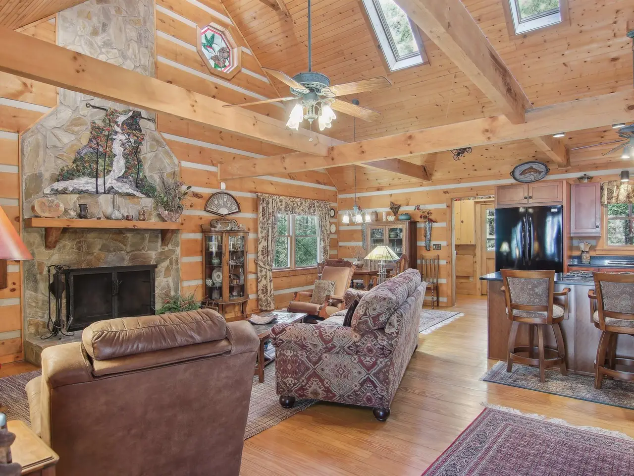 Appalachian-style log home with a separate workshop/office on 2.76 acres. The main house features an open floor plan w/skylights, 2 bedrooms and full bath on the main, a spacious loft/bedroom w/full bath, and a 4-seasons room spanning the back with dining and seating areas. Back decks w/6-person hot tub lead to a stone path to the Little River headwaters and a gazebo with electricity, perfect for relaxing or entertaining by the water. The guest house includes a workshop on the main level w/half bath. Upstairs is a finished office/studio with 3rd full bath and 3 skylights. Located in desirable Cedar Mountain, this rare property works as a primary residence, vacation home with rental potential. Both main cabin and office suite can be offered furnished. Additional lot available with RV hook up. Septic permit just expanded to a 4 bedroom so the garage apartment can be added as a bedroom.