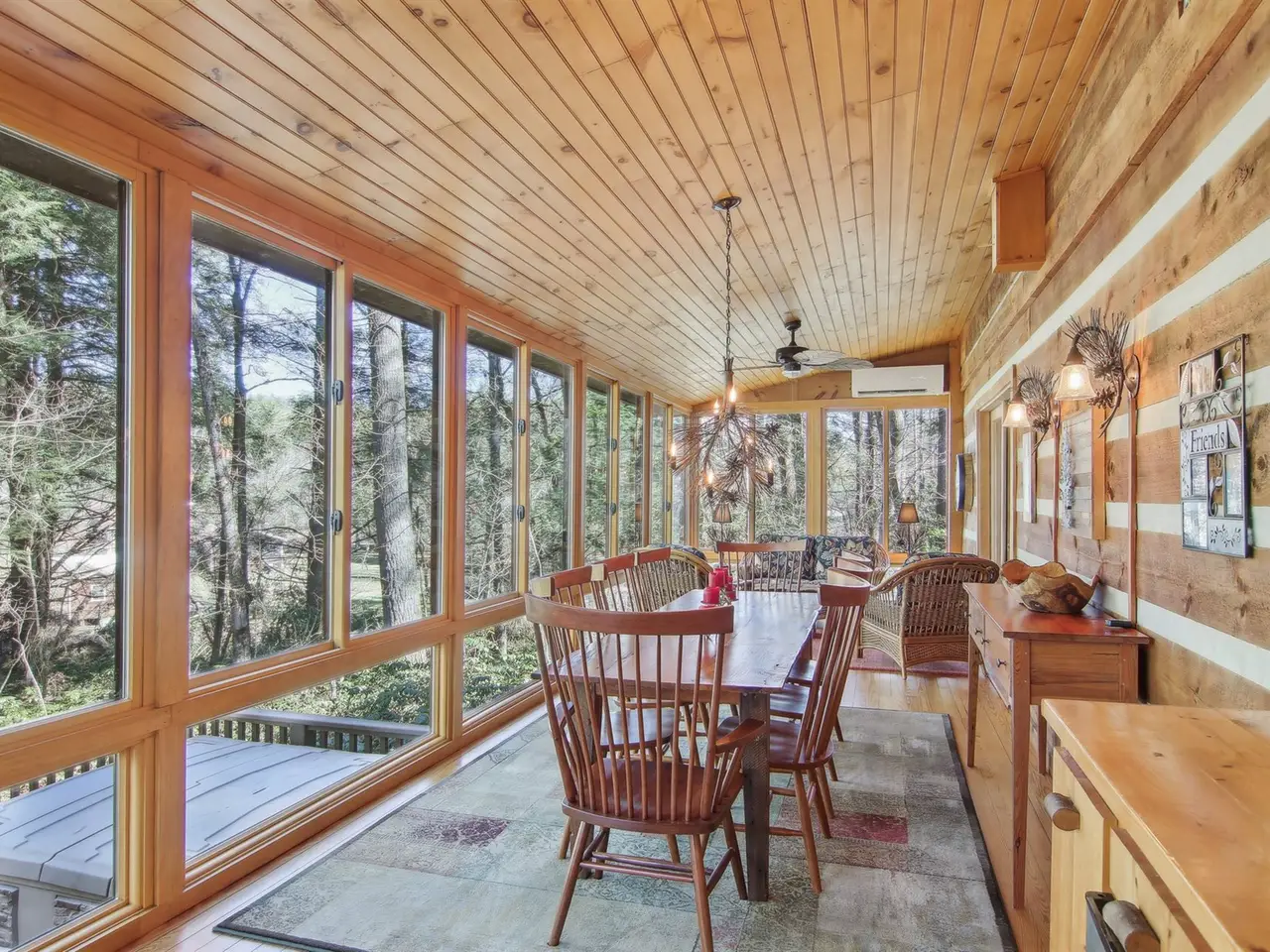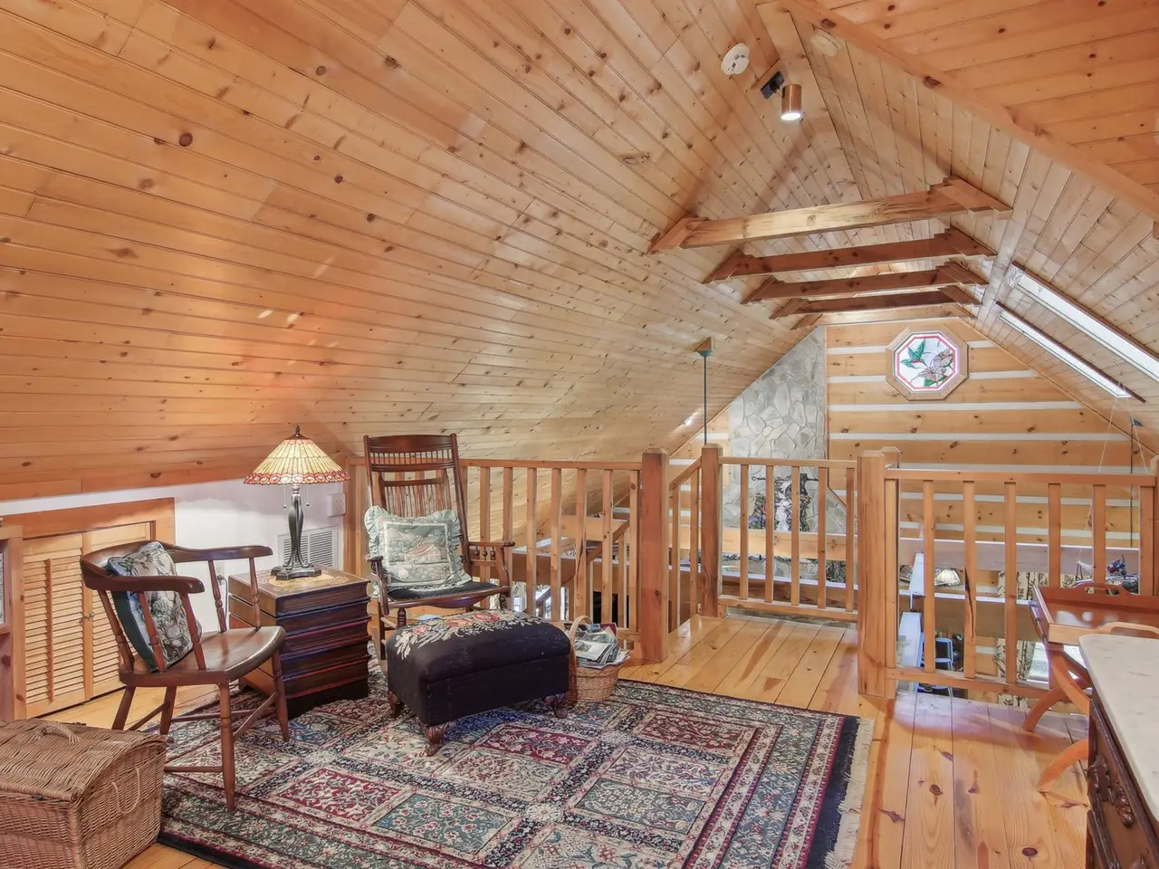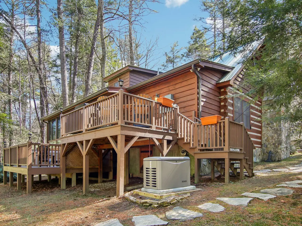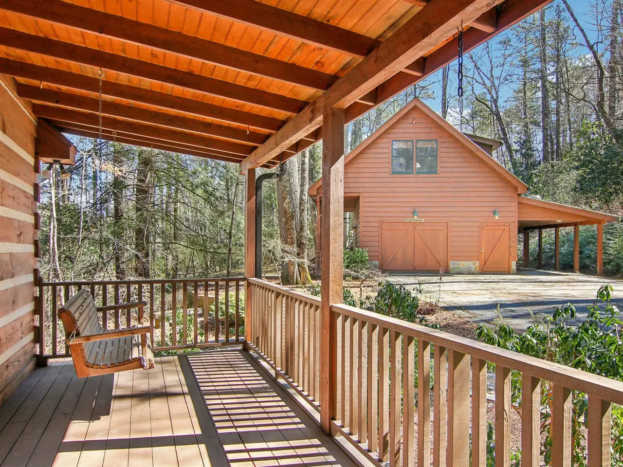 Appalachian-style log home with a separate workshop/office on 2.76 acres. The main house features an open floor plan w/skylights, 2 bedrooms and full bath on the main, a spacious loft/bedroom w/full bath, and a 4-seasons room spanning the back with dining and seating areas. Back decks w/6-person hot tub lead to a stone path to the Little River headwaters and a gazebo with electricity, perfect for relaxing or entertaining by the water. The guest house includes a workshop on the main level w/half bath. Upstairs is a finished office/studio with 3rd full bath and 3 skylights. Located in desirable Cedar Mountain, this rare property works as a primary residence, vacation home with rental potential. Both main cabin and office suite can be offered furnished. Additional lot available with RV hook up. Septic permit just expanded to a 4 bedroom so the garage apartment can be added as a bedroom.