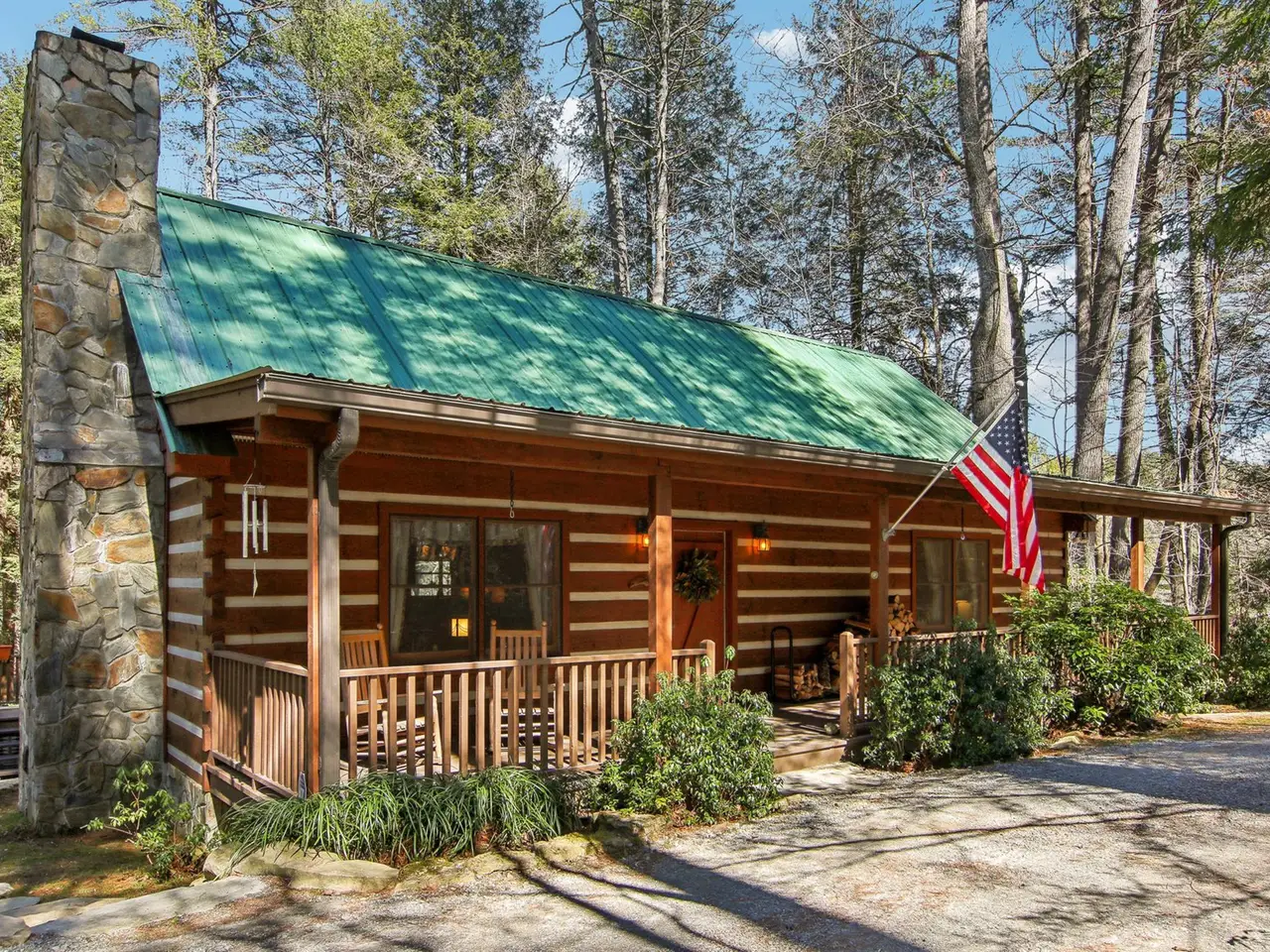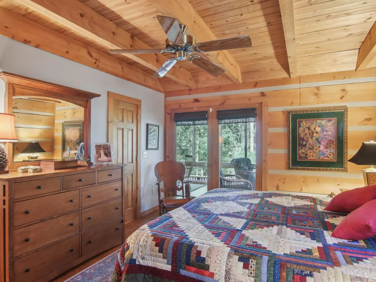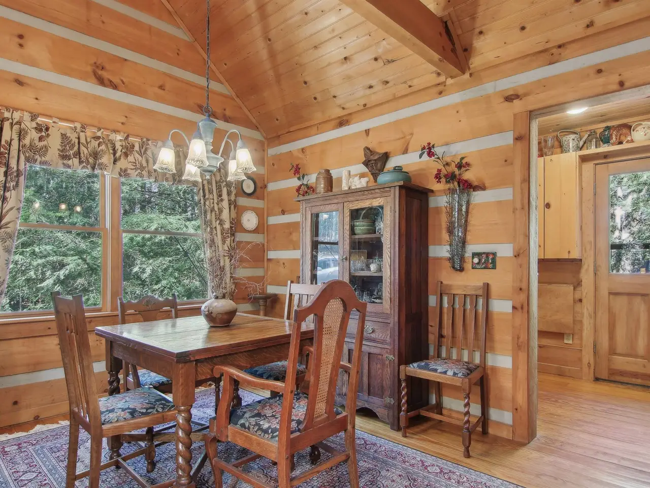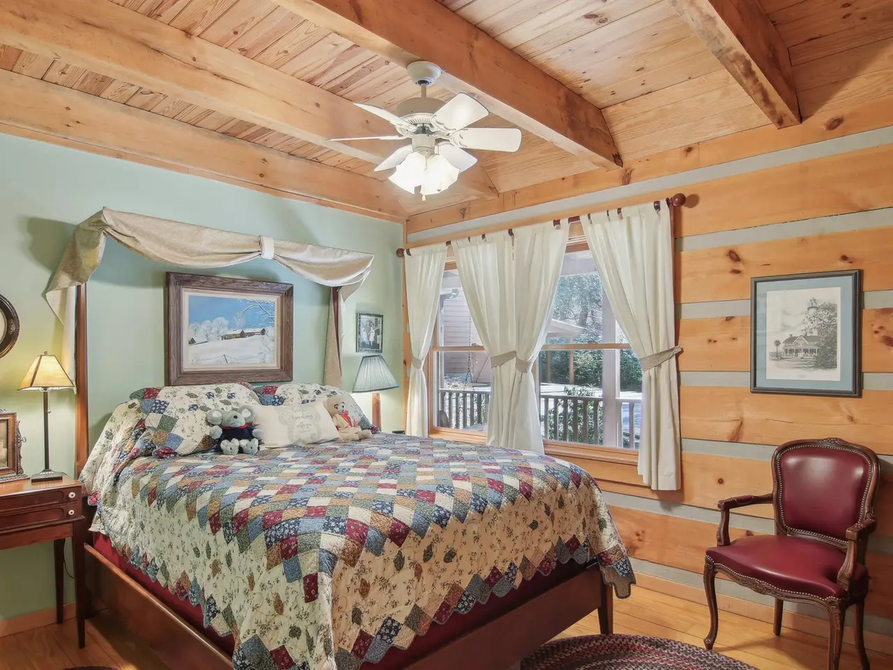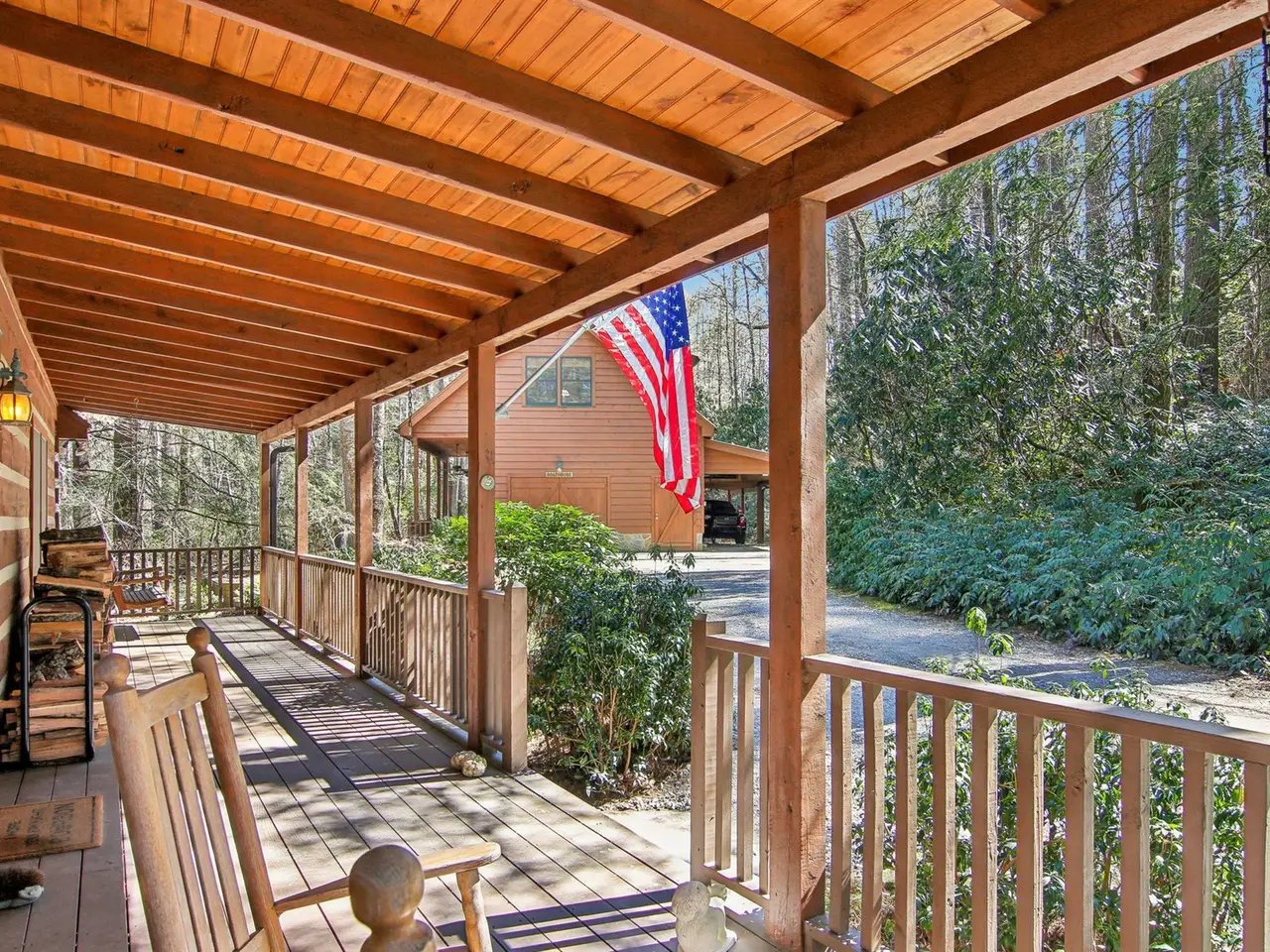 Appalachian-style log home with a separate workshop/office on 2.76 acres. The main house features an open floor plan w/skylights, 2 bedrooms and full bath on the main, a spacious loft/bedroom w/full bath, and a 4-seasons room spanning the back with dining and seating areas. Back decks w/6-person hot tub lead to a stone path to the Little River headwaters and a gazebo with electricity, perfect for relaxing or entertaining by the water. The guest house includes a workshop on the main level w/half bath. Upstairs is a finished office/studio with 3rd full bath and 3 skylights. Located in desirable Cedar Mountain, this rare property works as a primary residence, vacation home with rental potential. Both main cabin and office suite can be offered furnished. Additional lot available with RV hook up. Septic permit just expanded to a 4 bedroom so the garage apartment can be added as a bedroom.