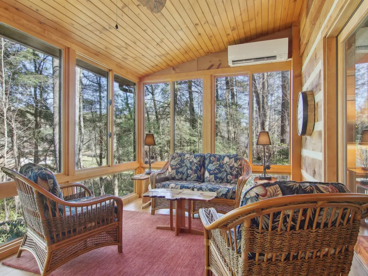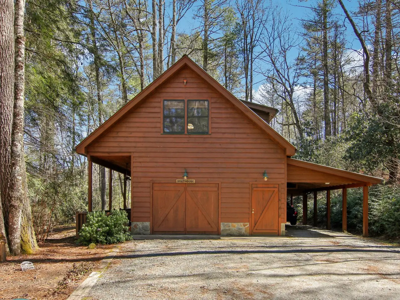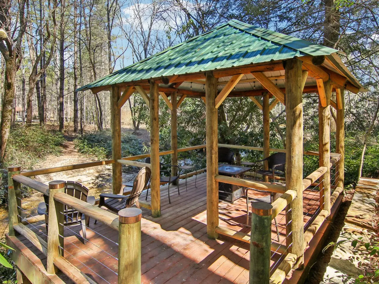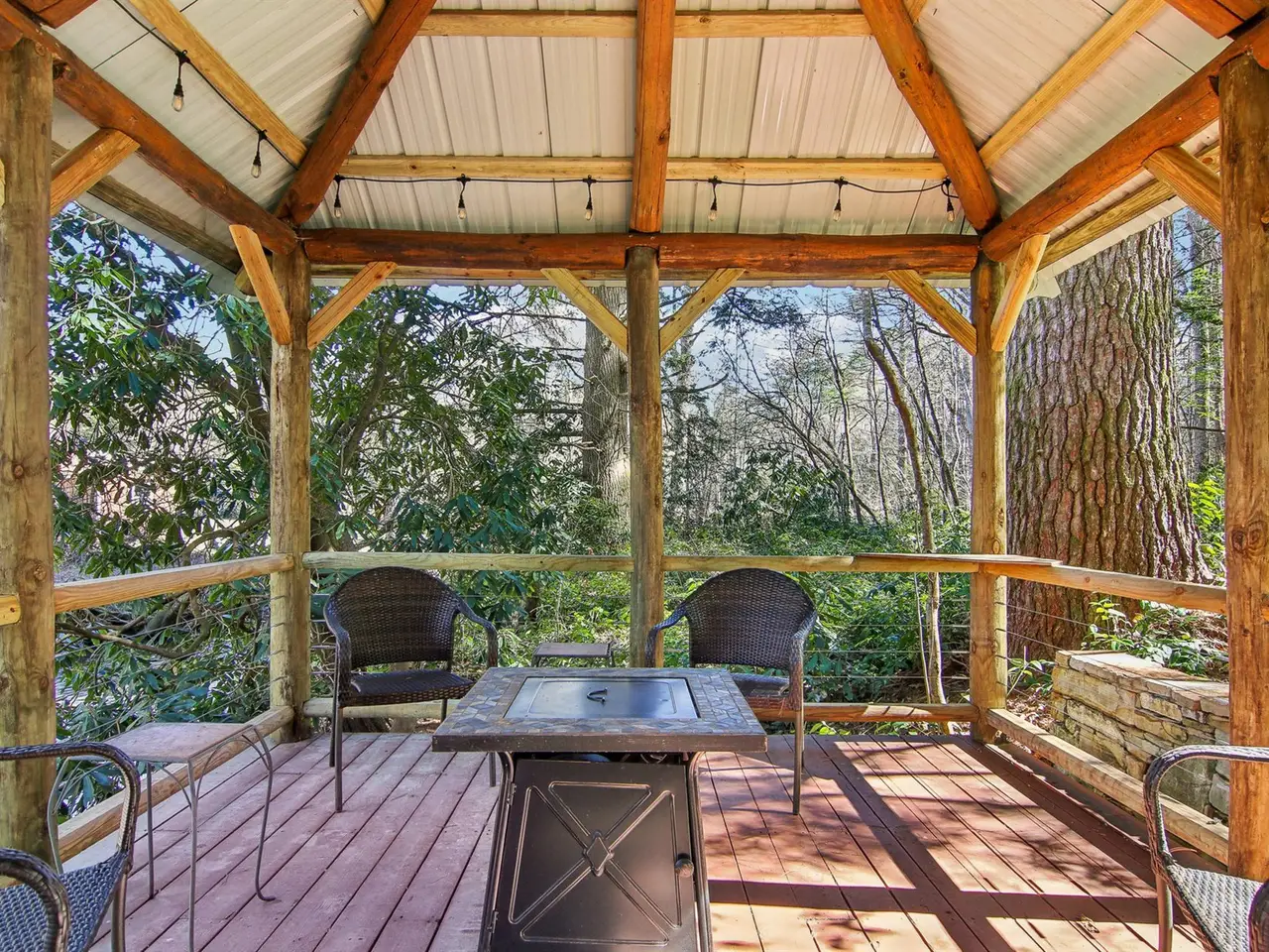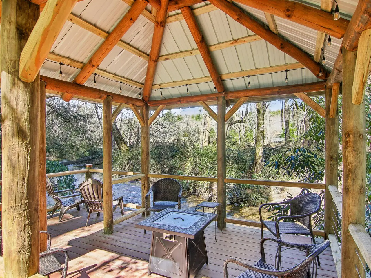 Appalachian-style log home with a separate workshop/office on 2.76 acres. The main house features an open floor plan w/skylights, 2 bedrooms and full bath on the main, a spacious loft/bedroom w/full bath, and a 4-seasons room spanning the back with dining and seating areas. Back decks w/6-person hot tub lead to a stone path to the Little River headwaters and a gazebo with electricity, perfect for relaxing or entertaining by the water. The guest house includes a workshop on the main level w/half bath. Upstairs is a finished office/studio with 3rd full bath and 3 skylights. Located in desirable Cedar Mountain, this rare property works as a primary residence, vacation home with rental potential. Both main cabin and office suite can be offered furnished. Additional lot available with RV hook up. Septic permit just expanded to a 4 bedroom so the garage apartment can be added as a bedroom.
