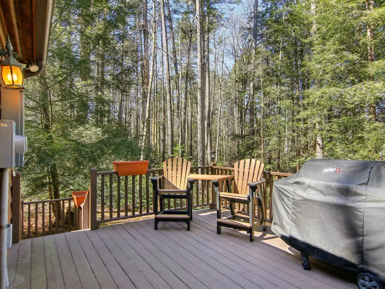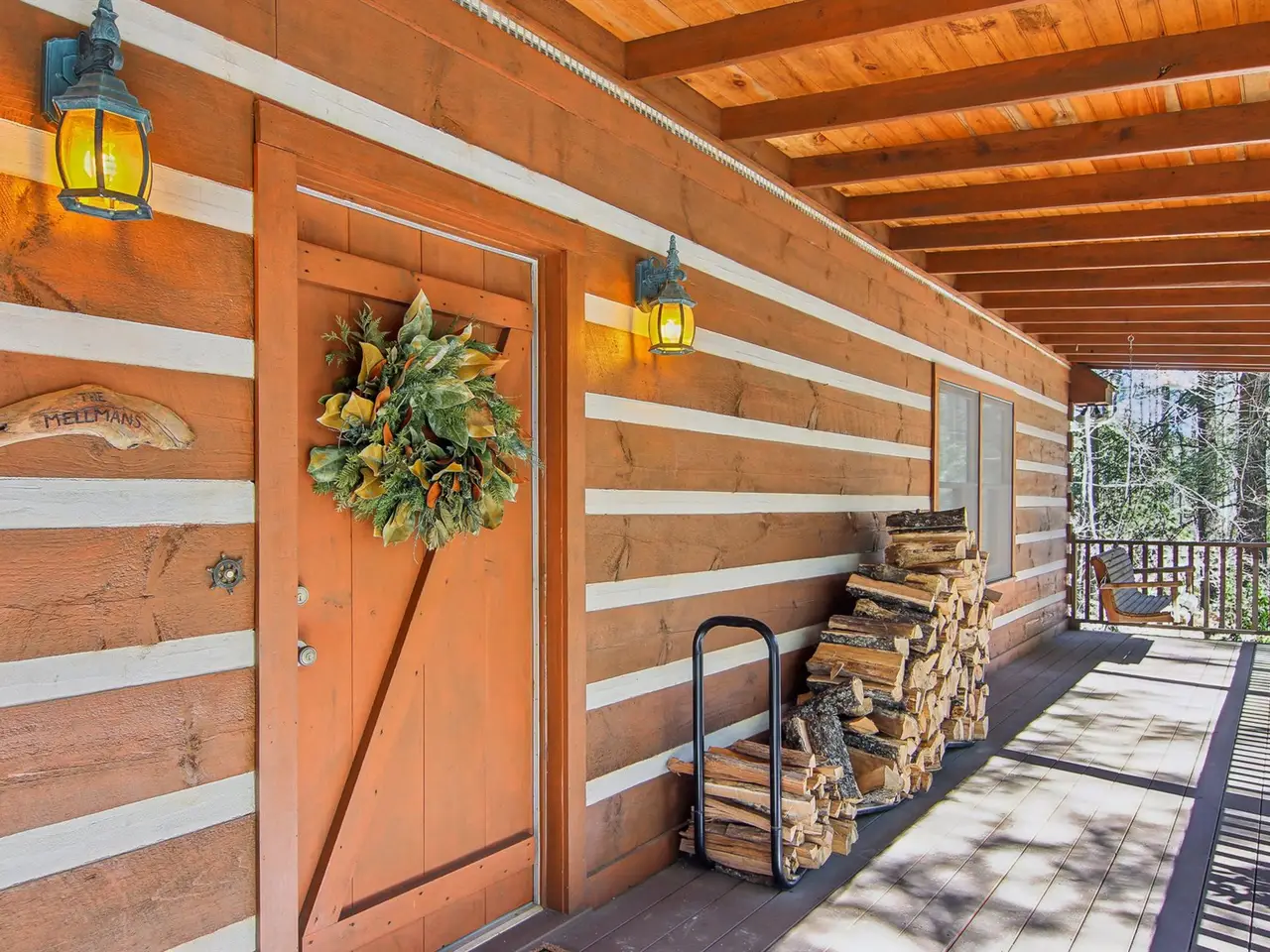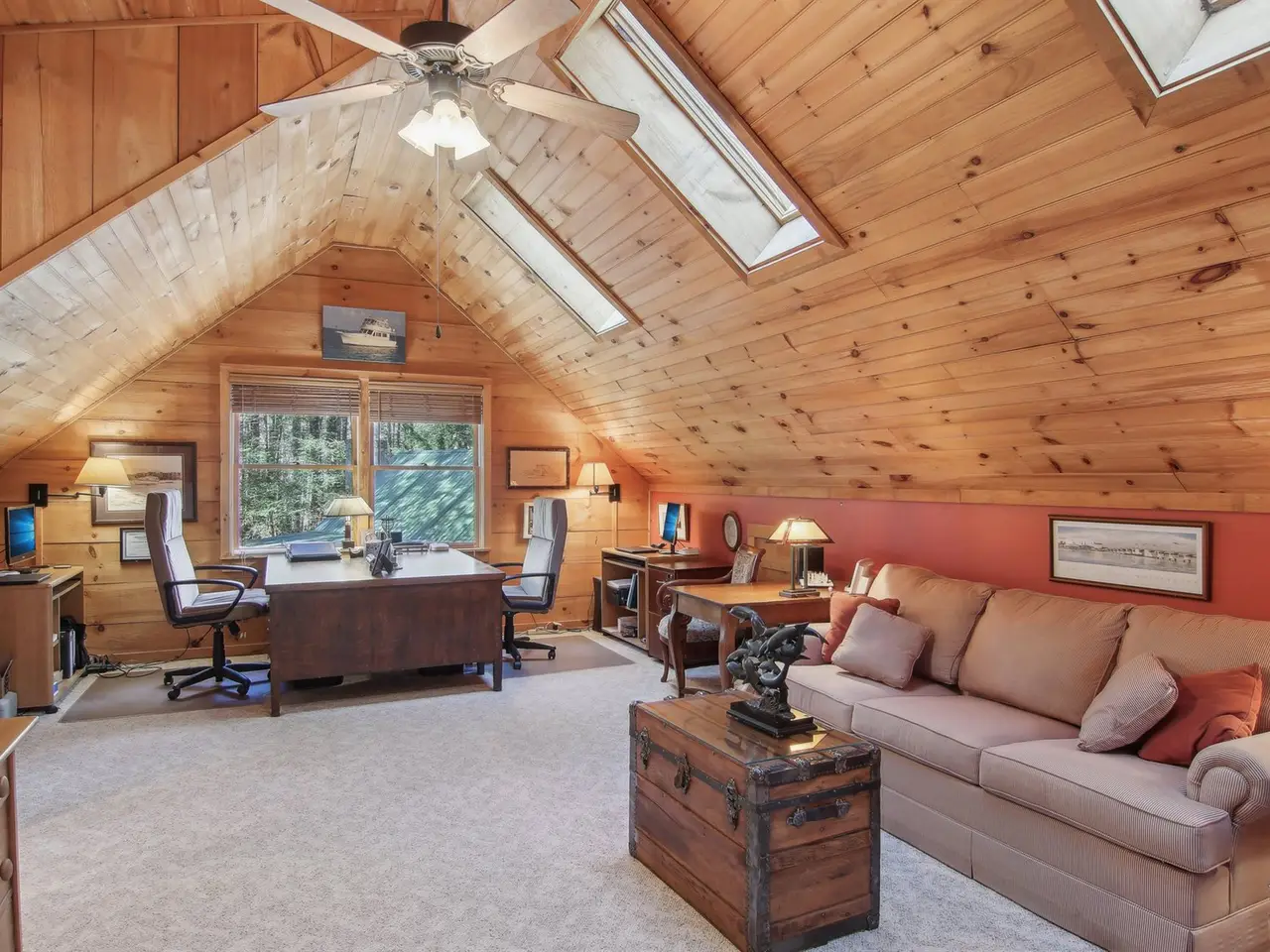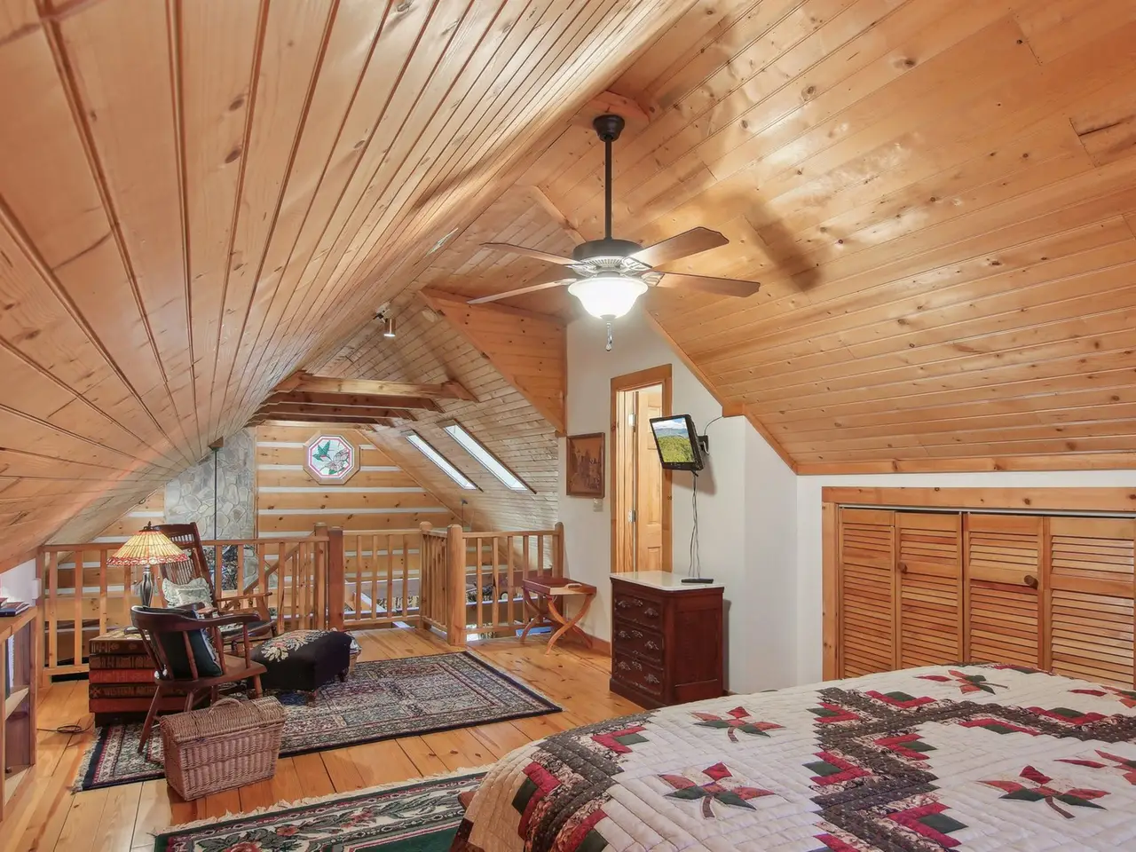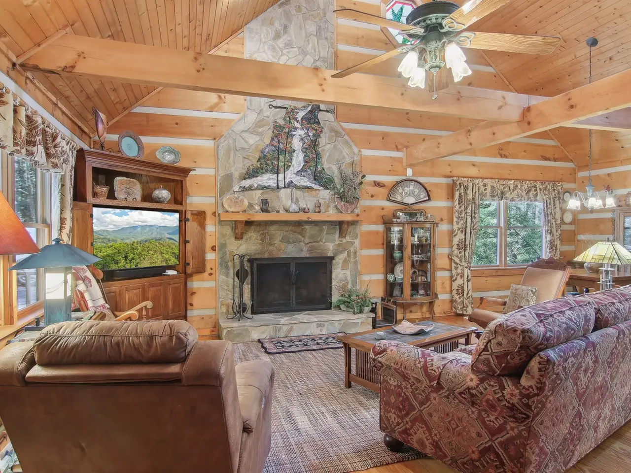 Appalachian-style log home with a separate workshop/office on 2.76 acres. The main house features an open floor plan w/skylights, 2 bedrooms and full bath on the main, a spacious loft/bedroom w/full bath, and a 4-seasons room spanning the back with dining and seating areas. Back decks w/6-person hot tub lead to a stone path to the Little River headwaters and a gazebo with electricity, perfect for relaxing or entertaining by the water. The guest house includes a workshop on the main level w/half bath. Upstairs is a finished office/studio with 3rd full bath and 3 skylights. Located in desirable Cedar Mountain, this rare property works as a primary residence, vacation home with rental potential. Both main cabin and office suite can be offered furnished. Additional lot available with RV hook up. Septic permit just expanded to a 4 bedroom so the garage apartment can be added as a bedroom.