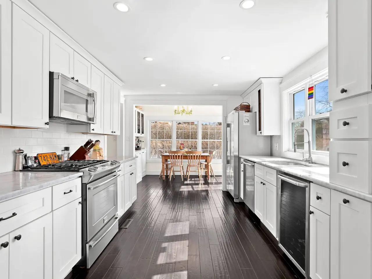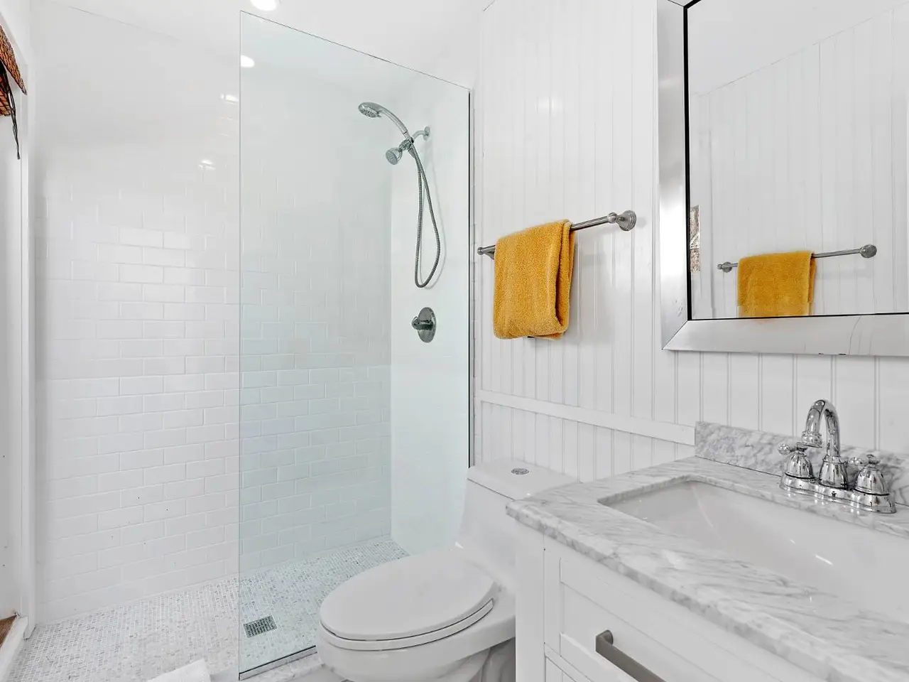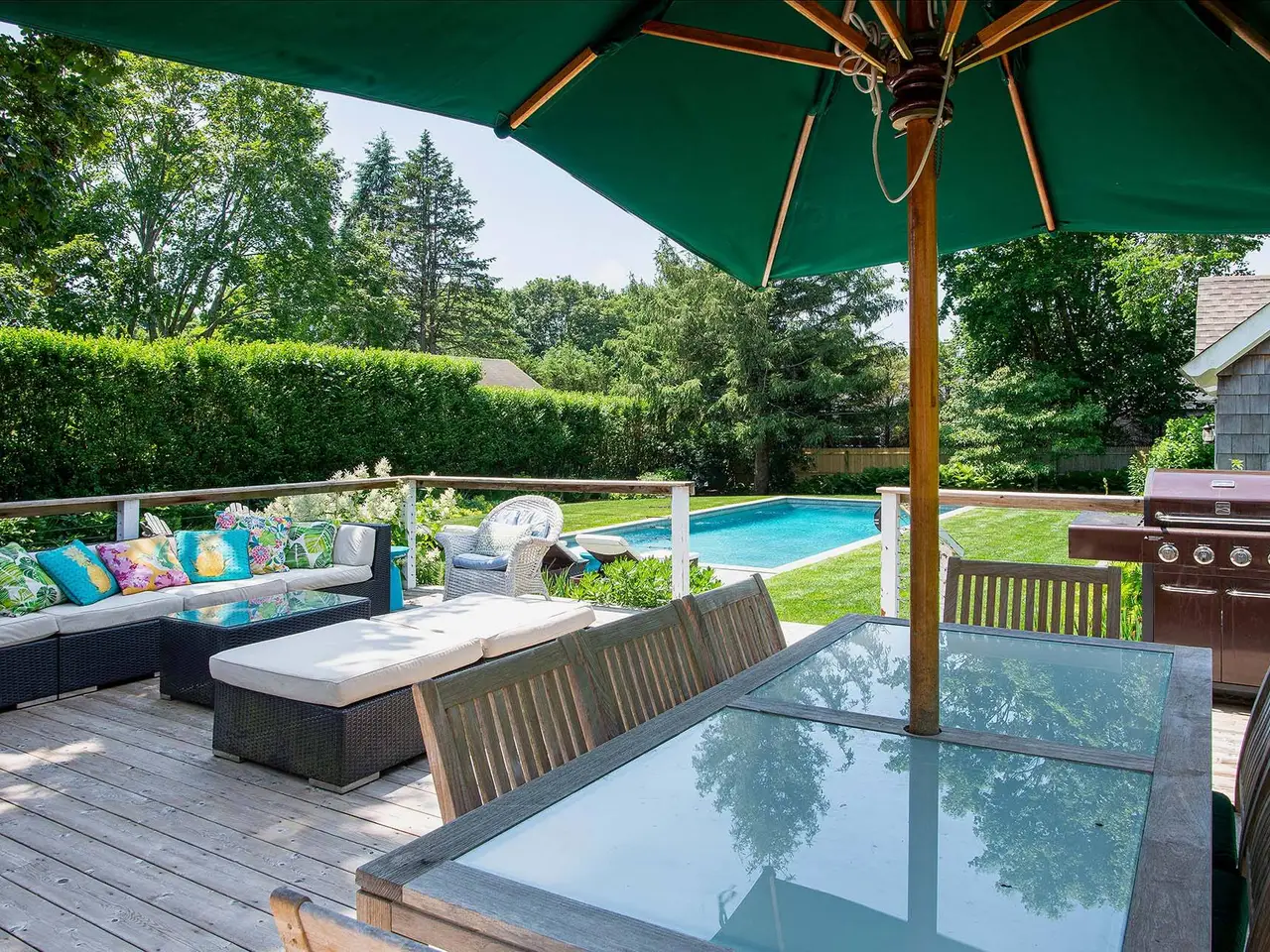 Beautifully renovated, this 19th century Cottage on Lumber Lane is a short distance to Main Street, LIRR and Jitney and offers four bedrooms, three baths in main and guest cottage, huge open kitchen with stainless appliances (including wine refrigerator) and marble counters, open living/dining room with walls of French doors, separate breakfast room, high ceilings, ebony stained hardwood floors, three full baths (two with walk-in showers with access to outdoor showers) and tons of windows which flood the house with sunlight all day. Two guest bedrooms and a full bath (with claw foot tub) on the first floor. The entire second floor is comprised of a huge Master Suite with a wall of closets, French doors, four exposures, high ceilings, marble en suite master bath with enormous walk-in shower (as well as private, rooftop outdoor shower) and double vanity. The separate three-room pool house (renovated 2020) has ample space, a full marble bath with a walk-in shower (and an outdoor shower), a kitchenette with ice maker, mini-refrigerator and beautiful views of the pool and gardens. The exterior spaces include an open front porch, huge backyard deck, outdoor entertainment areas (complete with gas firepit), an 18' x 36' heated gunite pool, bluestone terraces, a flat, fenced backyard with lush landscaped gardens, surrounded by 11-foot tall privacy hedges, forsythia, flowering plants, and native grasses! Ample parking, quiet neighbors.