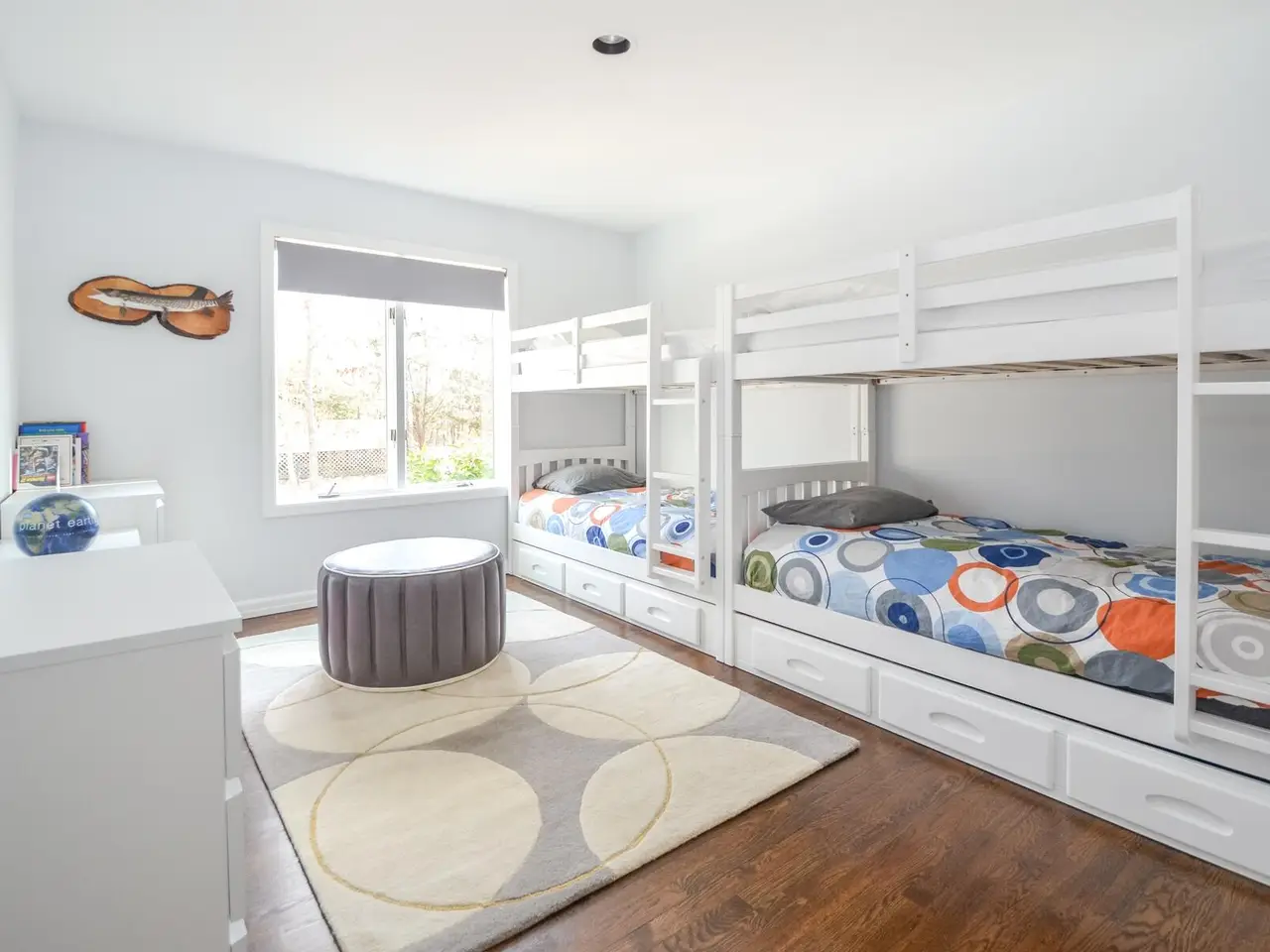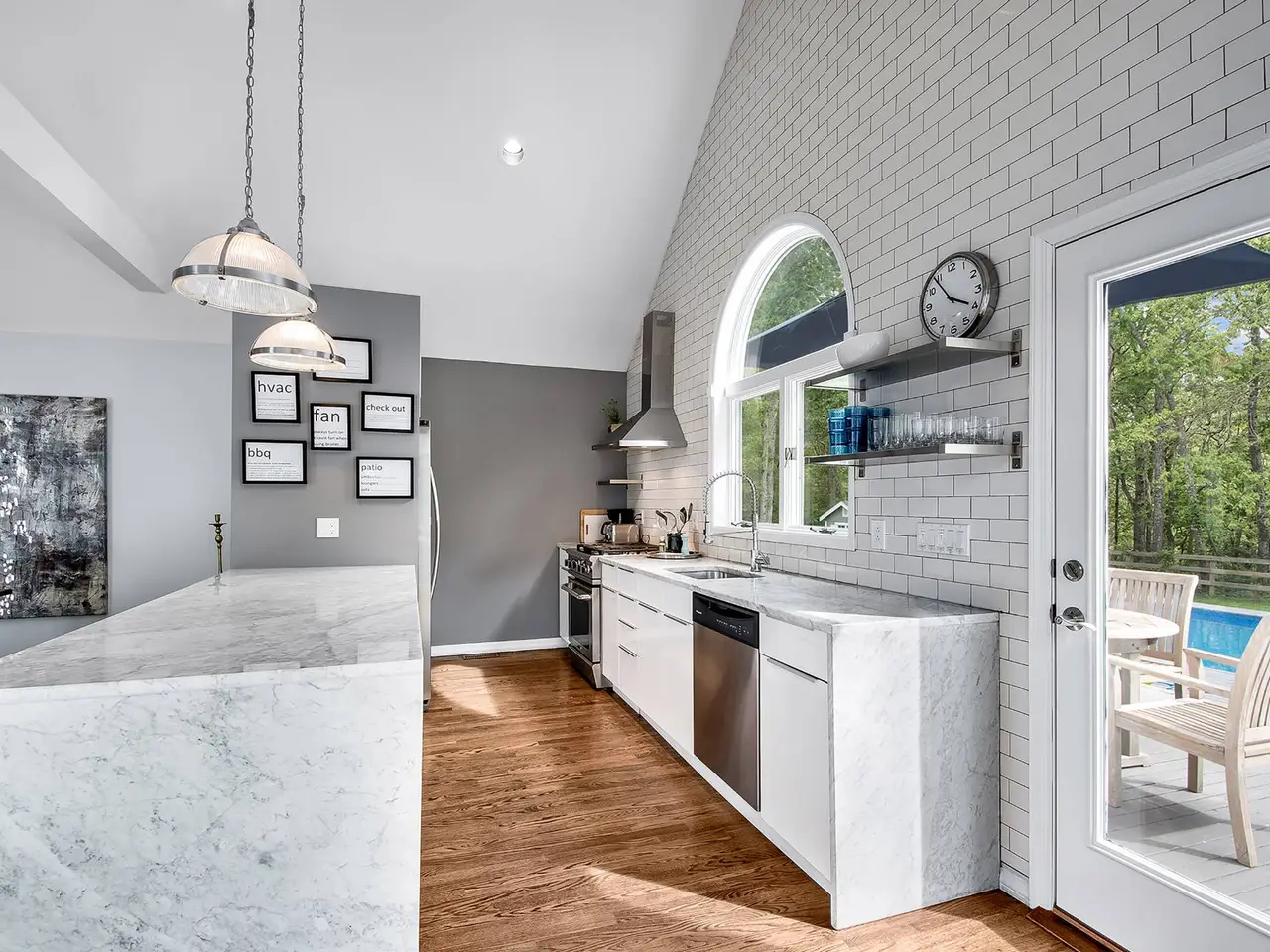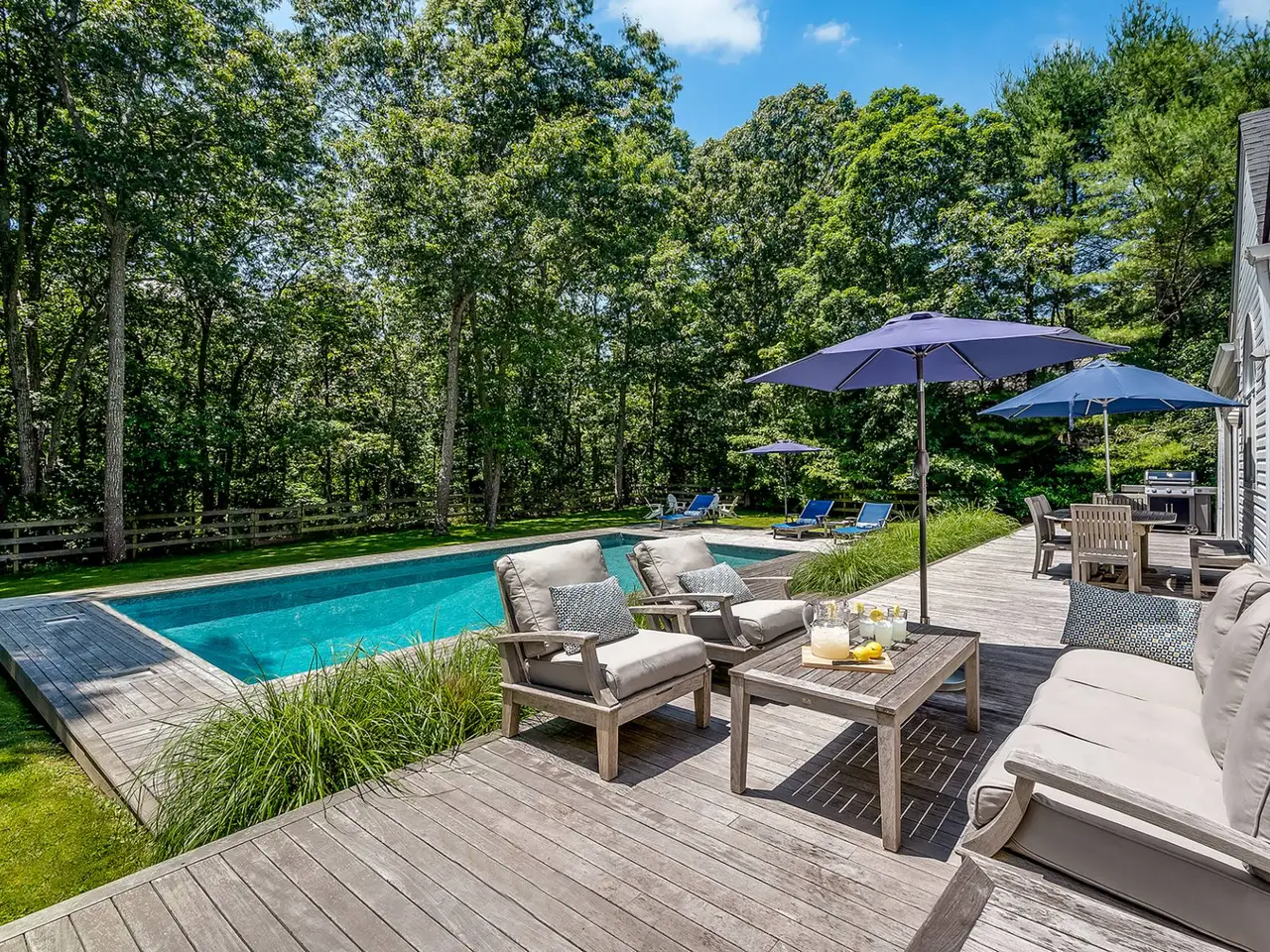 This designer home located in a private community situated minutes from Bridgehampton and Sag Harbor Villages features three bedrooms, three bathrooms, and open kitchen with an island and marble counters. The bathrooms have been completely updated with state-of-the-art finishes and fixtures and the light-filled space is complemented by vaulted ceilings, oversized windows, and sliding glass doors. Ideal for entertaining, this pristine home is decorated with muted grays, blues, and whites and will make an ideal summer retreat! Other features of this lovely home include: a fully equipped chef's kitchen with brand new appliances, central air conditioning, fire pit, heated salt-water pool with an option to add a child safety fence if needed. Located on a quiet cul-de-sac in a private community. Contact for more information.
