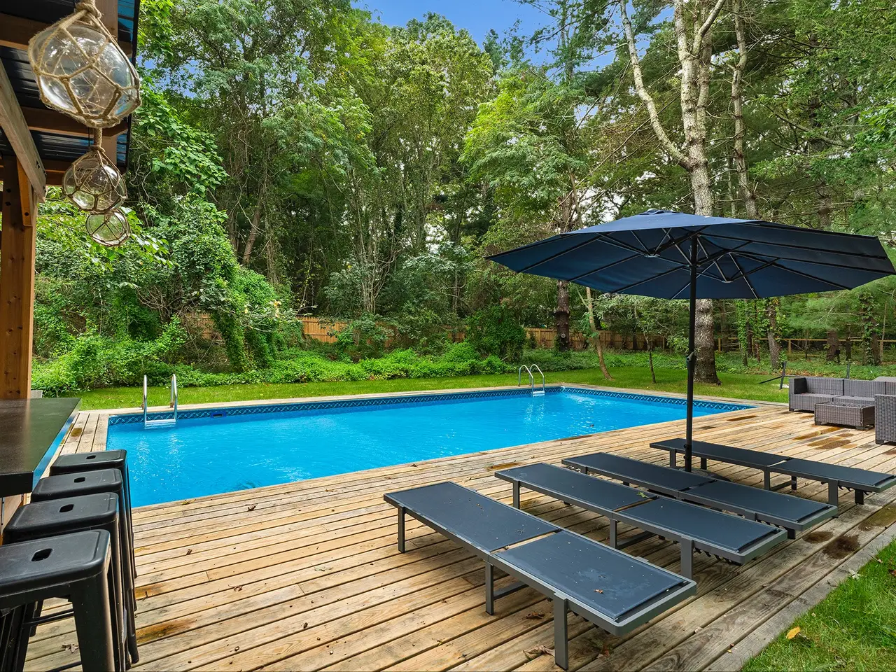 RR# RP250704 Secluded yet close to the Village, this split-level contemporary features four bedrooms and four baths. Living room with fireplace, sunroom, dining room, kitchen, extensive decking. The 20' x 40' pool is set amid the very private, wooded 2.8-acre property. .