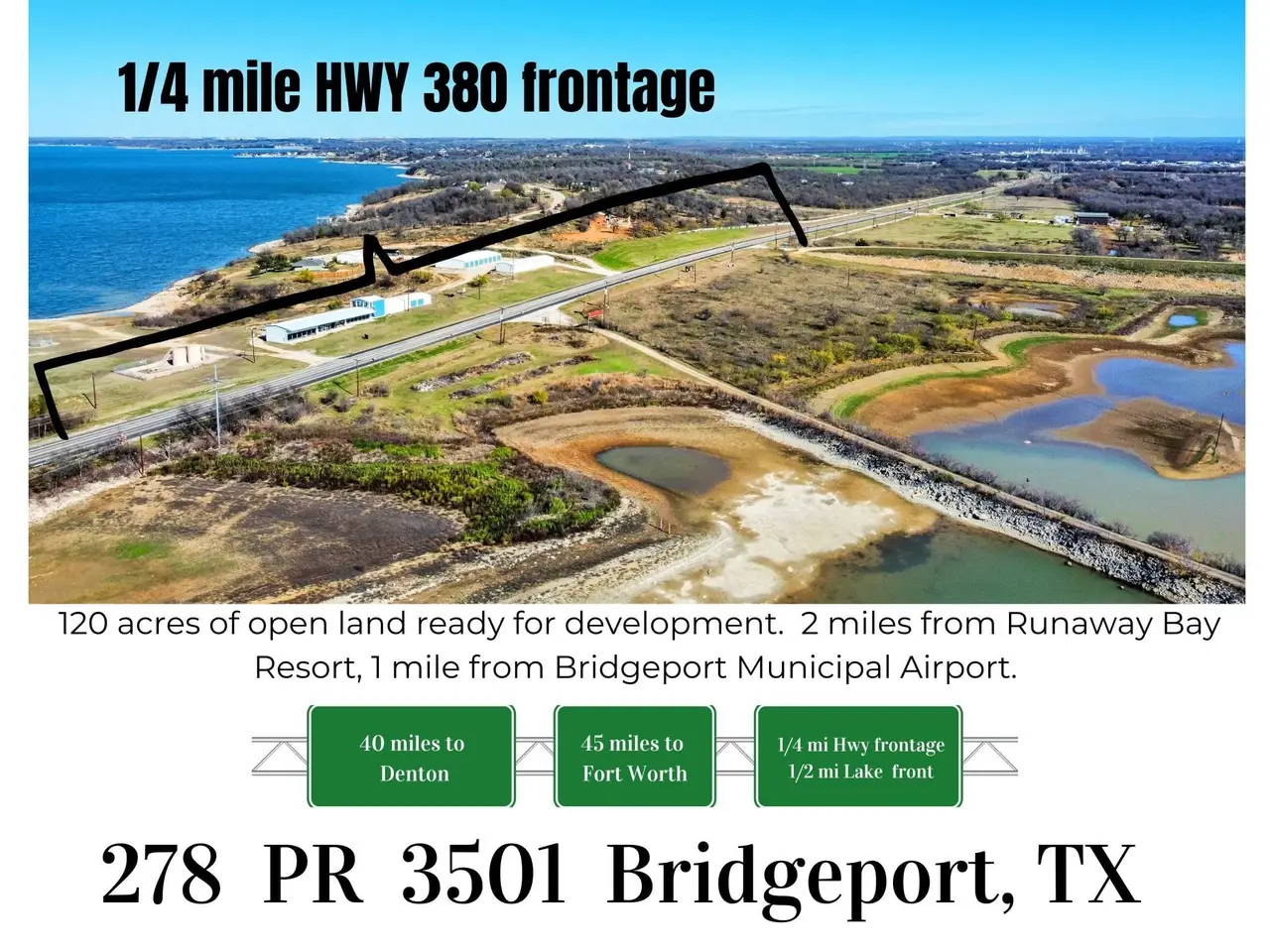 120 acres of open land ready for personal development, subdivision, or investment. Nestled just 45 minutes from Ft Worth, conveniently 1mile from Bridgeport Municipal Airport & 2 miles from Runaway Bay Marina Golf Club & Resort this gem boasts a half mile of Lake Front & quarter mile of Highway Frontage. Man made canal can allow developers to provide multiple lots with water access to Lake Bridgeport!
