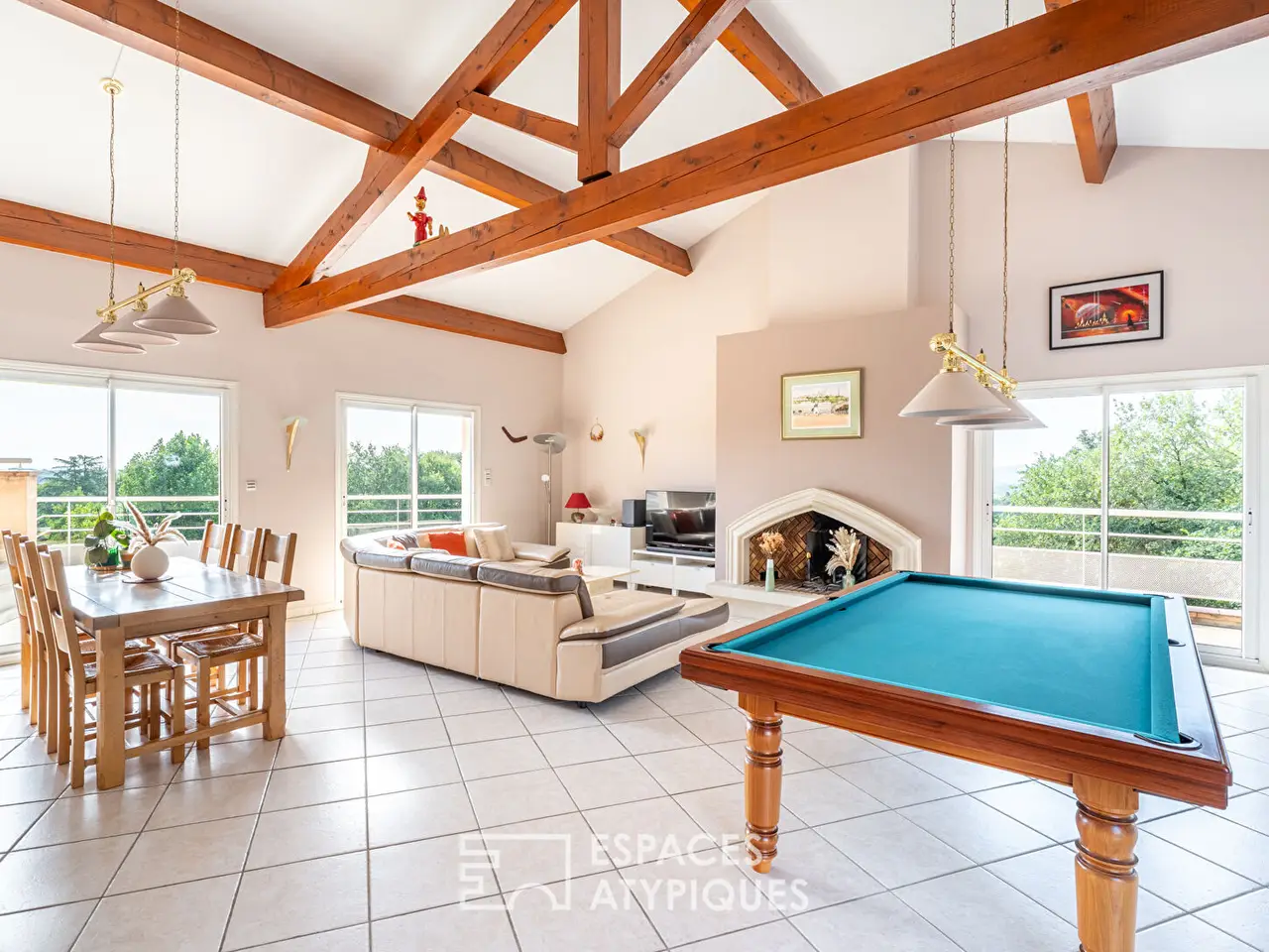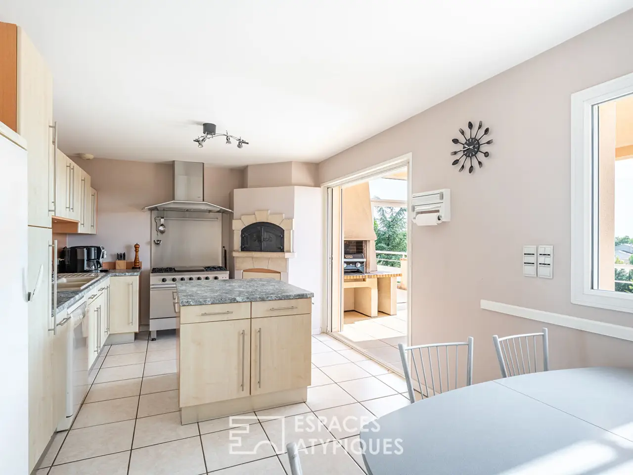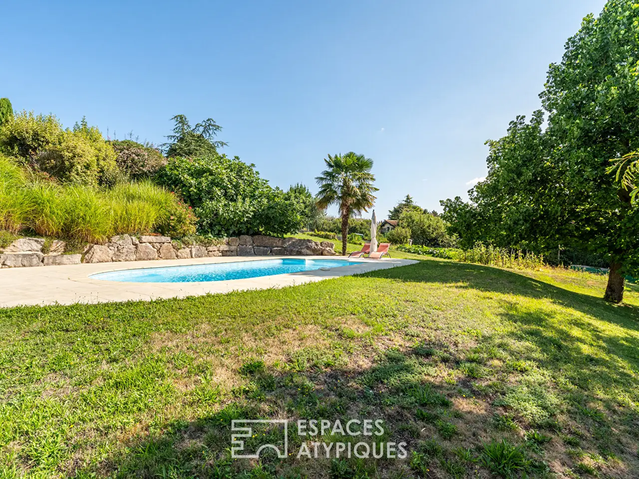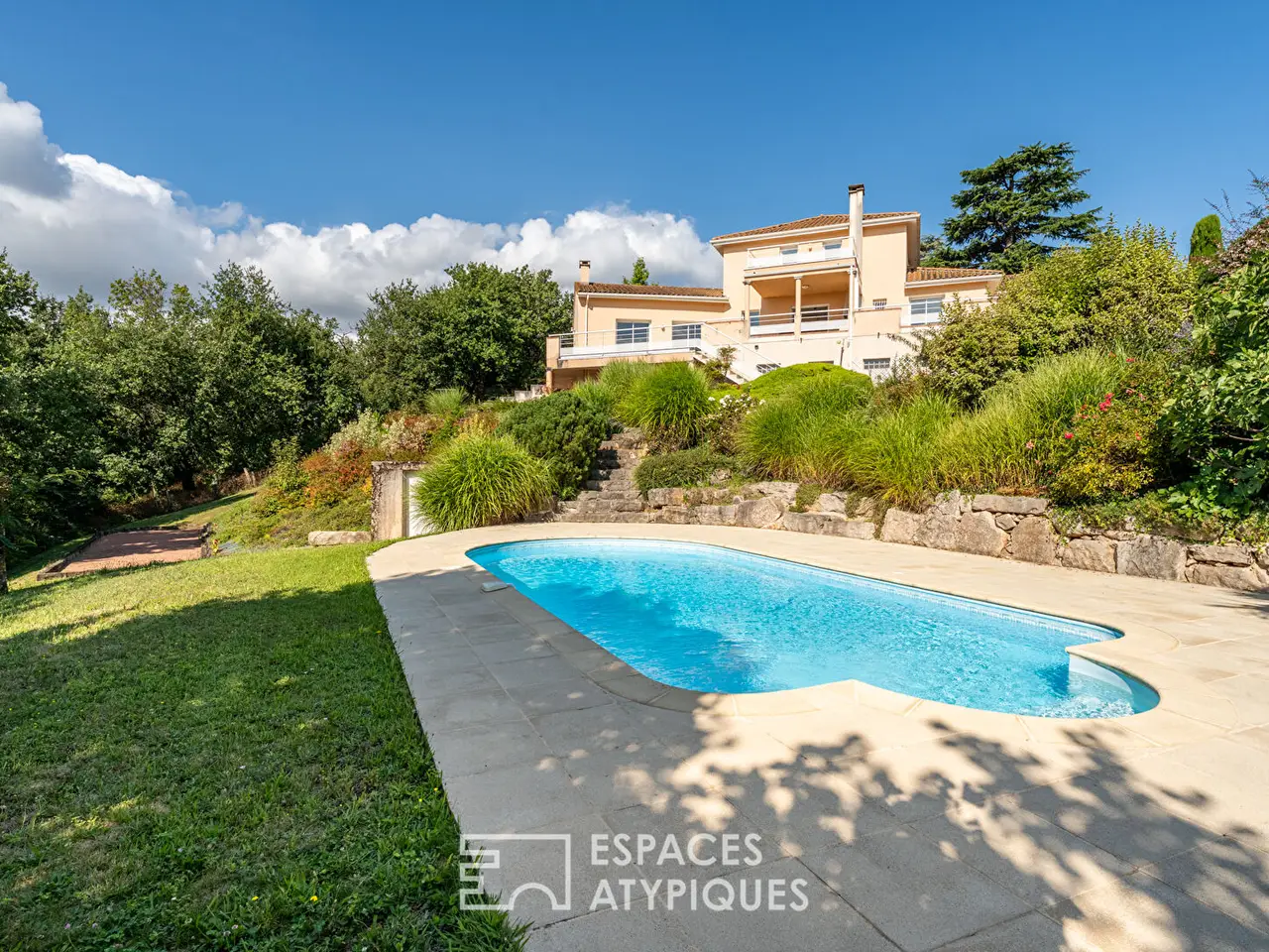 Located on the heights of Brignais, in absolute calm, this family home of 210sqm of living space is located on a landscaped plot of 3015sqm with a swimming pool. Upon entering, the gaze is drawn to a vast cathedral living room bathed in light, benefiting from a triple exposure that accentuates the feeling of space and clarity. The exposed framework and the fireplace bring an authentic charm to this living room with its generous volumes. Open to the dining room, the kitchen stands out as a true living space, designed to combine functionality and conviviality. It naturally extends to the outside thanks to a large bay window leading to the terrace, inviting you to fully enjoy the panorama. Its integrated pizza oven adds a warm touch, ideal for moments of sharing around generous meals. This level also includes an office space as well as two bright bedrooms, both open to the outside.One has an en-suite bathroom, while the other benefits from its own shower room, offering comfort suitable for family life or welcoming guests. A toilet is also located. Upstairs, three bedrooms complete the sleeping area: two of them share a common terrace, while the third has independent access as well as its own terrace. A shower room and a toilet complete this level.Below, an elegant wooded garden unfolds around a swimming pool nestled in a green setting, not overlooked. The unobstructed view of the surrounding countryside reinforces the impression of tranquility, just 20 minutes from Lyon. A well-kept vegetable garden and a petanque court complete this bucolic setting, designed to savor every moment in tune with nature.The basement of approximately 250sqm includes 5 garages, 3 of which are electrified. The ceiling height and its volumes allow for potential developments.The atypical character of this property lies in the rare combination of a preserved natural environment and architecture with unique volumes.A unique property, designed for those looking for a living space that is both spacious and connected to nature. Ideal for a family.ENERGY CLASS: C - CLIMATE CLASS: CEstimated average amount of annual energy expenditure for standard use, established from energy prices for the year 2021 / 2022 / 2023: between EUR2,240 and EUR3,350Contact: Emmanuel - 06 67 58 74 89REF. 12254-1Additional information* 7 rooms* 5 bedrooms* 1 bathroom* 2 shower rooms* Outdoor space : 3015 SQM* Property tax : 4 015 €Energy Performance CertificatePrimary energy consumptionc : 130 kWh/m2.yearHigh performance housing*A*B*130kWh/m2.year27*kg CO2/m2.yearC*D*E*F*GExtremely poor housing performance* Of which greenhouse gas emissionsc : 27 kg CO2/m2.yearLow CO2 emissions*A*B*27kg CO2/m2.yearC*D*E*F*GVery high CO2 emissionsEstimated average annual energy costs for standard use, indexed to specific years 2021, 2022, 2023 : between 2240 € and 3350 € Subscription IncludedAgency feesThe fees include VAT and are payable by the vendorMediatorMediation Franchise-Consommateurswww.mediation-franchise.com29 Boulevard de Courcelles 75008 ParisInformation on the risks to which this property is exposed is available on the Geohazards website : www.georisques.gouv.fr