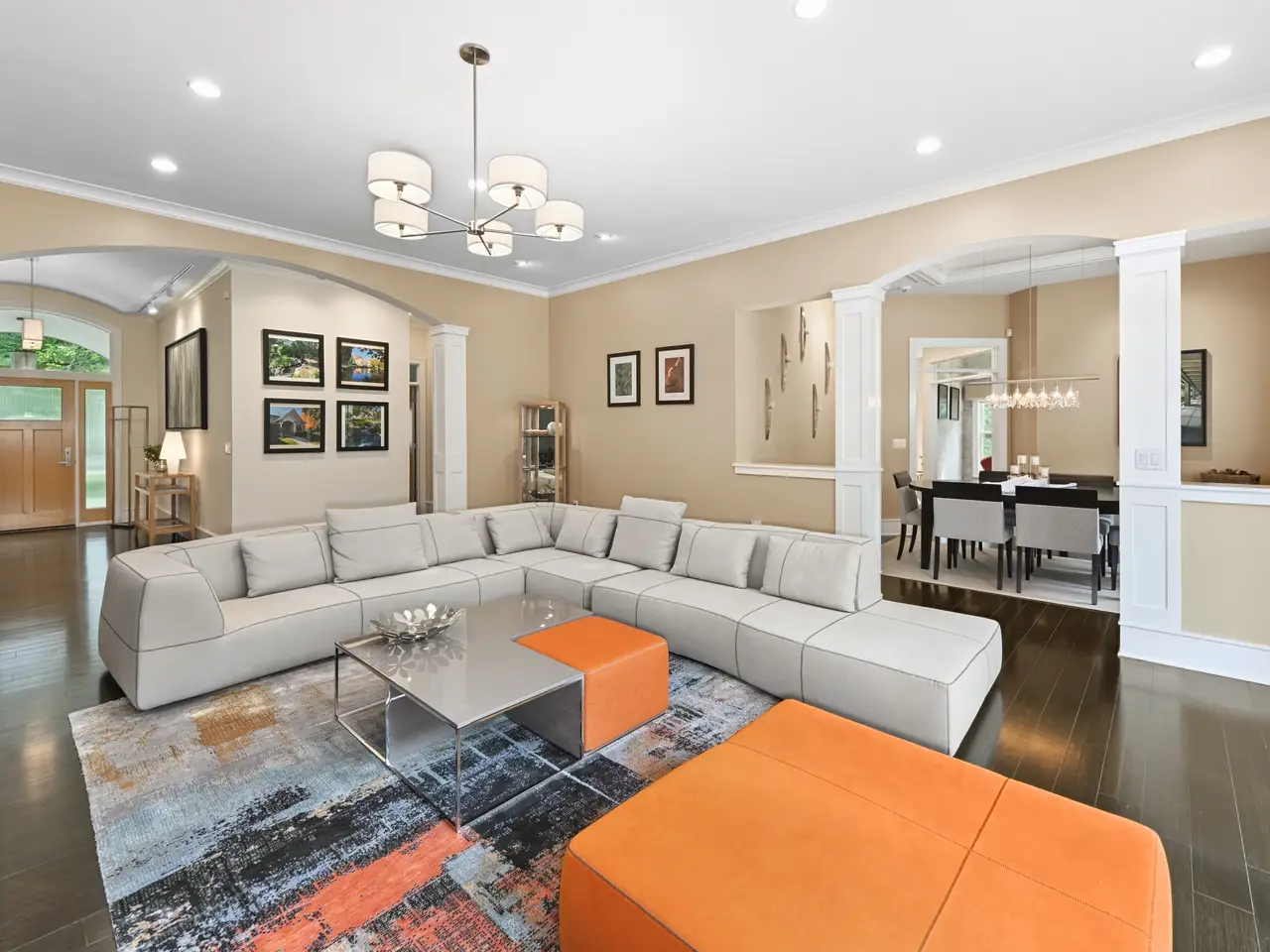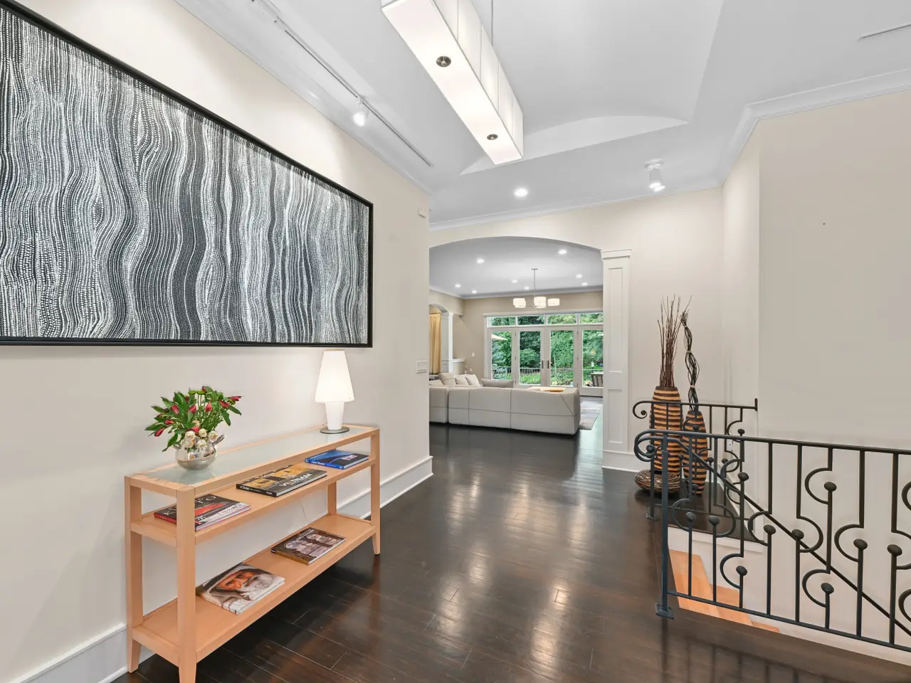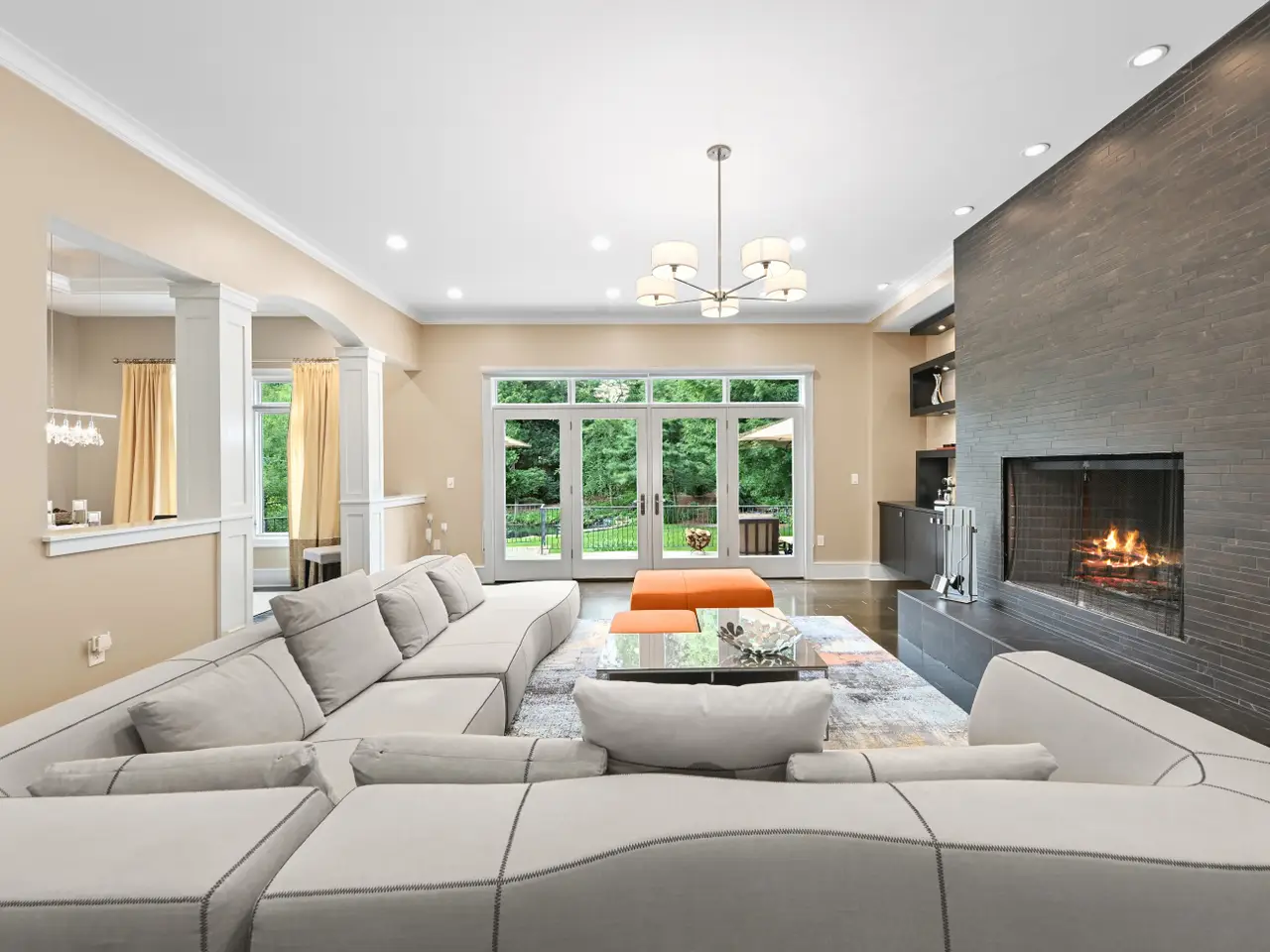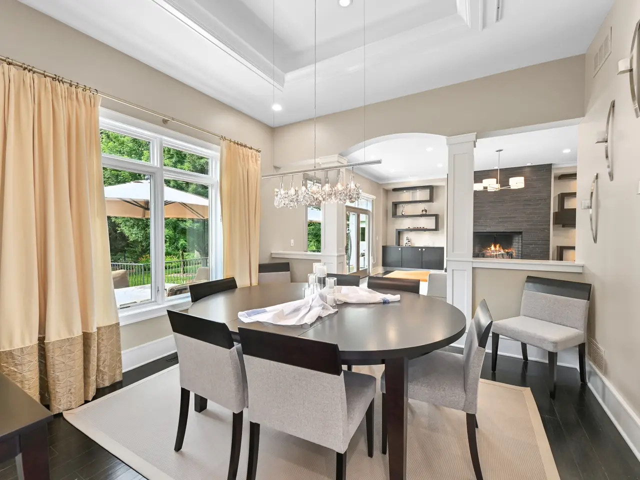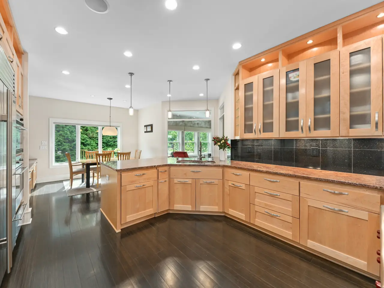 Welcome to a breathtaking living experience! Exquisite quality details throughout this smartly designed ranch with high and tray ceilings, transom windows, and striking finishes including bamboo floors, natural maple and oversized white trim. Upscale kitchen and dining - features Wolf/Sub-Zero appliances, perfect for hosting in the formal dining room. Entertain in the spacious great room with a natural fireplace and walkout to brick patio or relax in the bright sunroom overlooking the serene landscape. Spa-like prim suite offers a soak tub, oversized shower, heated floor and dual walk-in closets. Two additional bedrooms share a Jack and Jill bathroom. Half bathroom, butler prep and amazing laundry completes the main level. Lower level with daylight windows features rec area, fourth bedroom with full bathroom, office, flex room, and additional half bathroom. Heated garage with epoxy flooring has access to the lower level. Beautiful .96 acres with water features!