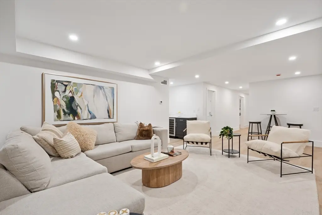 Welcome to this beautifully renovated 2025 Coolidge Corner unit, where timeless charm meets modern comfort. A welcoming mudroom opens to a sunlit kitchen with generous counter space, perfect for cooking together or hosting friends. The cozy family room with fireplace and a cheerful breakfast nook make the main level inviting, while a powder room adds convenience. A graceful curved staircase leads to a reading nook, laundry closet, and a serene primary suite with walk-in closet and ensuite bath featuring a double vanity. A second bedroom with its own ensuite completes this floor. The finished lower level offers flexible space for relaxation and fun with a rec room, wet bar, two bedrooms (one ensuite), and another full bath. Direct walk-out access leads to the patio, backyard and parking area. Move-in ready and filled with natural light, this home is designed for everyday living and entertaining, all just steps from BrooklineÆs cafTs, shops, schools, medical facilities and parks.