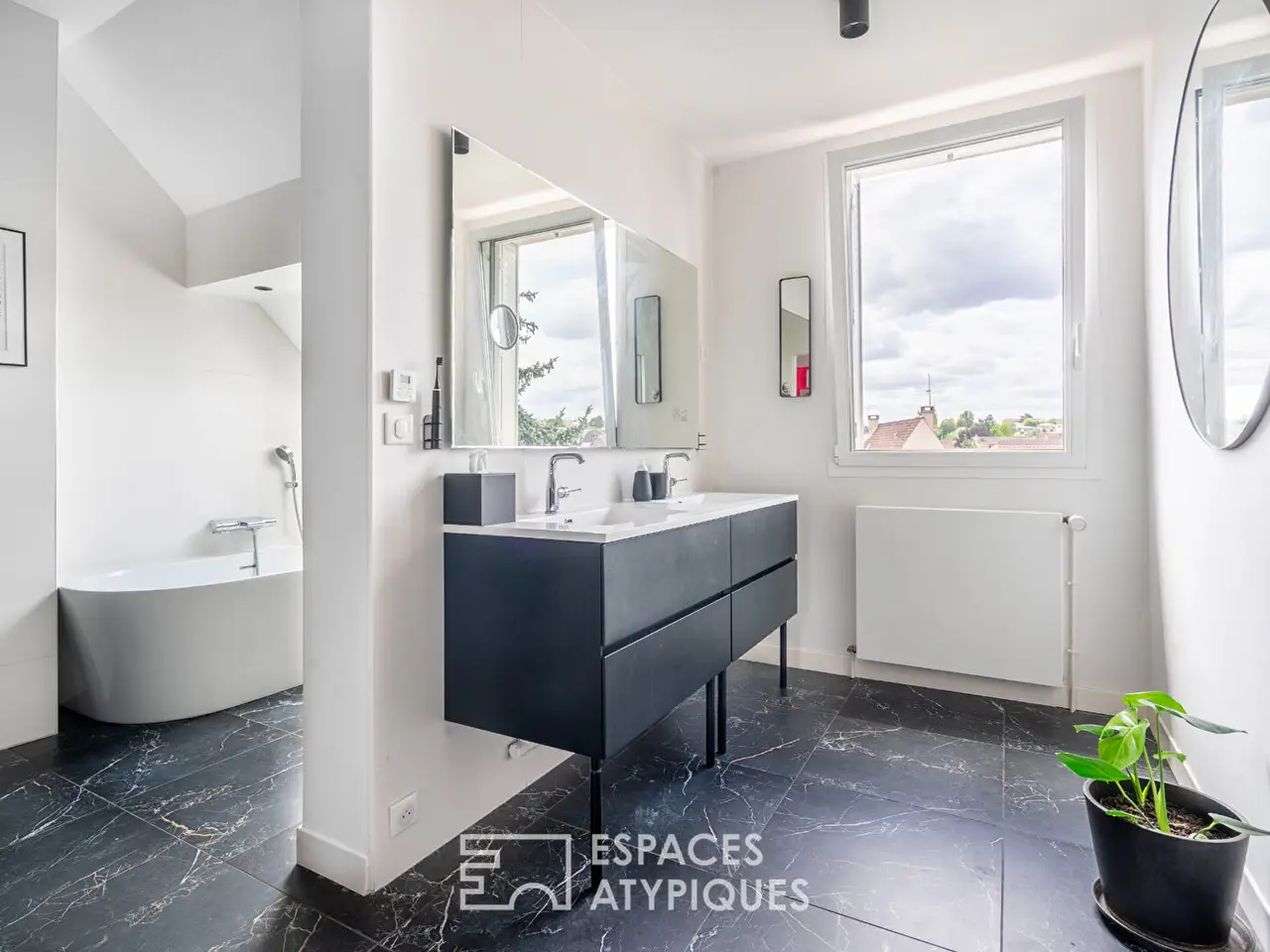 Located in the sought-after Pepiniere district, a stone's throw from the banks of the Marne, this house, built in 1969 and completely renovated in 2021, offers 305 sqm of living space on a 480 sqm plot. The heart of the house, the first floor captivates with a spectacular 75 sqm living room. Bathed in light thanks to its large bay windows, it is organized around a convivial kitchen, a dining room, and two living rooms, one of which features a gas fireplace. The whole opens onto a 20 sqm south-facing balcony, which further extends the already remarkable volumes. The ground floor sets the tone from the entrance, with a majestic hall of nearly 30 sqm, clad in marble and leading to an iron staircase adorned with gilding. This level opens first onto an office and then a dressing room, immediately revealing the generosity and multiplicity of spaces. A room currently converted into a games room with a toilet can easily be transformed into a bedroom opening directly onto the terrace. Finally, a summer kitchen used as a laundry room, also open to the exterior, completes this floor. An 18 sqm garage, suitable for a family vehicle and complemented by numerous storage spaces, completes this level. On the second floor, two bedrooms each have their own bathroom. A master suite, equipped with a dressing room and a bathroom with a bathtub and shower, offers an intimate and refined space. A separate toilet completes this level, while an attic of approximately 80 sqm offers additional development potential. The interior design, resolutely modern, gives each space a unique identity, the result of a renovation carried out with taste and rigor. Outside, a 400 sqm garden provides an ideal green setting for family life, just a few steps from the iconic promenades along the banks of the Marne. This house with its rare volumes, combining modern comfort, brightness and strong character, is an exceptional family home in one of the most sought-after areas of Bry-sur-Marne. Banks of the Marne: 2 minutes on foot School: 5 minutes on foot RER A Bry-sur-Marne: 15 minutes on foot REF. 12491 Additional information * 9 rooms * 4 bedrooms * 3 bathrooms * Outdoor space : 480 SQM * Parking : 2 parking spaces * Property tax : 4 406 € Energy Performance Certificate Primary energy consumption b : 98 kWh/m2.year High performance housing