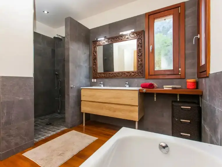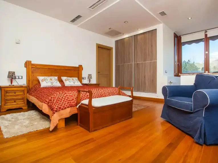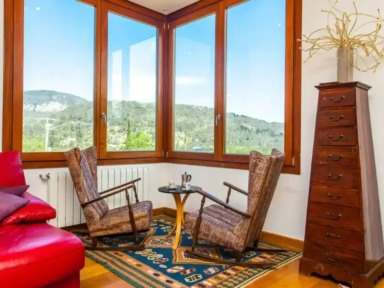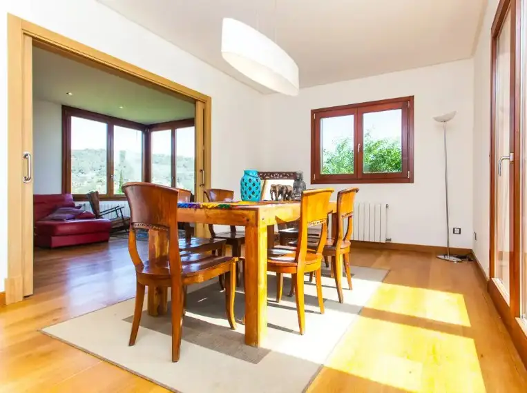 Situated on a gently sloping hill is this charming finca with fantastic views of the Tramuntana mountains and the magnificent surrounding landscape. Its environment enjoys an impressive peace and tranquility that invites you to relax deeply. However, it is only a few kilometers away from the center of Bunyola with its main square, cafes, restaurants with local gastronomy and stores. Palma can be reached in about 20 minutes by car and Bunyola in about 5 minutes. The house distributed over two floors has about 333 square meters built on a large plot of more than 14.000 square meters. It offers five spacious bedrooms, four bathrooms, two of them en-suite, sunny living-dining room, modern and equipped kitchen-dining room as well as a large south facing terrace, propane heating and pellet stove that give a warm and pleasant atmosphere in cold months. It also has centralized air conditioning system, high quality materials, wooden floors and large windows that provide the house with plenty of natural light. Outside, in a green garden there is a fabulous saltwater pool, ideal space to enjoy the sun and cool off. It also has a guest house with its kitchenette, a bathroom and bedroom. And it also enjoys a vacation rental license, which is a great plus, to complete this wonderful property. We invite you to visit this great finca, contact us!
