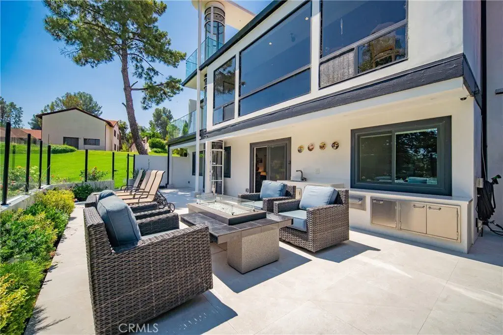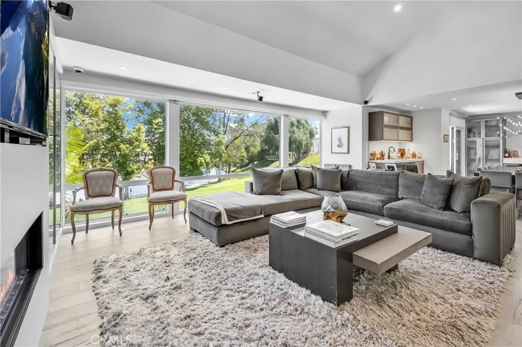 Welcome to this extraordinary lakefront estate tucked away on a quiet cul-de-sac in the coveted Calabasas Lake community. Fully reimagined and thoughtfully curated, this modern residence combines architectural sophistication with natural beauty, offering sweeping views of the lake and adjacent park as the perfect backdrop. Designed for refined living and entertaining, the home features an open floor plan ideal for hosting gatherings, enhanced by premium upgrades including new electrical and plumbing systems, Control4 smart home technology, and an elevator serving all three levels. The Bauformat German gourmet kitchen impresses with a porcelain-topped island, custom European cabinetry, two Miele dishwashers, dual Wolf ovens with induction range, microwave, warming drawer, and full-size Sub-Zero refrigerator and freezer. An elegant dining area with wet bar and dual wine refrigerators flows into the living and family rooms, where modern fireplaces, custom cabinetry, and expansive glass doors frame breathtaking views. The primary suite offers vaulted ceilings, skylights, a spa bath with steam shower, whirlpool tub, dual vanities, walk-in closet, and a terrace overlooking the lake and park. The lower level includes a media room, two bedrooms, full bath, laundry, and elevator access. A detached ADU with bedroom, bath, and separate entrance is perfect for guests, office, or live-in staff. Outdoors, a private walled yard surrounds the heated pool with waterfall, firepit lounge, and full kitchen with sink, warming oven, and refrigerator. Premium upgrades include a paid solar system, Lutron lighting with alarm integration, keyless entry, advanced camera security, modern glass staircases, wide illuminated steps, new wood flooring, Venetian plaster powder room, custom Stereo cabinetry, three-zone HVAC, black glass garage doors, and pivot entry. Multiple balconies and terraces embrace the lakefront lifestyle. Rarely does a home of this caliber, combining modern design, prime location, and flawless execution, come to market. This residence is more than a home, it is a private retreat offering elegance, innovation, and serene luxury in the heart of Calabasas.