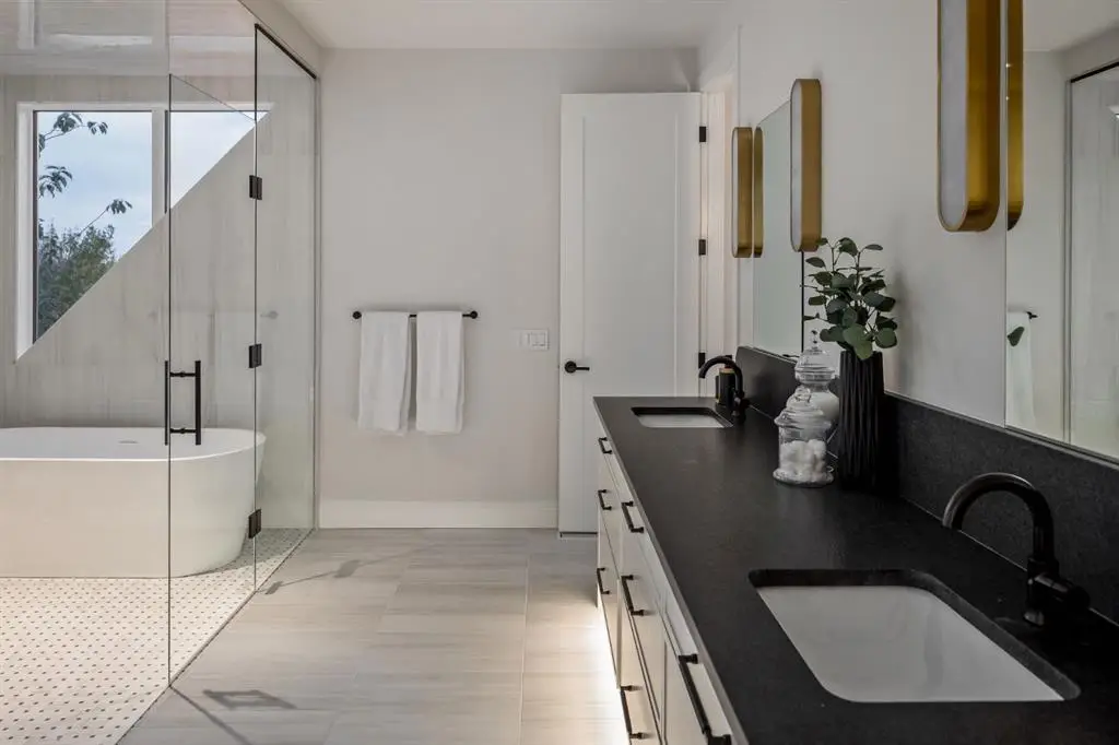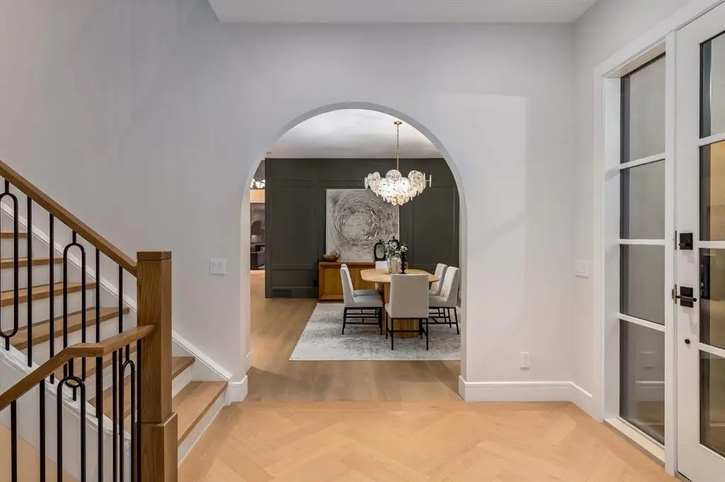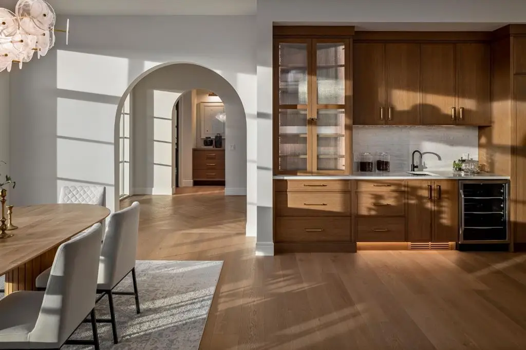 Homes on this exclusive ridge rarely come to market, and this breathtaking two-storey estate is a shining example of elevated inner-city living. With 5,545.89 sq.ft. of exquisitely developed space, this 6 bedroom, 5.5 bath residence blends refined craftsmanship with functional luxury; set against a backdrop of sweeping valley and park views. Step inside to soaring ceilings, pristine engineered hardwood floors, and custom archway details that frame each thoughtfully designed space. The heart of the home begins in the sunlit dining area, perfect for hosting epic dinner parties, and highlighted by west-facing triple-glazed LUX windows. The adjacent chef’s kitchen impresses with stainless steel integrated appliances, including a Wolf gas cooktop, double wall ovens, classic white shaker cabinetry, and a hidden butler’s pantry for discreet prep and storage. The expansive great room invites relaxation with vaulted ceilings and a cozy microcement faced gas fireplace, opening directly to a sunny south-facing deck overlooking endless green space. A main floor guest suite (or executive office) with a private ensuite, a designer powder room, and a spacious mudroom with built-ins complete this level. The fully insulated triple car garage is EV-ready and lift-kit friendly, marrying form and function. Upstairs, a serene primary retreat features elegant vaulted ceilings, a custom walk-in closet, and a spa-inspired 5-piece ensuite with a soaker tub, dual vanities, and a glass shower with bench and niche. Three additional bedrooms (one with an ensuite), an upper laundry room with sink and storage, and a charming library nook provide comfort and convenience for the entire family. The fully developed basement is an entertainer’s dream: featuring a large media lounge, games area, wet bar with brick backsplash and undermount lighting, and a high calibre wine room that secretly accesses the highly systemized maintenance room. A versatile home gym, sixth bedroom with walk-in closet, and additional full bathroom on this level ensure guests feel at home. Noteworthy highlights include: Hydronic in-floor heat in the basement; 2 High-Efficiency furnaces & A/C units; built-in speakers throughout; and quartz countertops in all bathrooms. Located minutes from the University of Calgary, Foothills Hospital, and local shops and restaurants, this timeless home sits in a top-tier school catchment and offers quick access to major routes while maintaining a tranquil, park-like setting. A truly unique opportunity to own a well-appointed, move-in ready home in one of the city’s most prestigious enclaves.