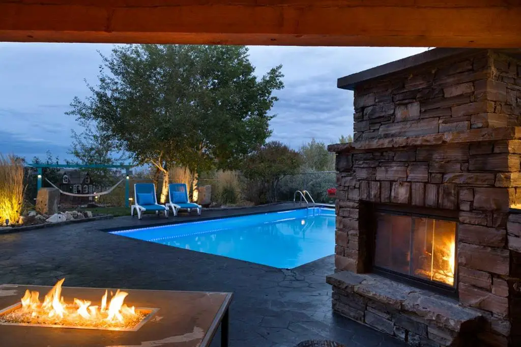 Covered outdoor living area with dual wood/gas fireplace